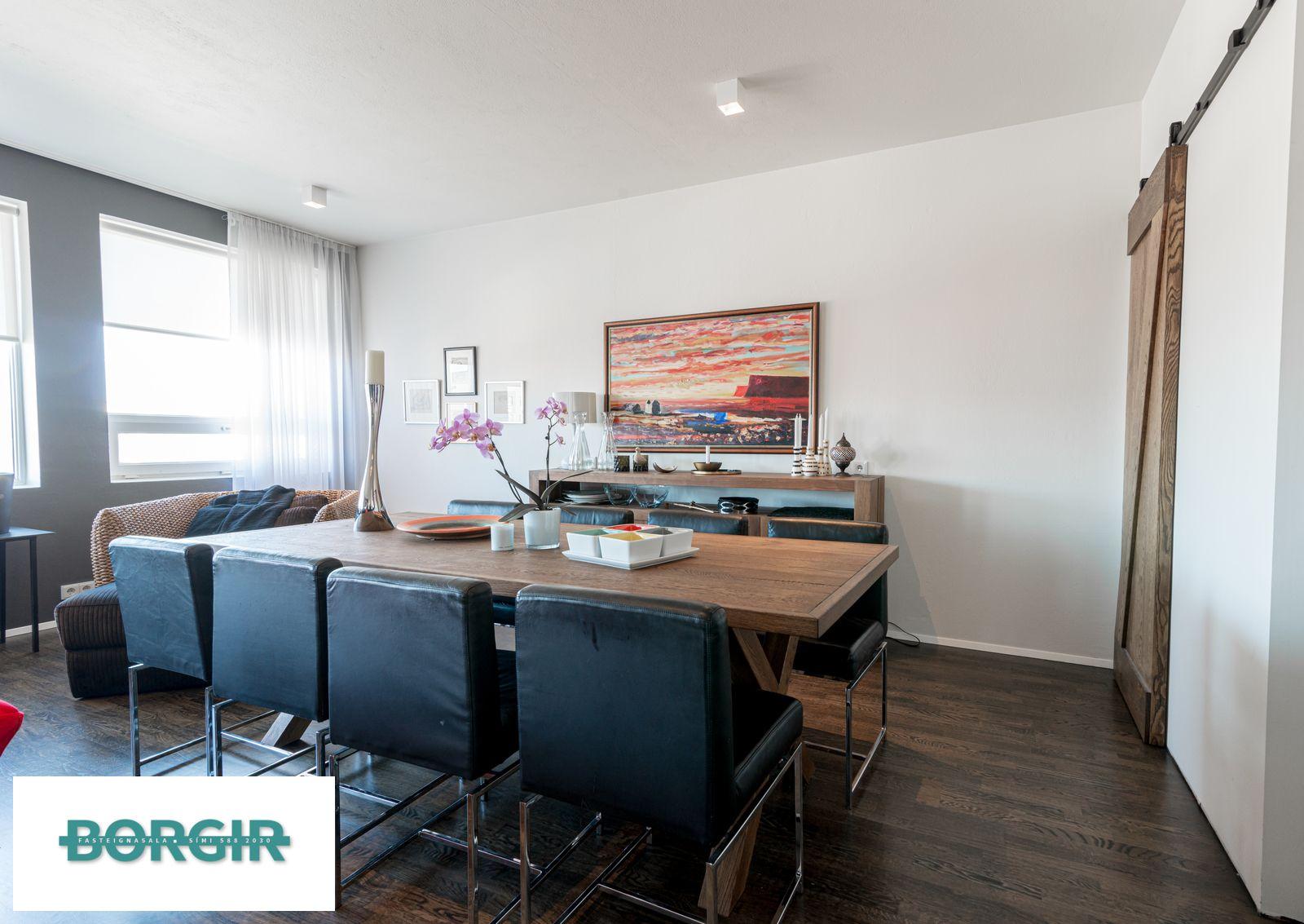 Barborð, borðstofuborð og rennihurð í búr á eldhúsi er í stíl, unnið úr sama viðarefninu.