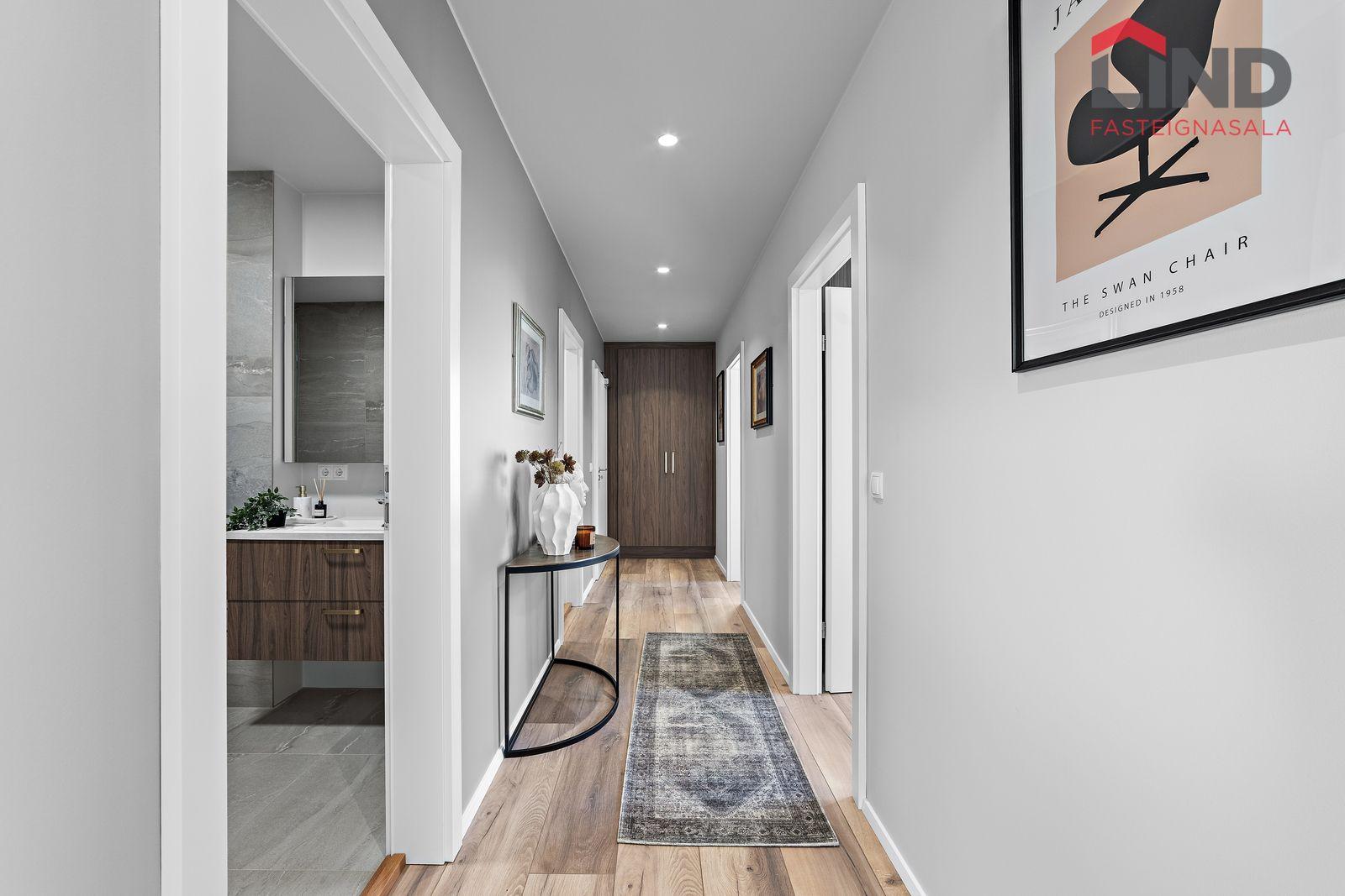 ** Baðherbergi: Baðinnrétting kemur frá Axis. Hreinlætistæki og handklæðaofn eru frá Byko. Salernið er upphengt og innbyggt. Hitastýrð blöndunartæki verða við sturtu. Gólf eru flísalögð og veggir að hluta upp í loft