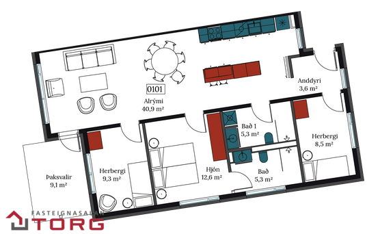 Alrými með stofu og eldhúsi, innréttingar í eldhúsi eru frá HTH innréttingum eða sambærilegum, hvítar og ljós-ask litaðar. Spanhelluborð, gufugleypir/eyjuháfur, ísskápur og innbyggð uppþvottavél frá AEG eða sambærilegu. Vönduð blöndunartæki.
