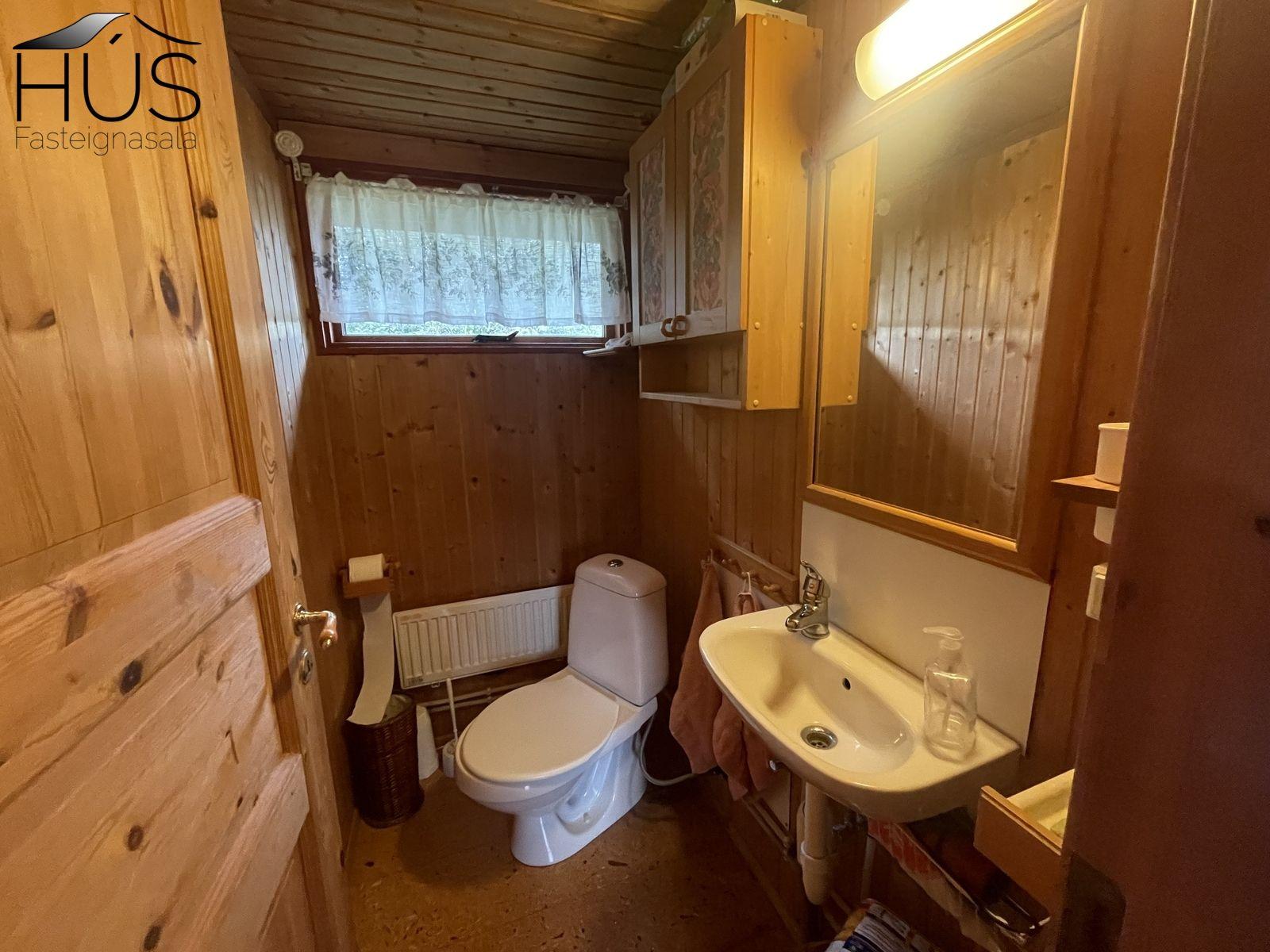 Bústaðurinn: Að utan er húsið klætt með standandi timburklæðningu. Á þaki er bárujárn sem var endurnýjað árið 2016. Húsið er upphitað með rafmagnsþilofnum. Hitakútur er fyrir neysluvatn. Kalt vatn er fengið frá Vatnsveitu Flóahrepps. Bústaðurinn er mjög snyrtilegur. Innra rými. Forstofa, tvö svefnherbergi annað með kojum og hitt með rúmi og skáp. Salerni. Stofa og eldhús sem er opið í eitt. Í eldhúsi er snyrtileg innrétting. Í stofu er kamína. Að innan er húsið klætt með panil. Loft eru upptekin. Á gólfum er spónaparket. Allt innbú utan persónulegra muna getur fylgt. Búið er að breyta gluggum þannig að settir hafa verið neyðarútgangar.