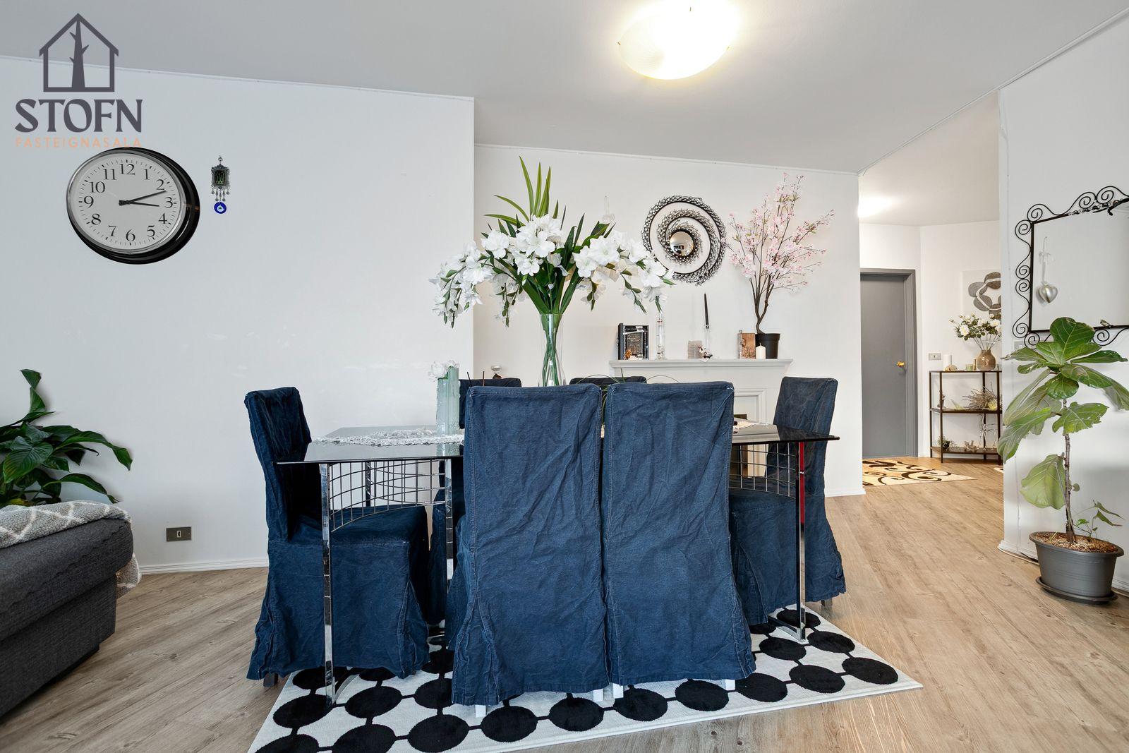 STOFN FASTEIGNASALA KYNNIR: Um er að ræða rúmgóða 175,2 fm 4ra herbergja íbúð á þriðju og efstu hæð í snyrtilegu fjölbýli ásamt tveimur bílskúrum þar sem búið er að útbúa snyrtilega stúdíó íbúð úr öðrum bílskúrnum (33,8 fm). Báðir bílskúrarnir eru í útleigu. Íbúðin hefur fengið gott viðhald á undanförnum árum þar sem meðal annars er búið að skipta um glugga og gler í hluta íbúðar og sömuleiðis búið að skipta um hluta ofna innan íbúðar.