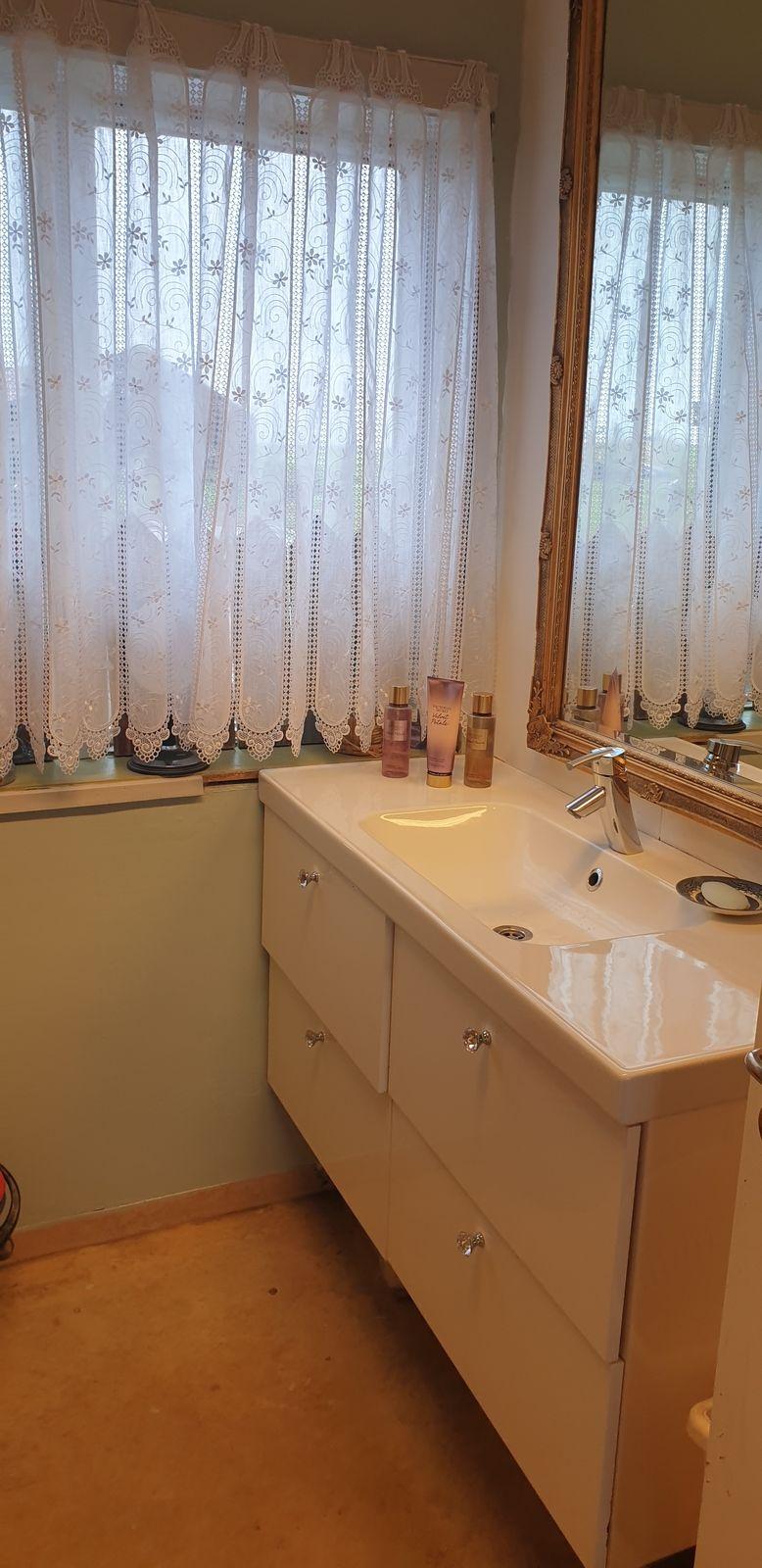 Baðherbergi : sturta og hvít innrétting. Með dúk á gólfi