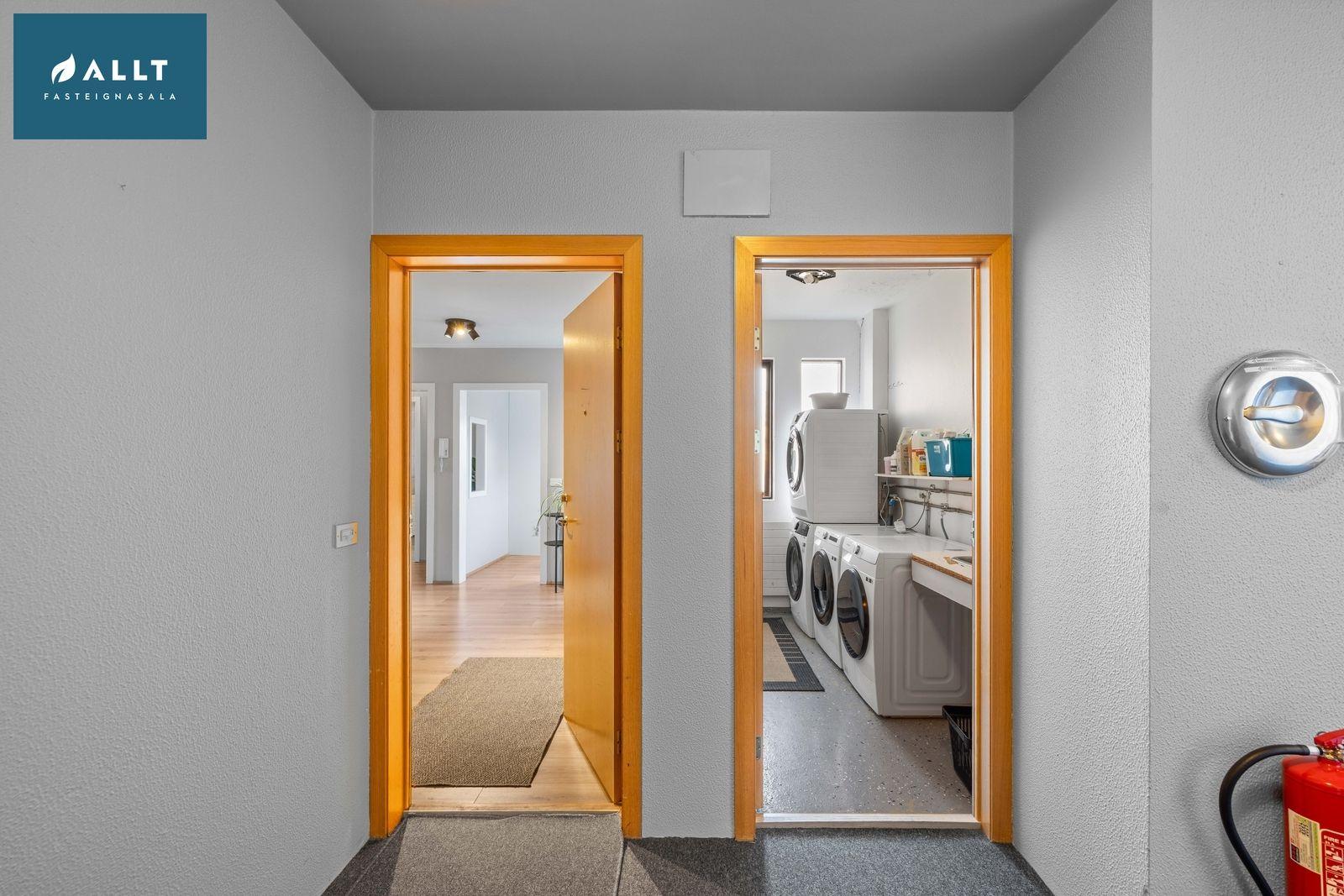 Þvottahús og geymsla: Á jarðhæð við hlið íbúðar er þvottahús sem er sameiginlegt með annarri íbúð, geymslan er til móts við íbúðina, er rúmgóð með hillum.
