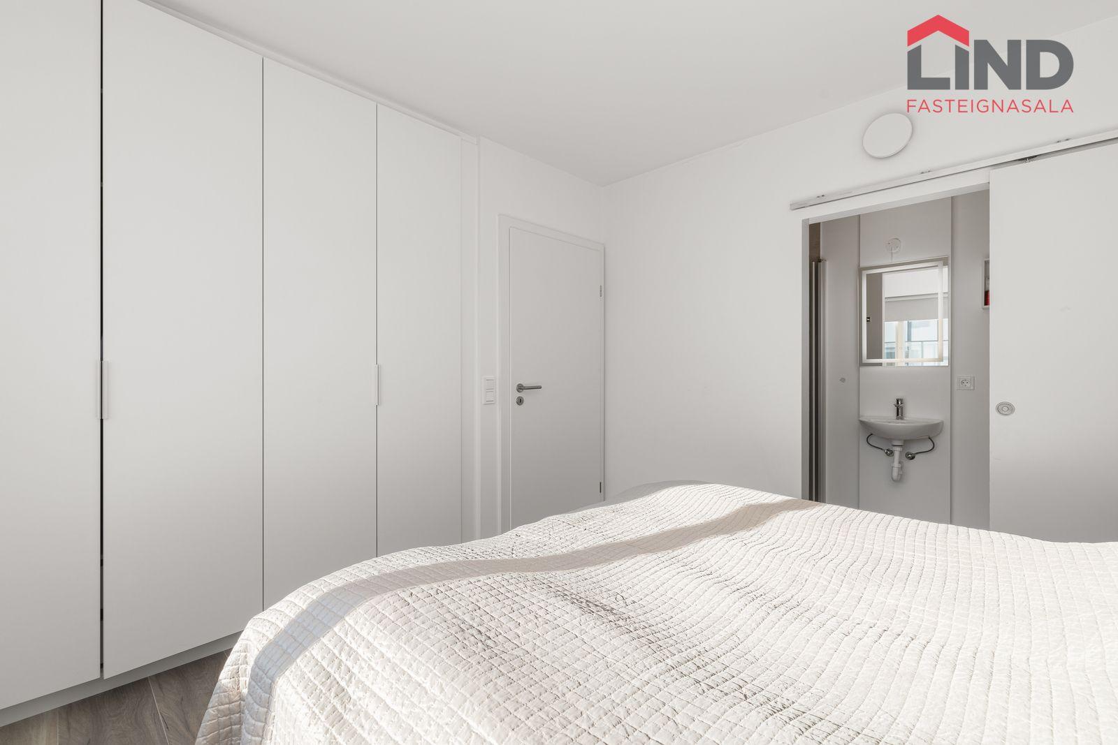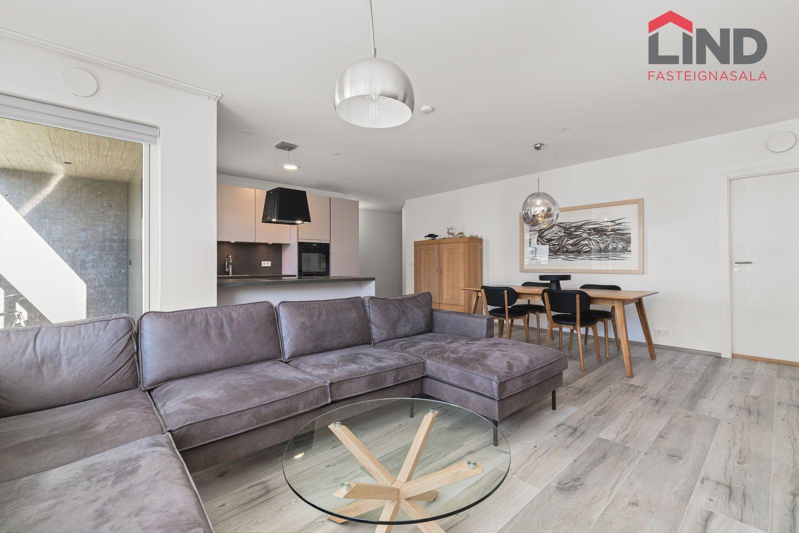 Íbúðin er með rúmgóðu alrými sem myndar stofu/borðstofu og eldhús með eldhúseyju. Þrjú svefnherbergi eru í íbúðinni, tvö baðherbergi og þvottaherbergi. Sér bílastæði í lokuðum bílakjallara á góðum stað. Útgengi úr stofu á svalir sem snúa til suðurs. Stór 18,6 fermetra sérgeymsla í kjallara og sameiginleg hjóla- og vagnageymsla.