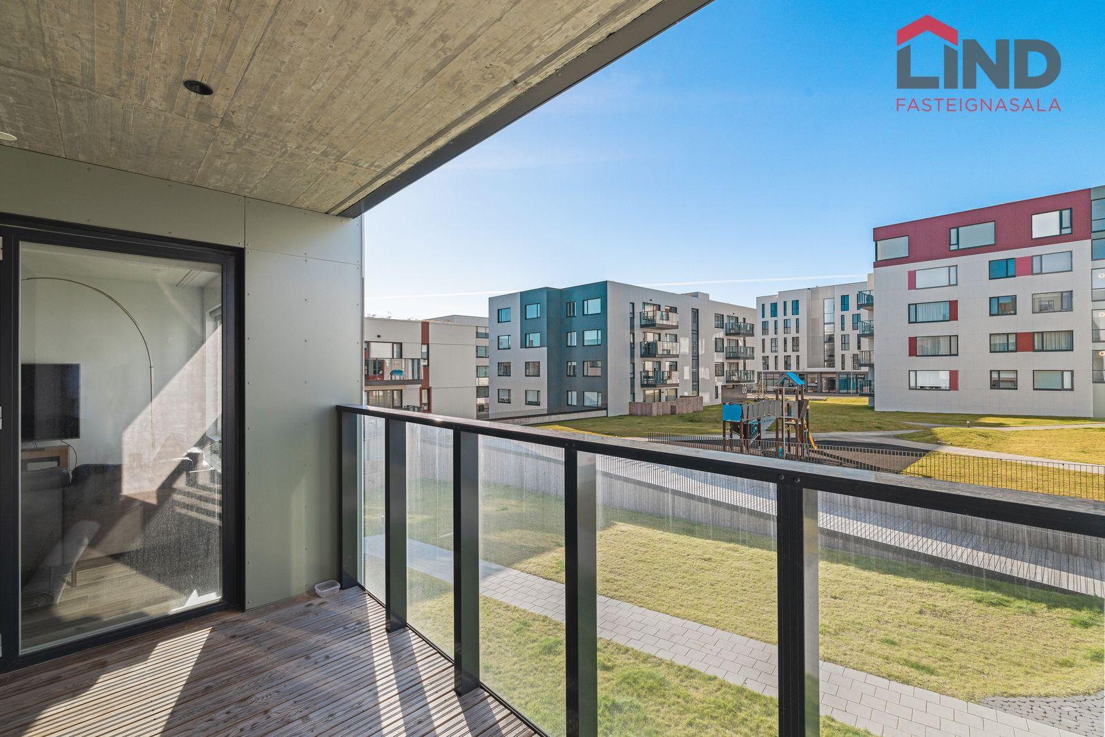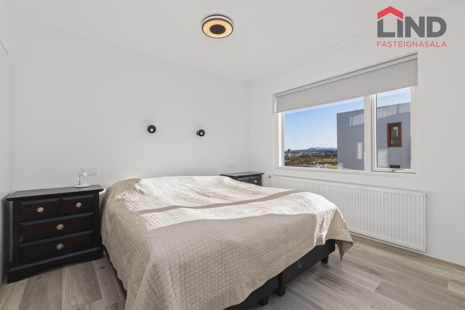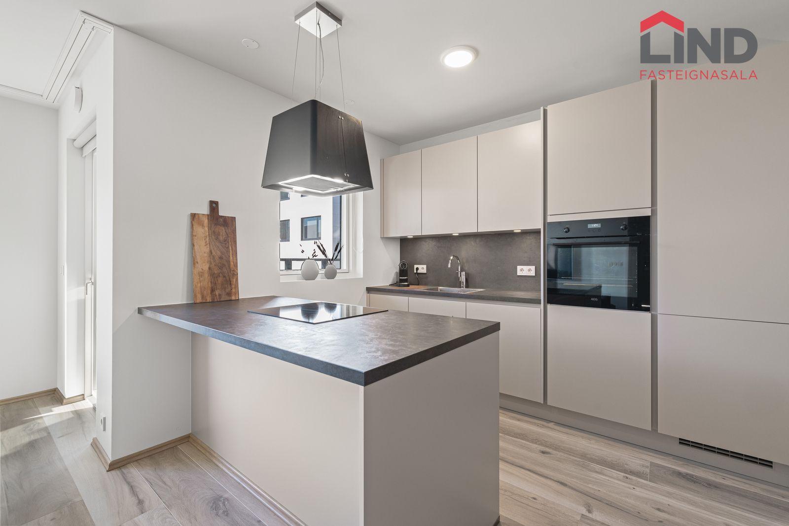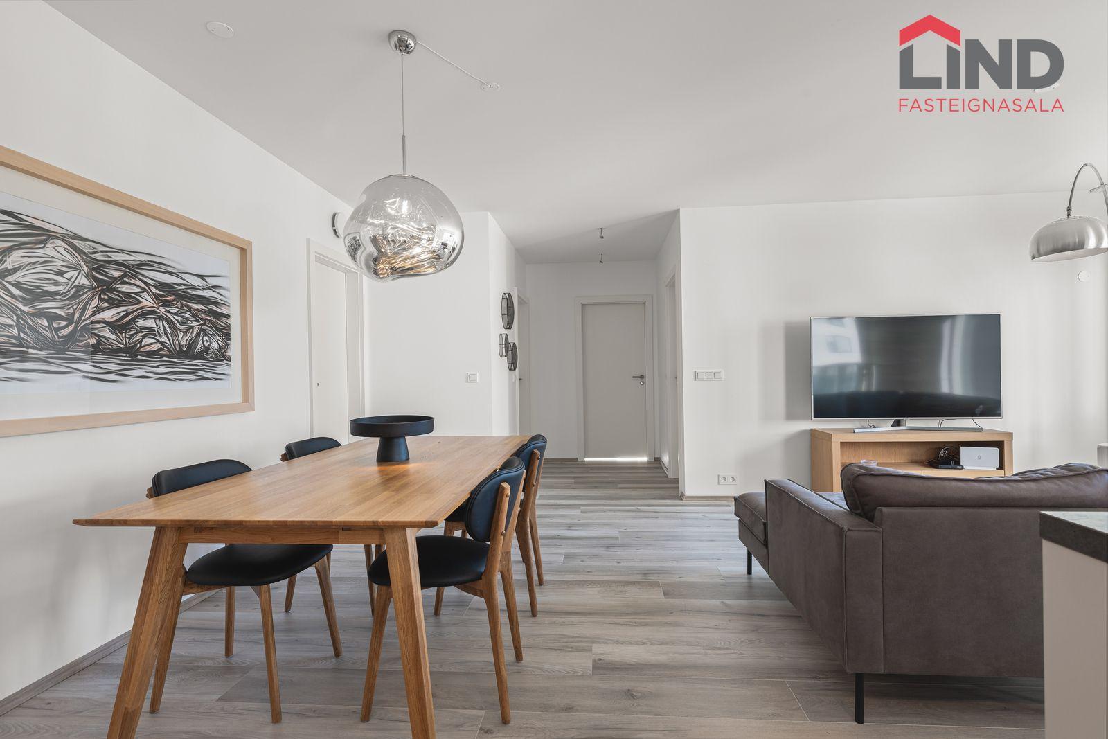 Nánari lýsing: Forstofa: Með harðparketi á gólfi og skápum. Stofa: Með harðparketi á gólfi og gluggum til suðurs. Stofa rúmar vel setustofu og borðstofu. Stofa er opin við eldhús og með útgengi á svalir. Svalir: Eru skjólgóðar og snúa til suðurs inn í bakgarð hússins. Svalagólf með harðvið á svalagólfi og innfelldri lýsingu í skyggni. Eldhús: Með fallegri innréttingu frá Nobilia (GKS) og eyju. Bakaraofn, spansuðuhelluborð, innbyggð uppþvottavél og eyjuháfur. Stýranleg led-lýsing undir efri skápum. Baðherbergi I: Með flísum á gólfi og hluta veggja. Flísalögð sturta með glerþili og innrétting við vask með speglaskáp fyrir ofan. Handklæðaofn, upphengt salerni og útloftun. Þvottaherbergi: Með flísum á gólfi, tengi fyrir þvottavél og þurrkara og útloftun. Hjónaherbergi: Með harðparketi á gólfi, skápum og gluggum til austurs. Svefnherbergi II: Með harðparketi á gólfi, skápum og glugga til austurs. Svefnherbergi III: Með harðparketi á gólfi, skápum og glugga til suðurs.