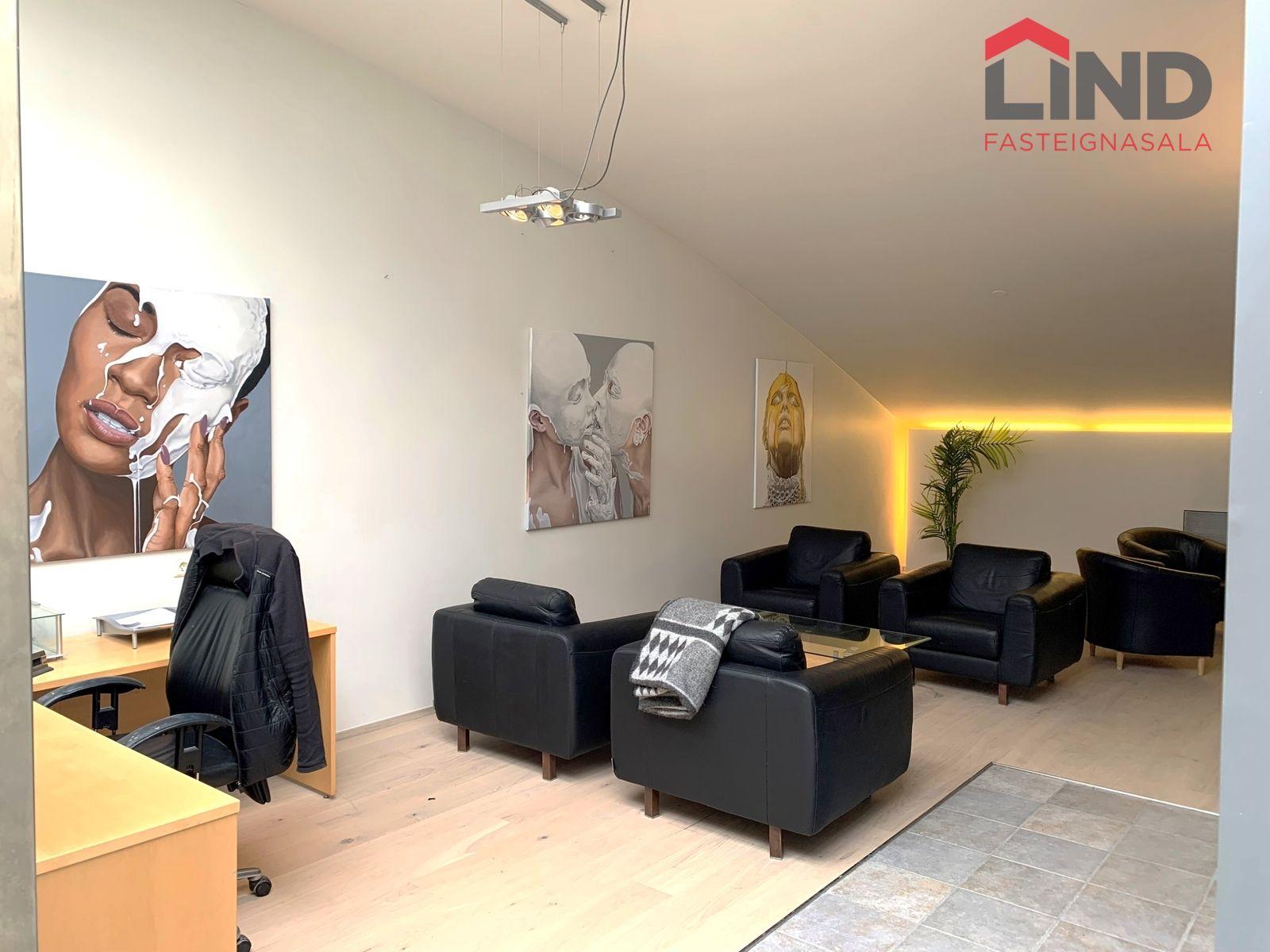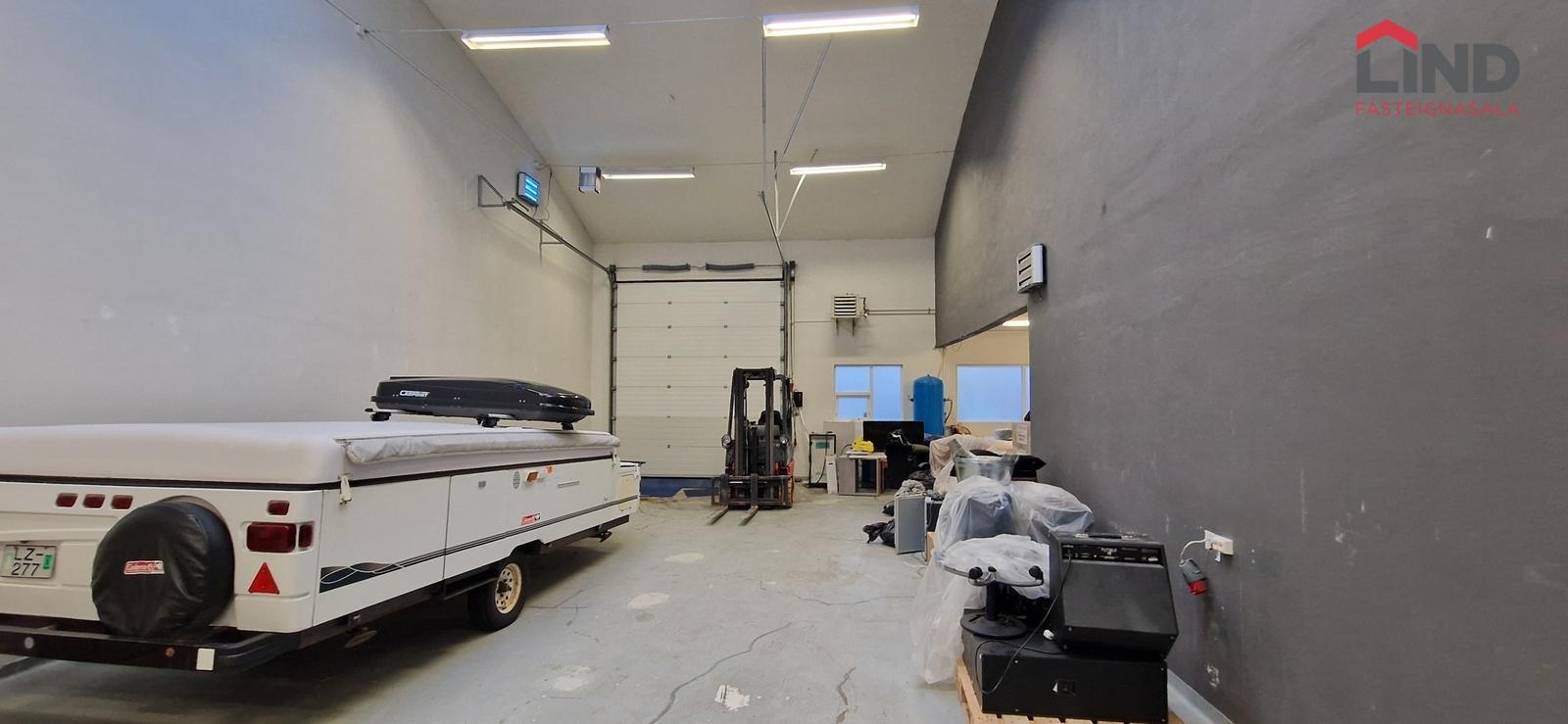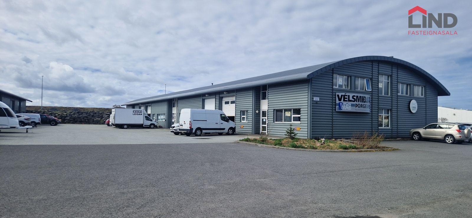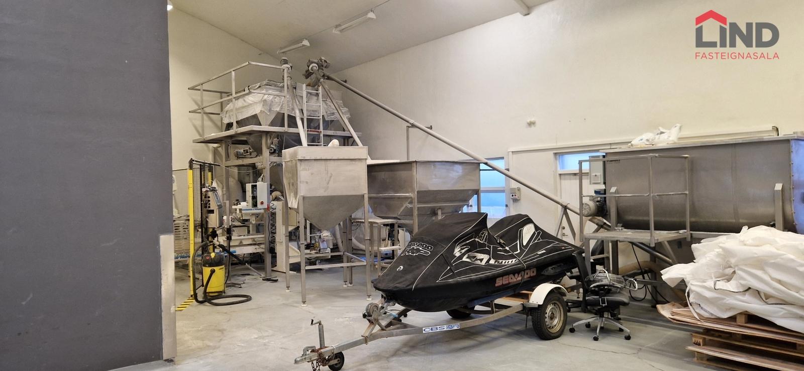Mjög vandað Atvinnuhúsnæði á tveimur hæðum, salur með stórum innkeyrsludyrum 276,9 fm. og milliloft/skrifstofa 88,6 fm. samtals 365,5 fm. Neðri hæð 276,9 fm. skiptist: Forstofa með hurð inní vinnslusal og stigi upp á eftir hæð, flísar á gólfi Vinnslusalur með sér styrktu gólfi, hiti í gólfi, epoxy á gólfi. Stór innkeyrsluhurð 360 cm. á breidd og 400 cm. á hæð. Baðherbergi með salerni og sturtu, flísar í hólf og gólf Skiptiaðstaða fyrir starfsfólk. Geymsla og lítil skrifstofa. Efri hæð 88,6 fm. skiptist: Steyptu stigi milli hæða með flísum á gólfi Eldhús með ljósri eikarinnréttingu með stórum ísskáp, mjög góð mataraðstaða, flísar á gólfi Salerni með eikarinnréttingu, flísar í hólf og gólf Skrifstofa með parketi á gólfi. Yfir skrifstofu/eldhúsi er þakgluggi. Mjög vandað staðsteypt hús, einangrað að utan og klætt með litaðri klæðningu. Lóðin er snyrtilega frágengin með malbikuðum bílastæðum meðfram húsinu.