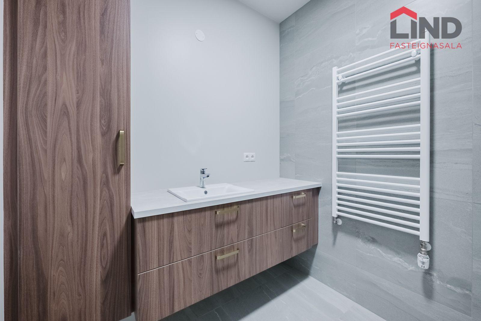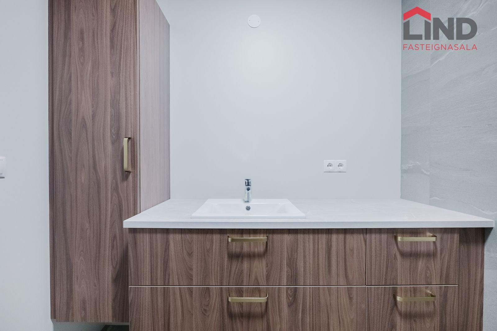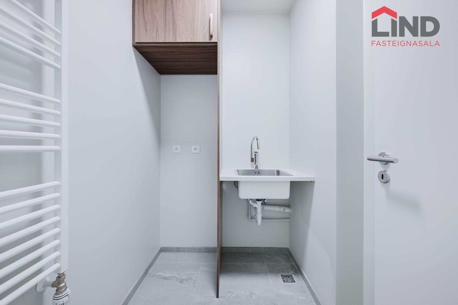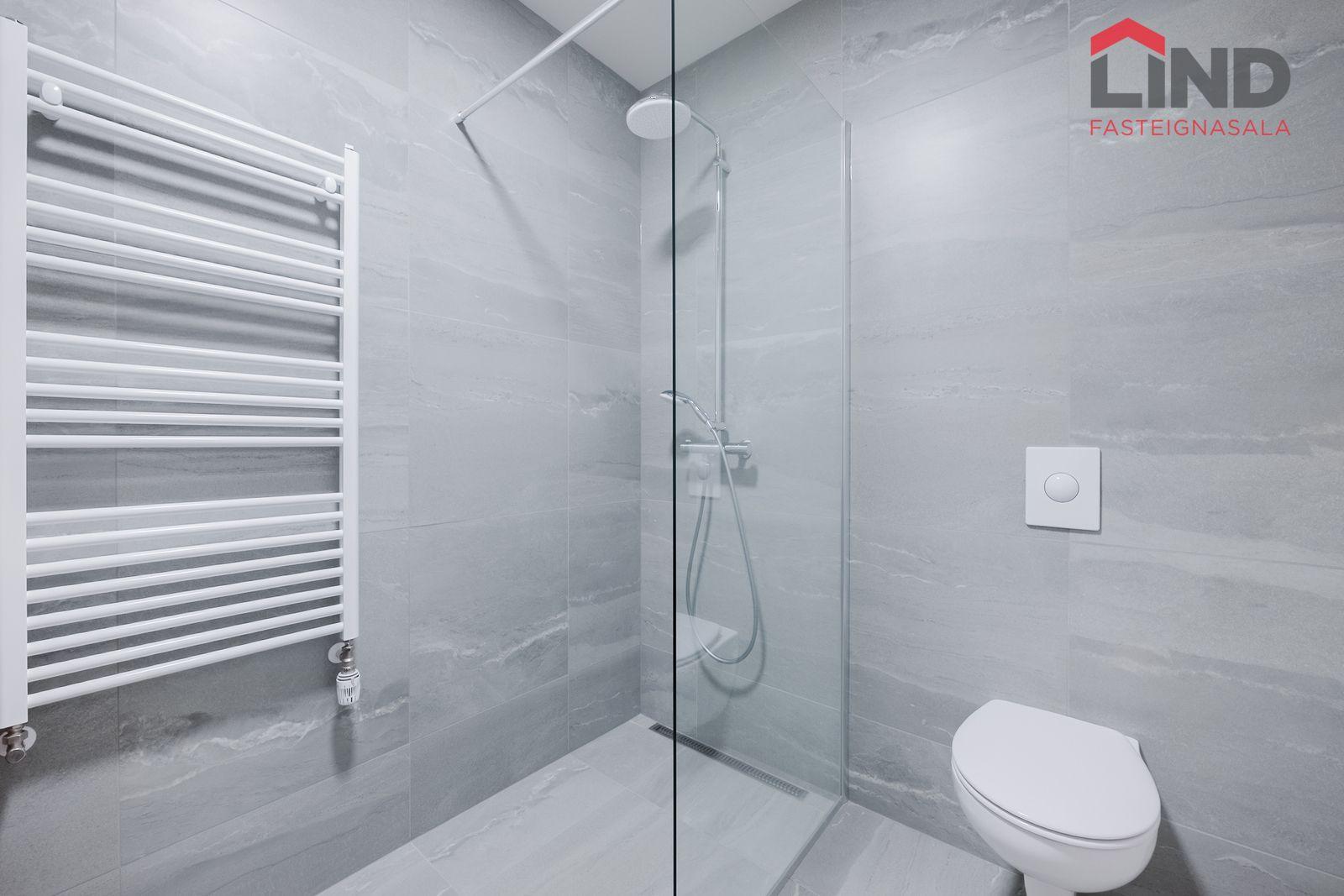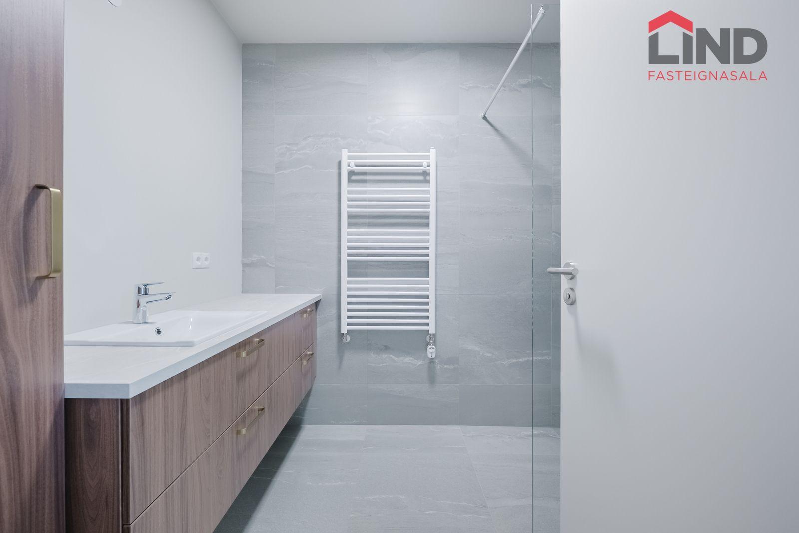Baðherbergi: Baðinnrétting kemur frá Axis. Hreinlætistæki og handklæðaofn eru frá Byko. Salernið er upphengt og innbyggt. Hitastýrð blöndunartæki verða við sturtu. Gólf eru flísalögð og veggir að hluta upp í loft