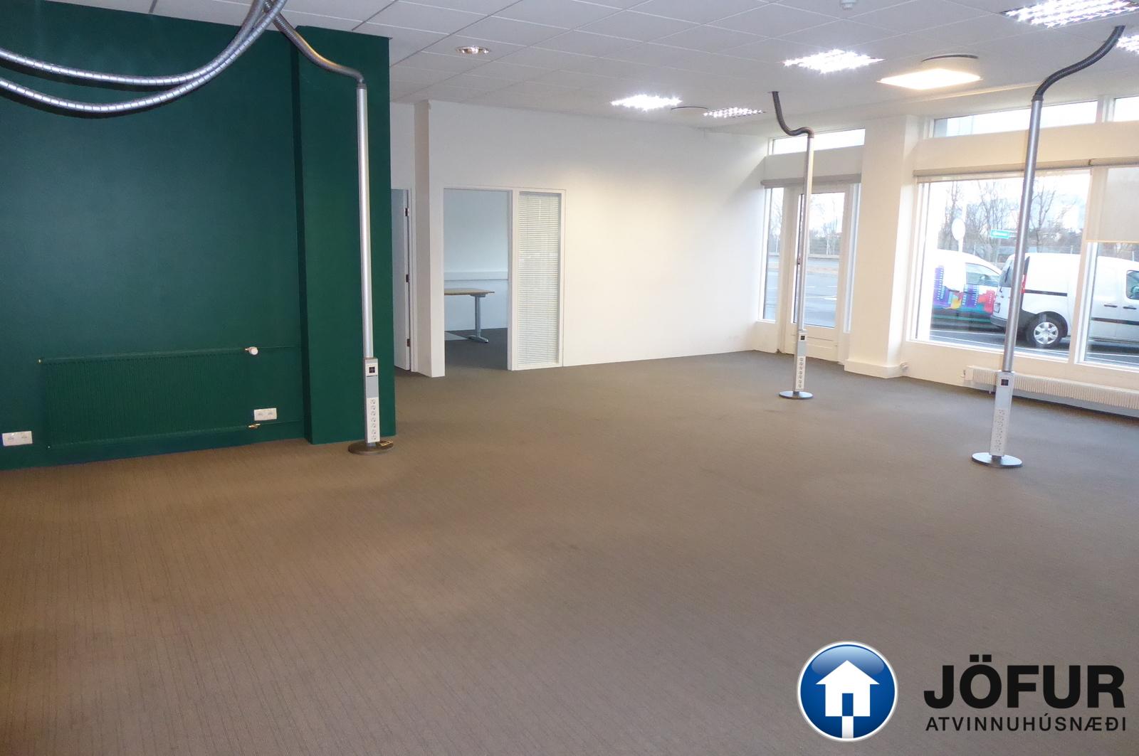 Húsnæðið er í þremur aðskildum einingum sem hægt er að opna á milli þeirra allra og skiptist eftirfarandi: Rými I: 370,4 m² Skiptist upp í móttöku, opinn skrifstofusal, tvær lokaðar skrifstofur, eitt fundaherbergi og eldhús-/ kaffiaðstöðu. Á gólfum eru teppaflísar, kerfisloft og lýsing í loftum. Eldhús- og snyrtiaðstaða. Í kjallara er innangengt í samtals 98,2 m² skjala-/ geymslurými, samtals er það rými 142,4 m² með hlutdeild í sameign.