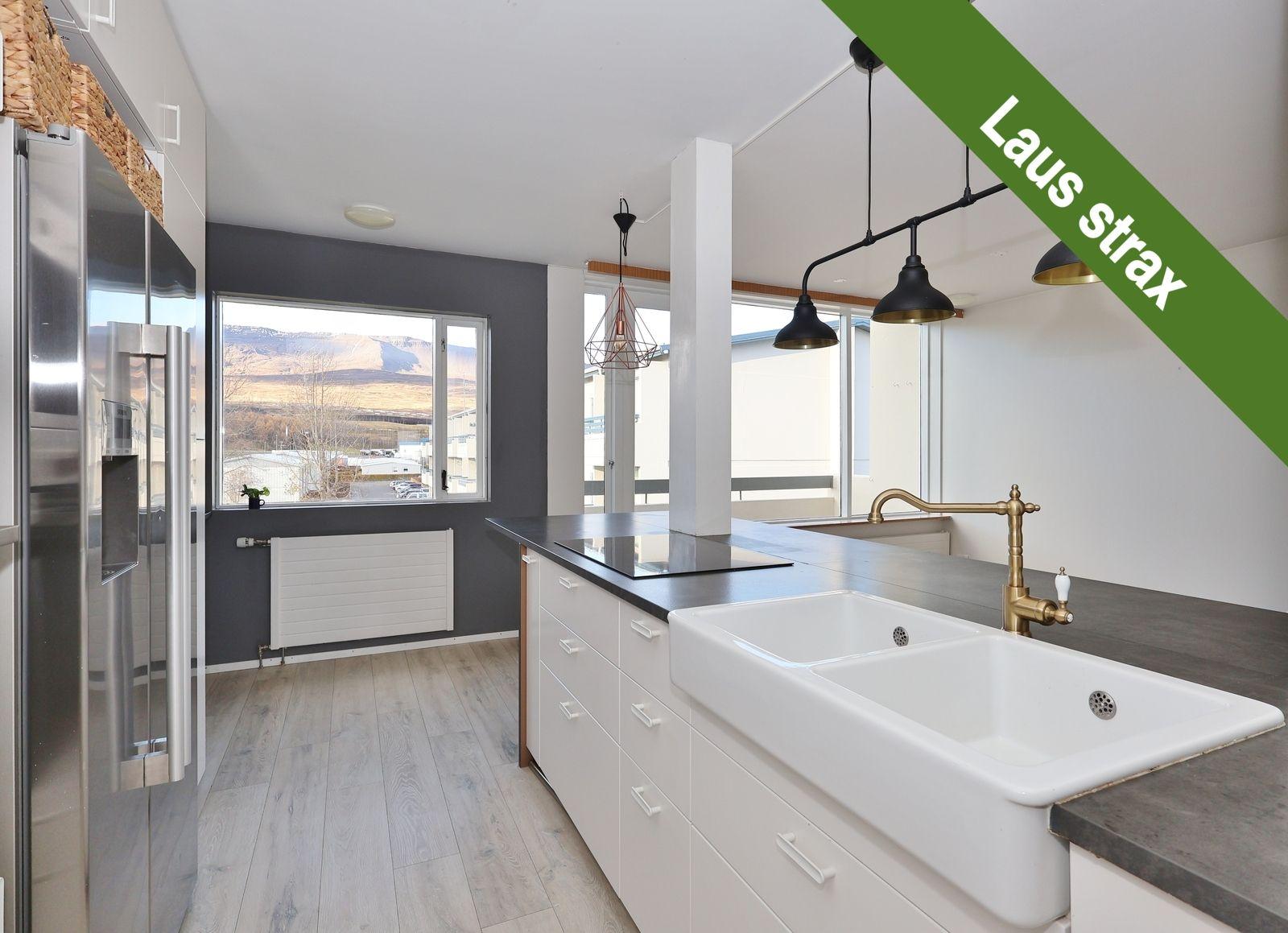 Eldhús hefur verið endurnýja og opnað inn í stofu. Hvít innrétting og rúmgóð eyja með mjög góðu skápa- og bekkjarplássi. Uppþvottavél er innfelld í innréttingu og fylgir með við sölu eignar.