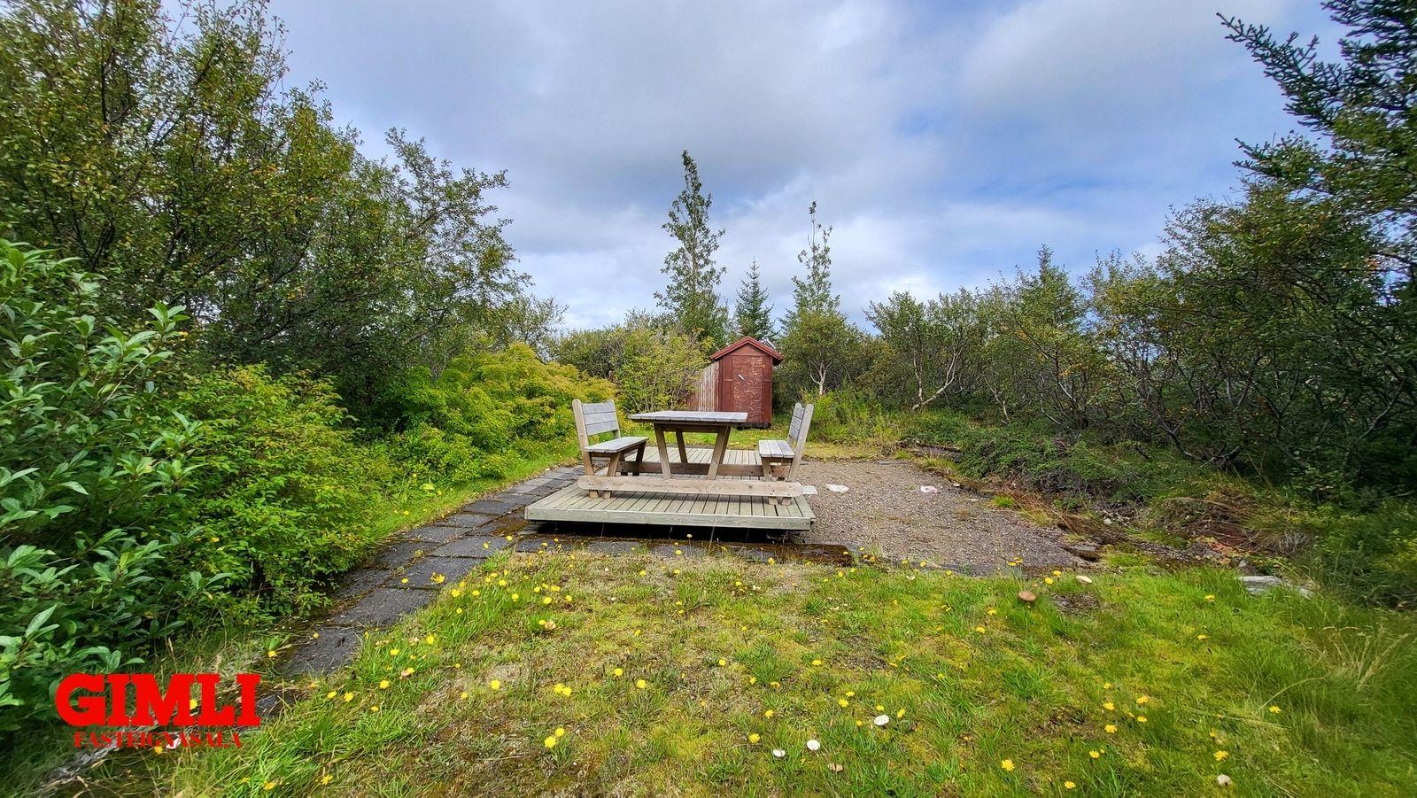 Hún er mjög gróin með fallegum birkitrjám og grasflötum að hluta þar sem auðvelt er að taka á móti stórum hópi vina með ferðavagna. Mjög víðsýnt er í 360 gr.
