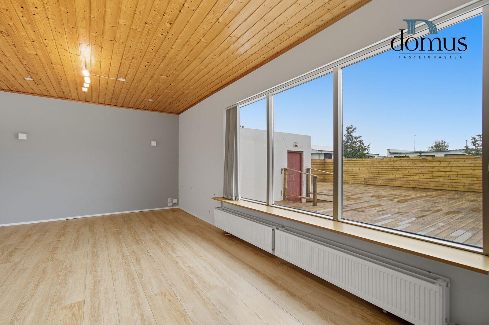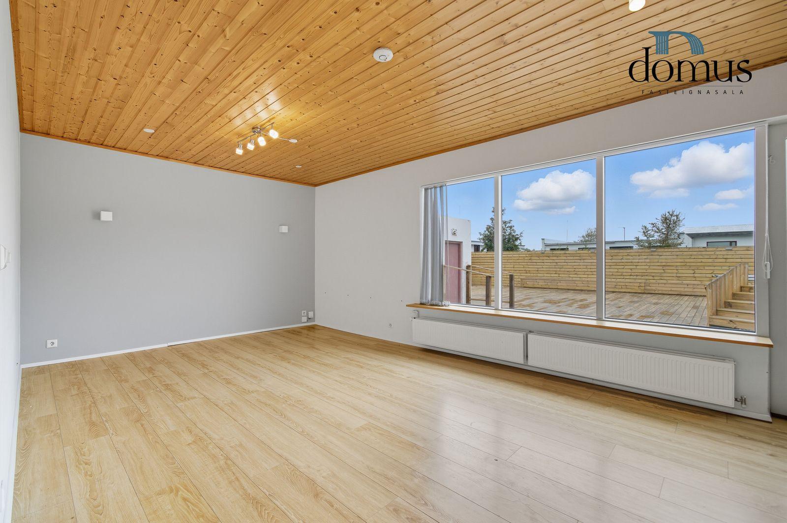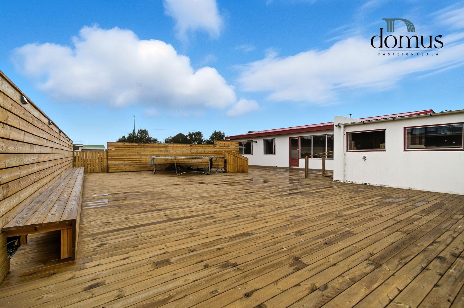Eignin er á einni hæð og skiptist í tvær forstofur, eldhús, stofu, þvottahús, baðherbergi og þrjú svefnherbergi. Við húsið er mjög stór nýr sólpallur sem að er að mestu tilbúinn, en einhver frágangur er þó eftir til að fullklára hann.