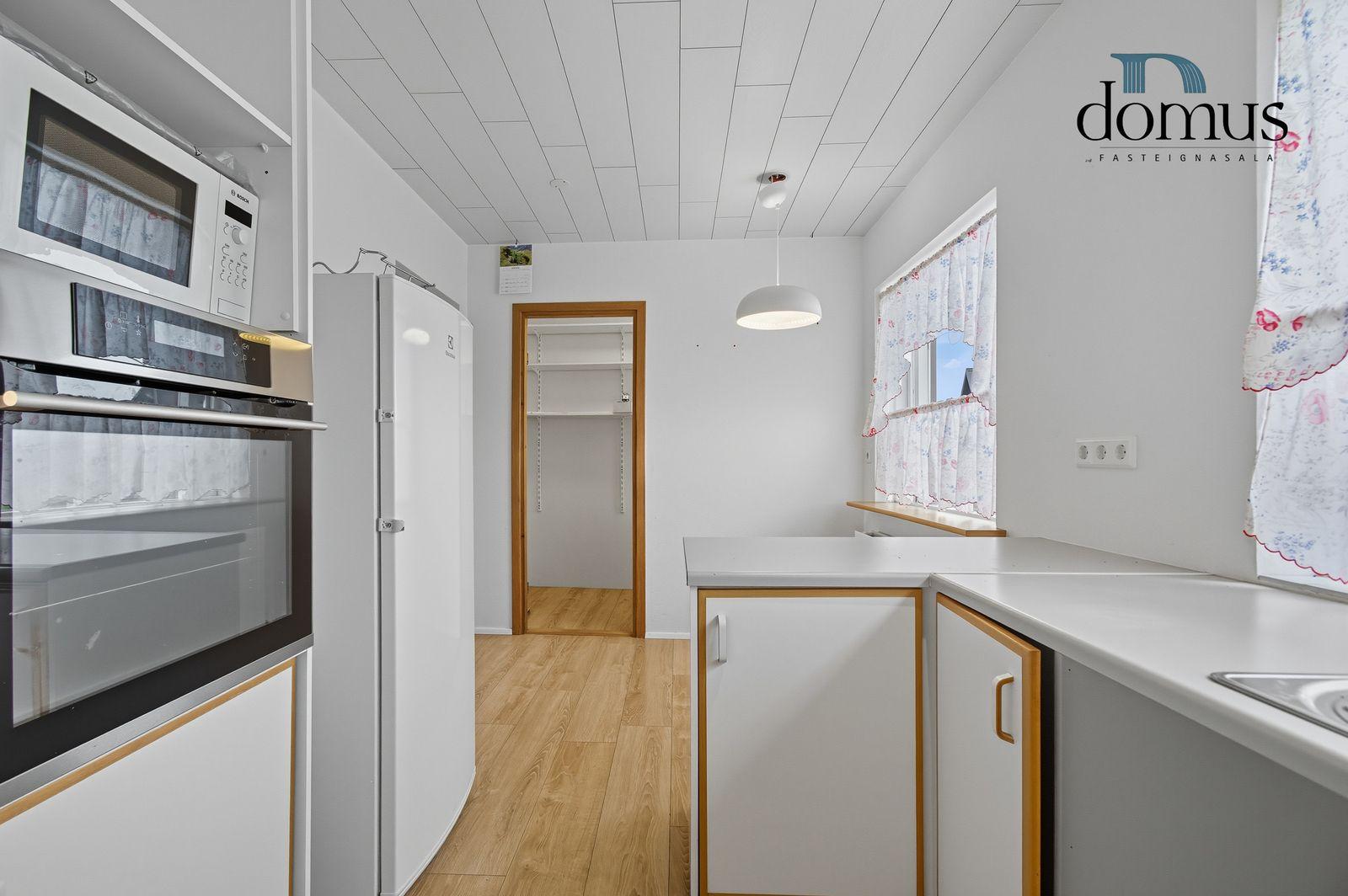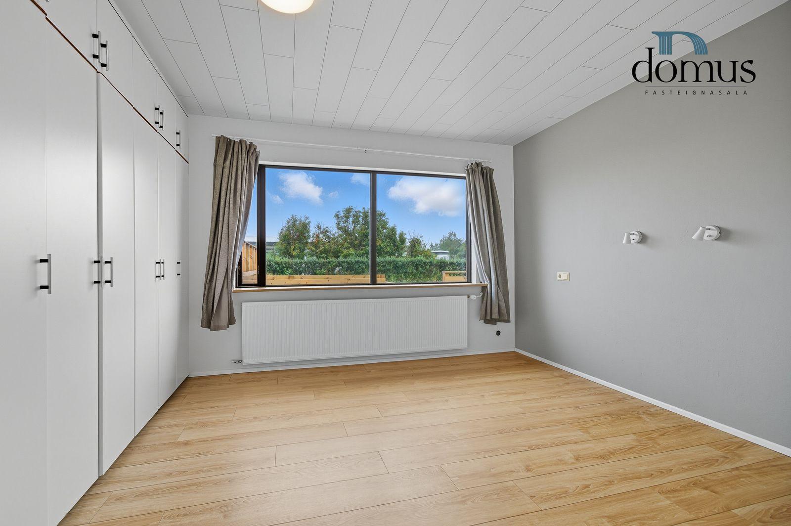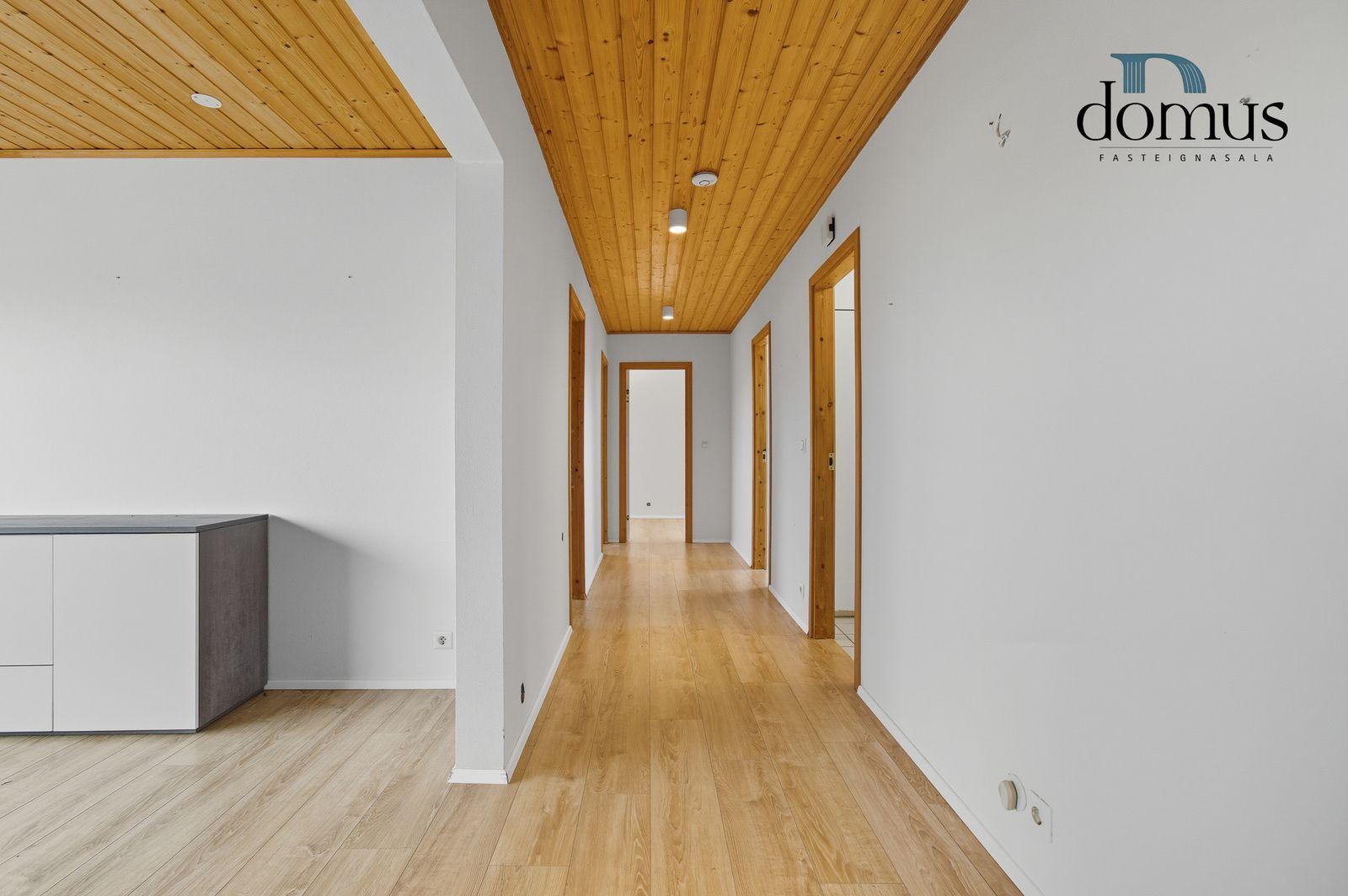 Nánari lýsing: Forstofa: Forstofan er rúmgóð með flísum á gólfi og fataskáp. Stofa: Stofa er stór með parketi á gólfi og viðar panil í lofti. Útgengt er úr stofu út á á sólpall. Eldhús: Er með hvítri innréttingu og borðkrók. Inn af eldhúsi er rúmgott búr þar sem eru hillur og hægt að hafa frystikistu. Hjónaherbergi: Er með parketi á gólfi og fataskáp. Svefnherbergi: Eru tvö auk hjónaherbergis og eru með parketi á gólfi. Baðherbergi: Er með flísum og hvítri innréttingu. Einnig eru sturta og baðkar. Þvottahús: er með innréttingu fyrir þvottavél og þurrkara og útgengt er út á innkeyrslu úr þvottahúsi. Bílskúr: Er með floti á gólfi, bílskúrshurð og hurð.