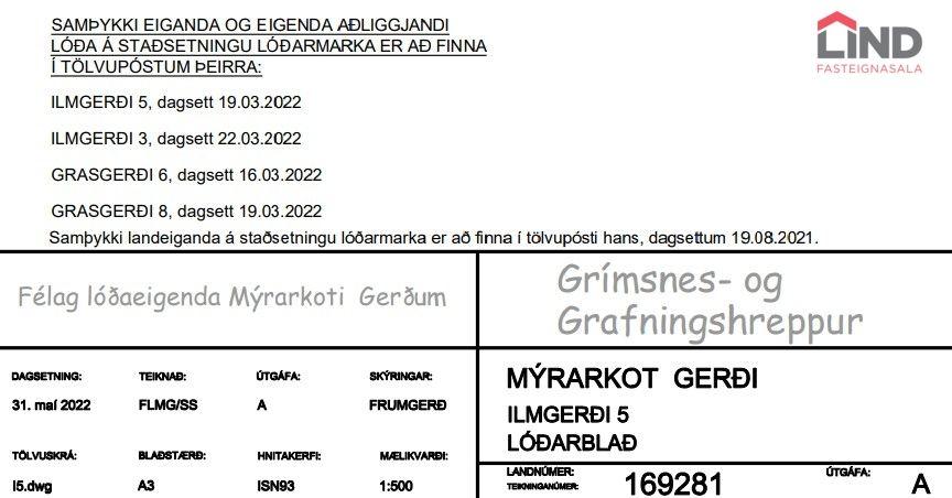 LIND fasteignasala og Helga Pálsdóttir löggiltur fasteignasali kynnir 6650,0 m² endalóð við Ilmgerði 5 í Grímsnes og Grafningarétti , afbragðs ræktunarland, mikið fuglalíf og náttúrufegurð. Stutt frá golfvellinum á Kiðjabergi, sundlaug á Minni Borg og stutt í margar náttúruperlur. Hitaveita, kalt vatn og rafmagn á svæðinu.