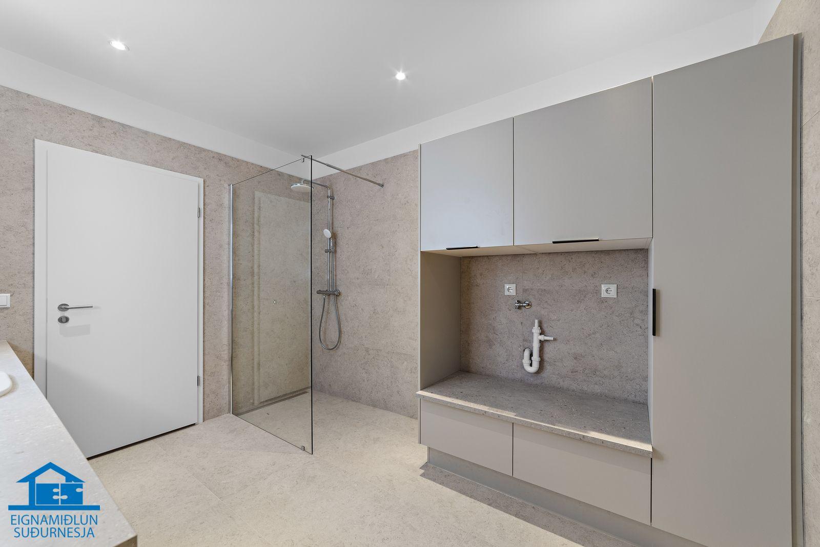 Þvottaaðstaða er inná baðherbergi með HTH innréttingu fyrir þvottavél og þurrkara í vinnuhæð.
