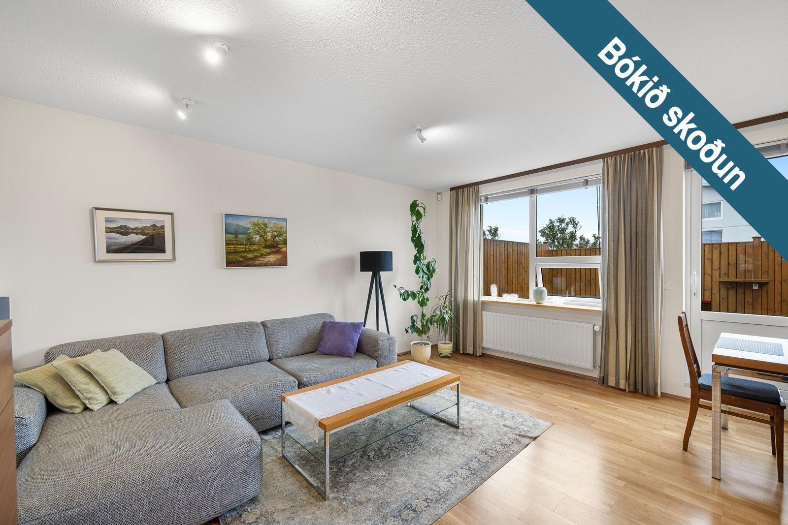 Neðri hæð: Komið er inn í nýlega flísalagða forstofu með góðum klæðaskápum. Inn af forstofu er rúmgott þvottahús með góðu skápaplási og góðu borðplássi. Frá forstofu er gengið inn í eldhús, stofu og borðstofu í björtu opnu rými með útgengi út á nýlegan skjólgóðan sólpall til suður. Á neðri hæð er einnig nýlega endurnýjað baðherbergi með sturtu. Eitt svefnherbergi er á neðri hæð með klæðaskáp. Útigeymsla er við hlið inngangs. Parket er á öllu nema vortrýmum þar eru flísar.