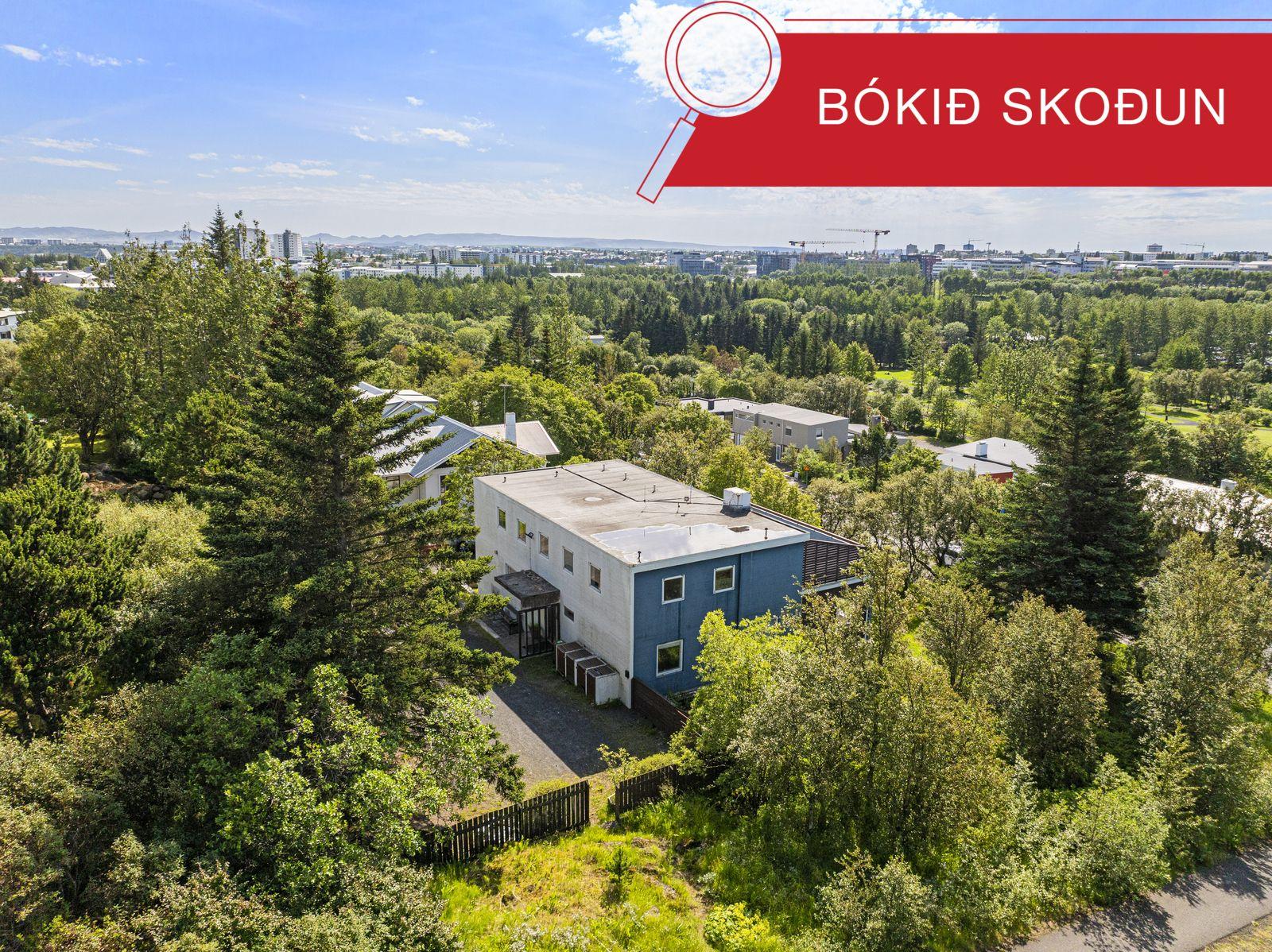 Heildarstærð hússins er því um 402 fm.** SÆKTU SJÁLFVIRKT SÖLUYFIRLIT MEÐ NÁNARI UPPLÝSINGUM HÉR **** SKOÐAÐU EIGNINA Í ÞRÍVÍDD MEÐ ÞVÍ AÐ SMELLA HÉR**Gengið er inn í húsið á miðhæð að ofanverðu. Á miðhæð er mikið rými sem telur anddyri, baðherbergi (klósett og vaskur), stórt eldhús með borðkrók, stór borðstofa/stofa með útgengi út á stórar suðursvalir, stofa með arinn og tvö herbergi.