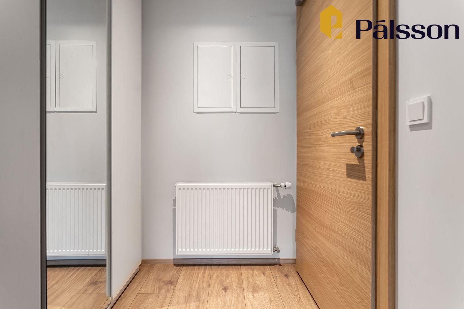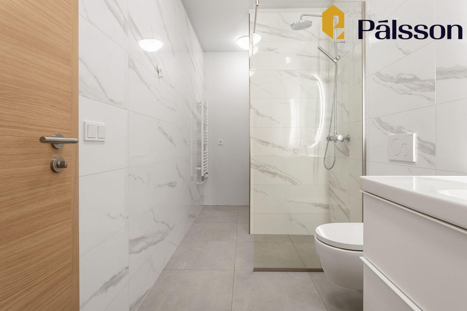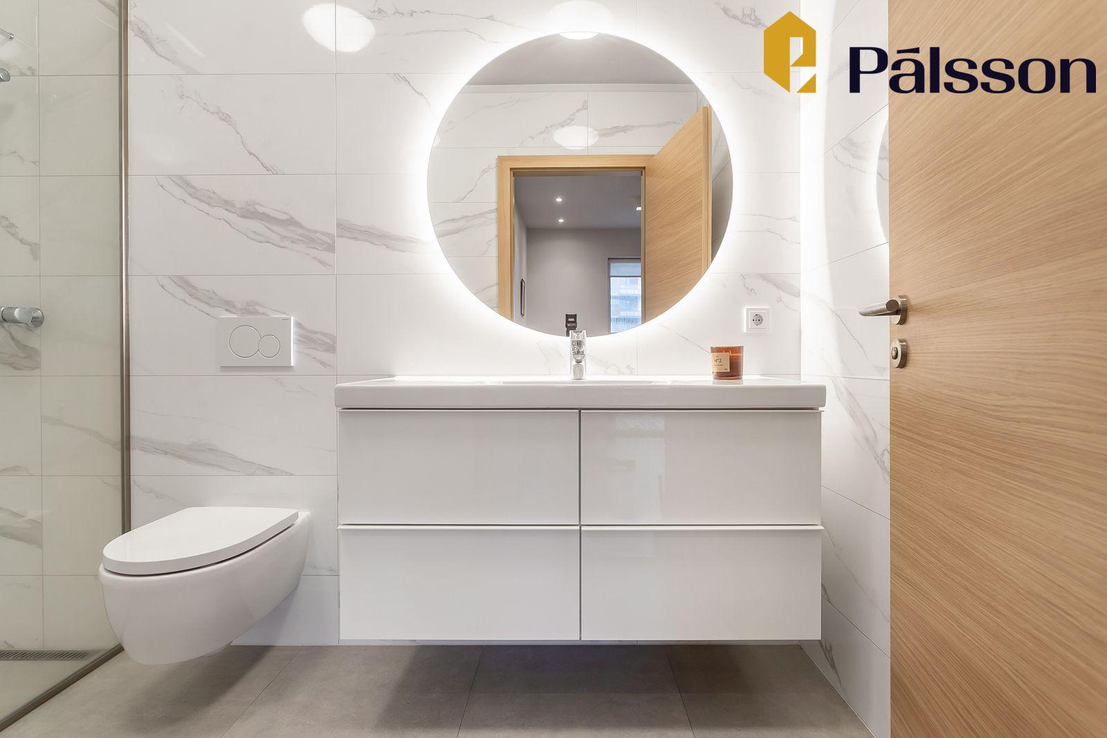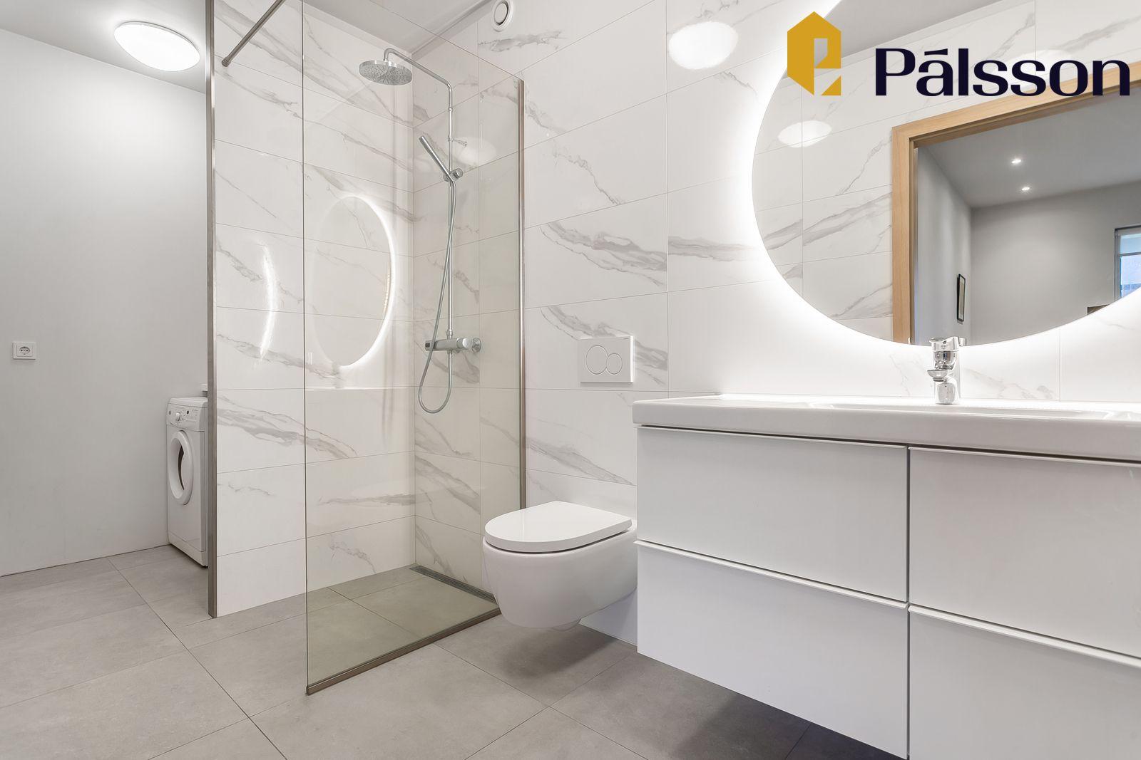 Baðherbergi er flísalagt með sturtu, ljósri innréttingu, upphengdu salerni og handklæðaofni. Þar er einnig innangengt í þvottarými með tengi fyrir þvottavél og þurrkara.
