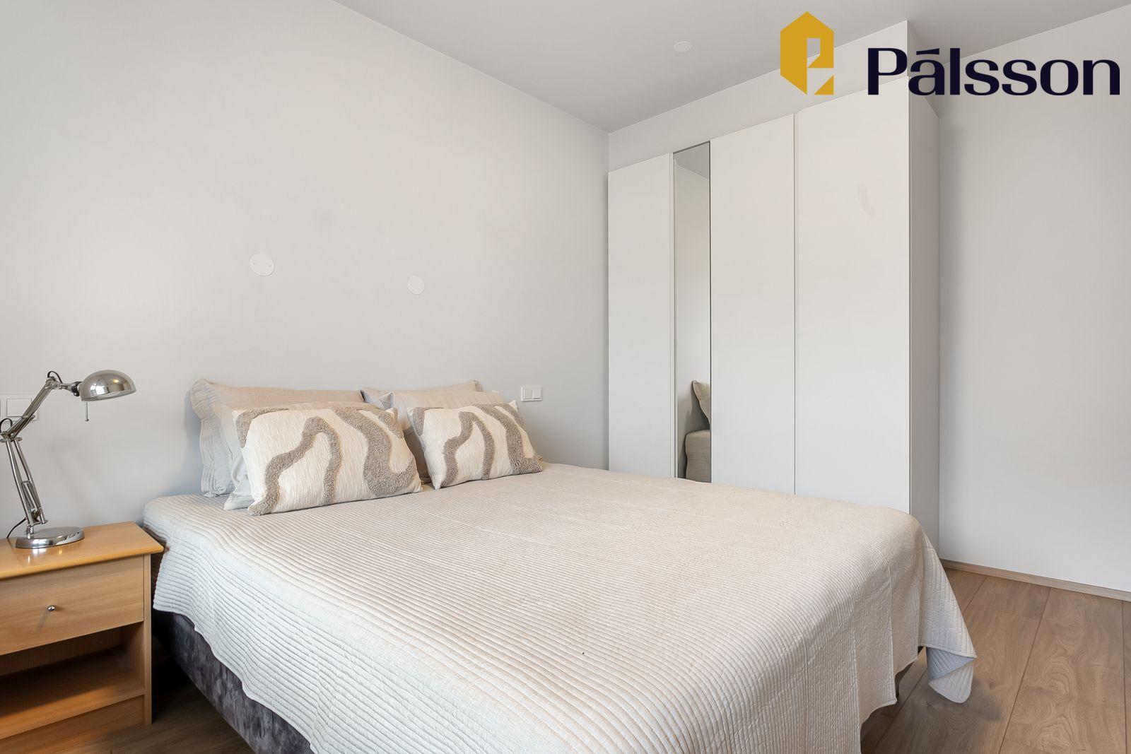 Svefnherbergi er rúmgott með fataskáp og harðparketi.