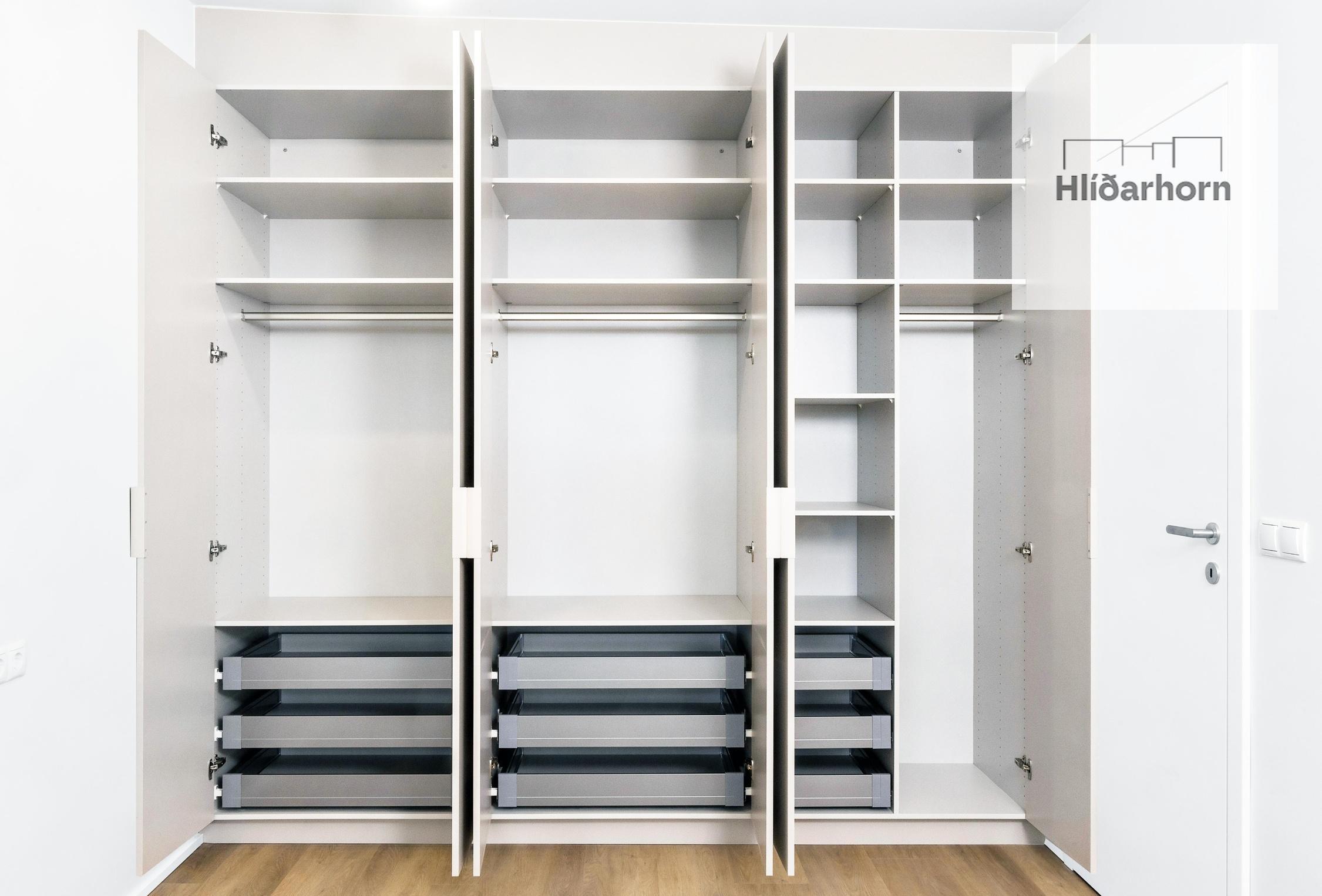 Nánari lýsing: Í opnu anddyri er góður fataskápur. Gengið er beint inn í rúmgott alrými; eldhús með eyju og stofu/borðstofu með útgengi á yfirbyggðar vestursvalir. Óhindrað útsýni yfir Vatnsmýrina og Þingholtin. Ljós eldhúsinnrétting með mattri áferð, ljósyrjóttur quartz-steinn á borðum og milli skápa og hágæða blöndunartæki úr burstuðu krómi. Innbyggður ísskápur og uppþvottavél. Rúmgott hjónaherbergi með góðum fataskápum. Baðherbergi er með “walk-in” sturtu með hertu gleri, handklæðaofni og upphengdu salerni. Leirljósar steinflísar á gólfi og veggjum, ljós innrétting með mattri áferð og speglaskáp. Blöndunartæki úr burstuðu krómi. Innbyggð blöndunartæki í sturtu. Afmörkuð aðstaða og tengi fyrir þvottavél og þurrkara á baði. Sérgeymsla íbúðar í kjallara er merkt 0014. Í kjallara Hlíðarhorns eru sameiginlegar hjóla- og vagnageymslur og bílakjallari með fyrirkomulagi samnýtingar þar sem íbúar munu hafa forgang.