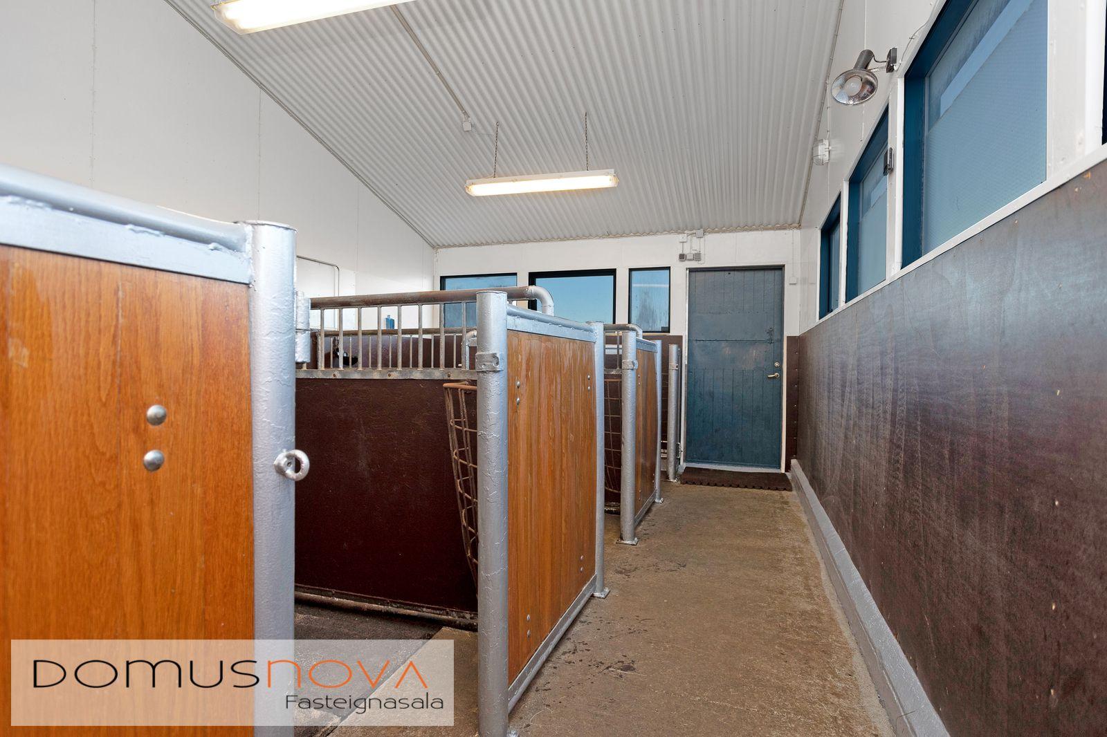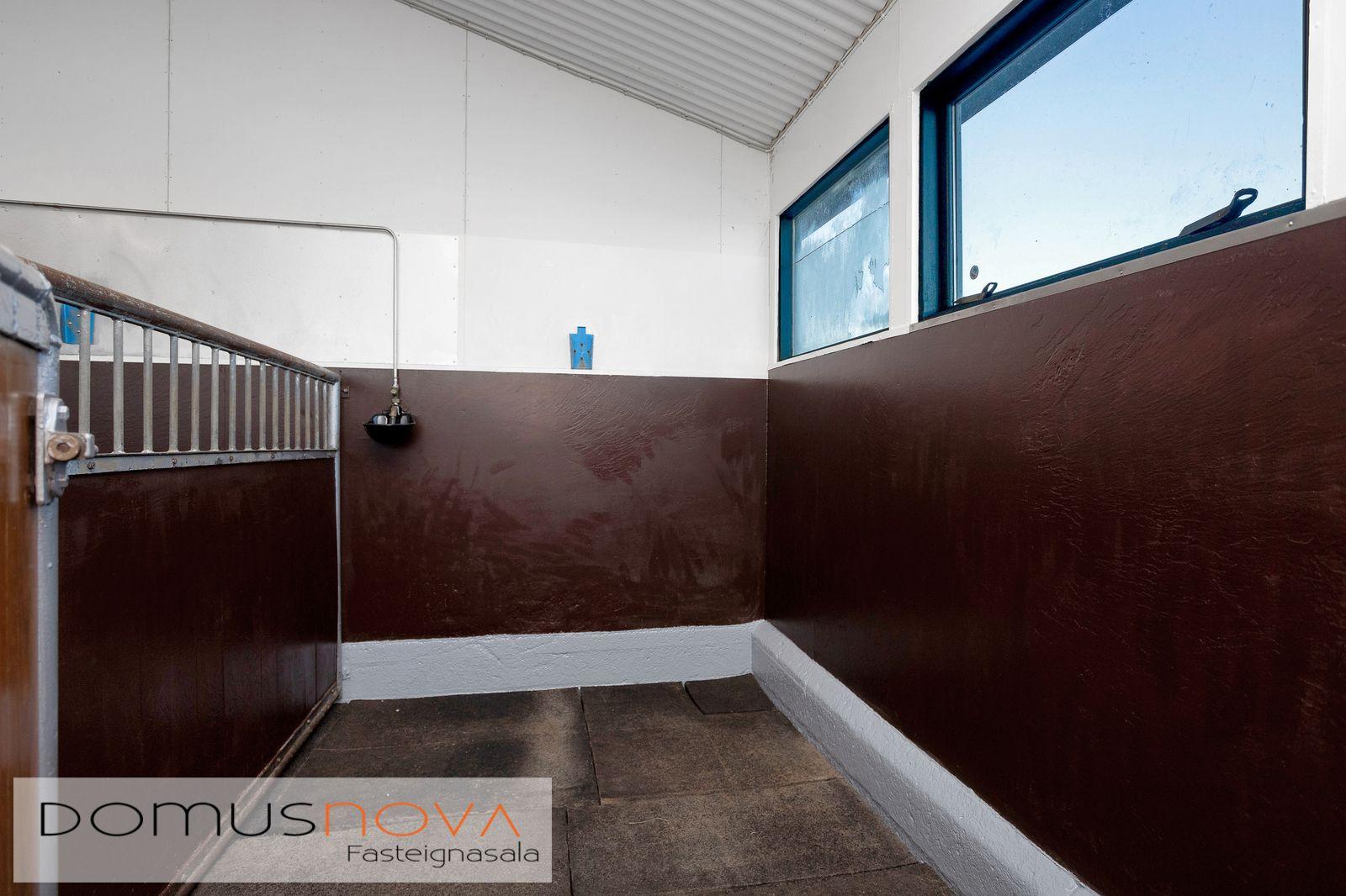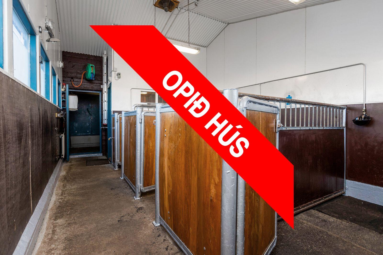 NADIA KATRÍN OG DOMUSNOVA KYNNA: MIKIÐ ENDURNÝJAÐ ENDAHÚS MEÐ ÞREMUR RÚMGÓÐUM STÍUM. SKOLKERFI UNDIR MOTTUM Í STÍUM, HLAÐA SEM RÚMAR FIMM STÓRBAGGA. Lýsing eignar: Snyrtilegt endahús með þremur rúmgóðum stíum fyrir 6 hesta samkvæmt gömlu reglugerðinni. Nýlegar drenmottur í stíum með skolkerfi sem skolar undir motturnar í niðurfall. Innra byrði í stíunum er nýmálað og lökkuð eik er í hlerum. Nýlega hafa vatnslagnir brynningarskálar verið endurnýjaðar. Á gangi er blöndunartæki er til að þvo hesta og smúlslanga á jójói. Lítil kaffistofa er milli hlöðu og hesthúss og inn af henni er salerni. Um 5 fm geymsluloft er fyrir ofan kaffistofu. Ofnakerfi er á kaffistofu, hesthúsi og hlöðu. Í hlöðunni sem rúmar 5 stórbagga er talía til að taka inn bagga. Skipt var um möl í gerði í byrjun sumars, þar er einnig sameiginleg taðþró.