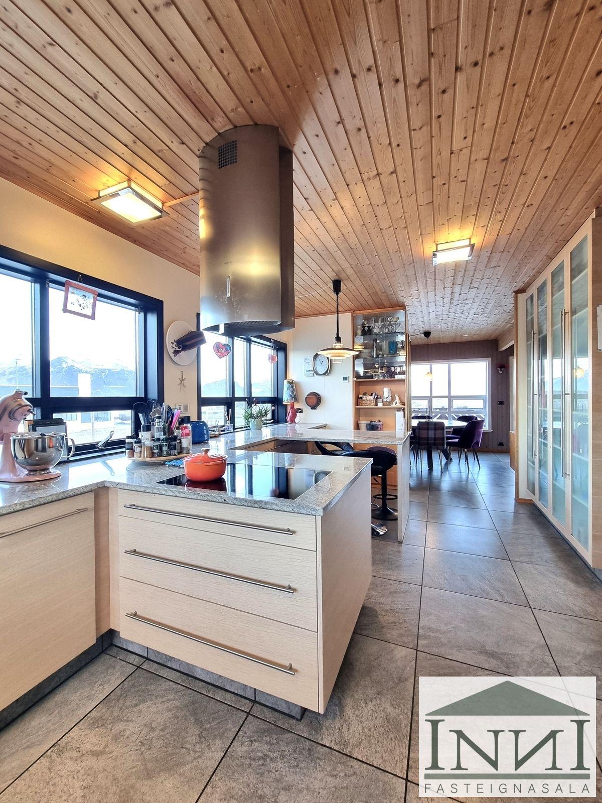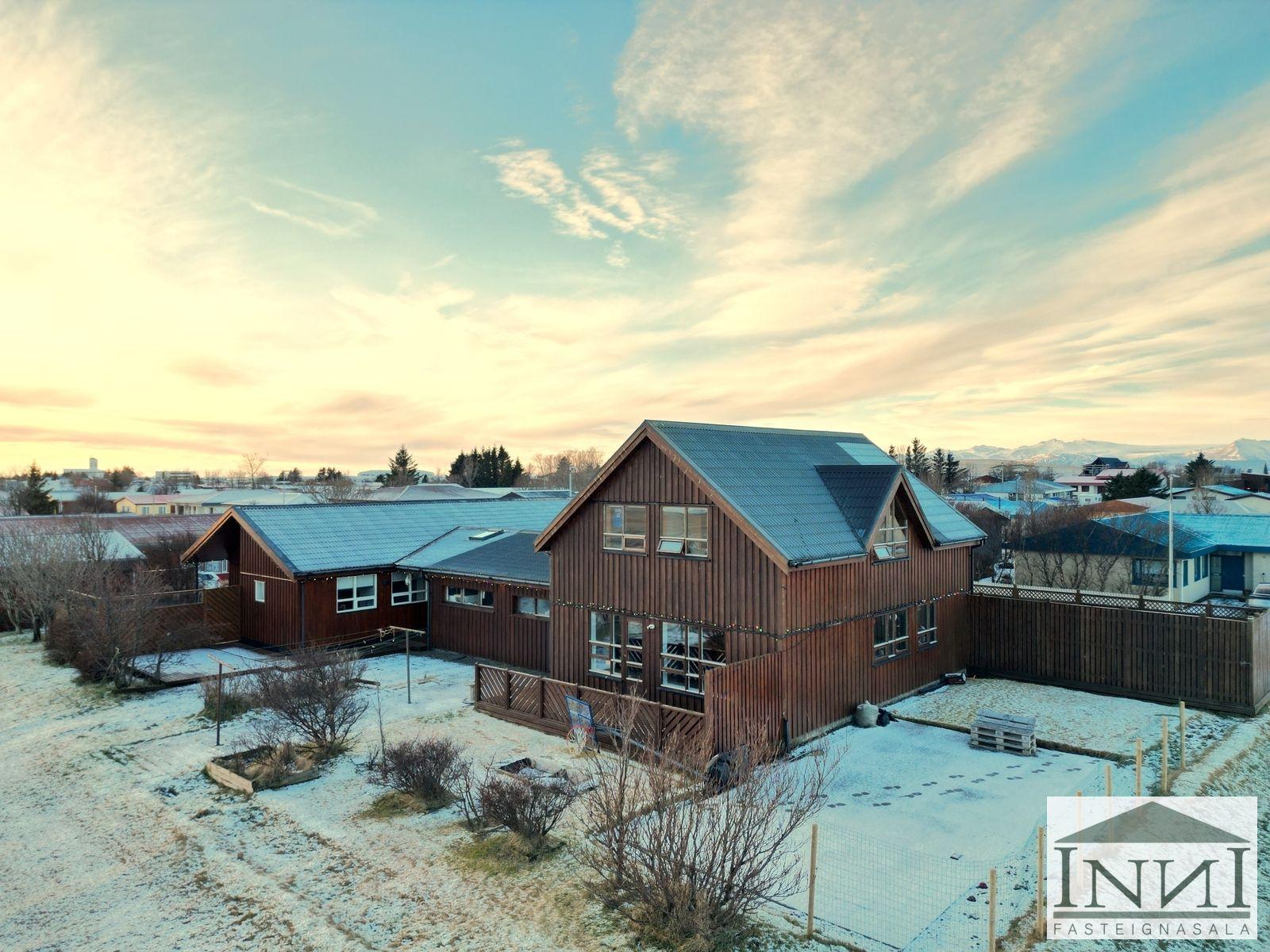 Falleg og vel skipulögð parhúsaíbúð með fjórum svefnherbergjum og bílskúr. Frábært útsýni. Stofa og borðstofa eru í opnu rými með flísum á gólfi og útgengt á timburverönd með fallegu útsýni. Eldhús tengist stofu/borðstofu þó það sé aðeins meira sér. Í eldhúsi er falleg innrétting og sömu flísar á gólfi. Eldhús, stofa og borðstofa var endurnýjuð ca. árið 2007 og þar er hiti í gólfi. Hiti er einnig í gólfi í holi. Baðherbergi á neðri hæð var allt endurnýjað árið 2025, þar eru flísar á gólfi, fín innrétting og sturta. Flísar eru í forstofu en málað gólf í þvottahúsi þar inn af. Á efri hæð er hol og úr því gengt í fjögur nokkuð rúmgóð svefnherbergi. Úr einu herbergi er útgengt á svalir. Spónarparket er á holi og öllum herbergjum. Baðherbergi á efri hæð er flísalagt. Þar er baðkar með sturtu í. Bílskúr er nokkuð hefðbundinn, með geymslu innst og einnig geymslulofti. Bílastæði er hellulagt og garður frágenginn með stórum timburveröndum, auk hellusvæðis sem nýtt hefur verið sem körfuboltaaðstaða.