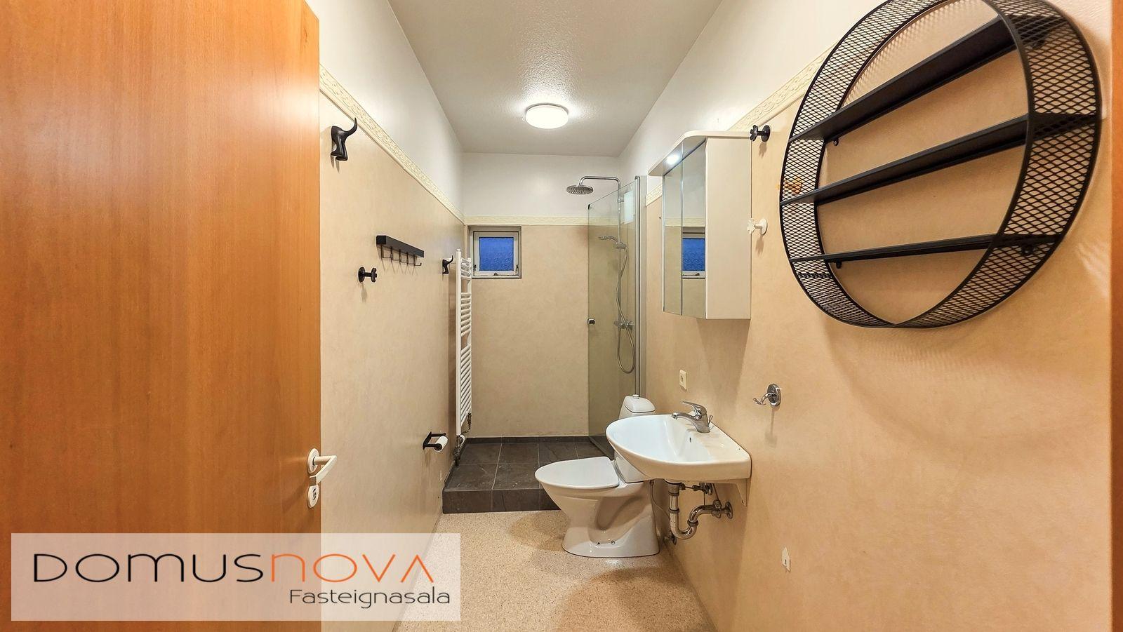 Baðherbergi: Speglaskápur ofan við handlaug. Flísalagður sturtubotn. Opnanlegt fag við sturtu. Handklæðaofn. Tengi fyrir þvottavél. Dúkur á gólfi.
