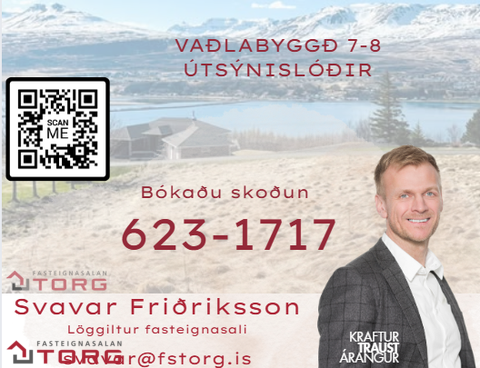Fasteignasalan Torg og Svavar Friðriksson, löggiltur fasteignasali kynna: Vaðlabyggð númer 8 - 3814m2 Íbúðarhúsalóð á þessum eftirsótta stað á Svalbarðshreppi. Um er að ræða eignarlóð. Stórbrotið útsýni! Stutt í skóla og leikskóla ásamt annarri þjónustu. Eingöngu 5 mínútna akstur yfir til Akureyrar. Fasteignanúmer lóðarinnar er 233-8996 og landeignanúmer er 198562. Allar nánari upplýsingar veitir Svavar Friðriksson, löggiltur fasteignasali í síma 623-1717 - svavar@fstorg.is. Bókaðu einnig frítt verðmat fyrir þína fasteign!