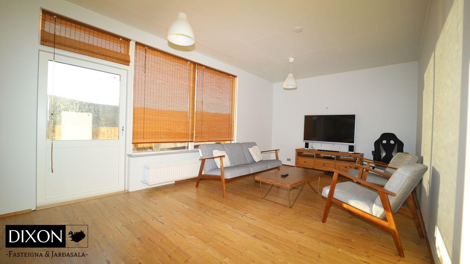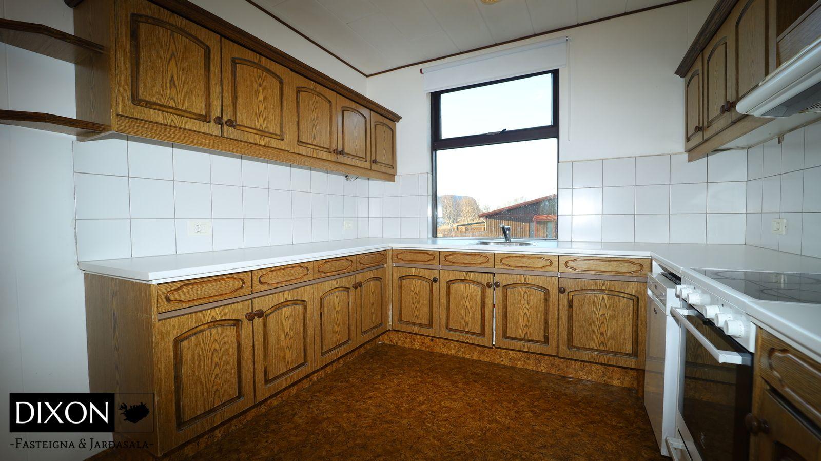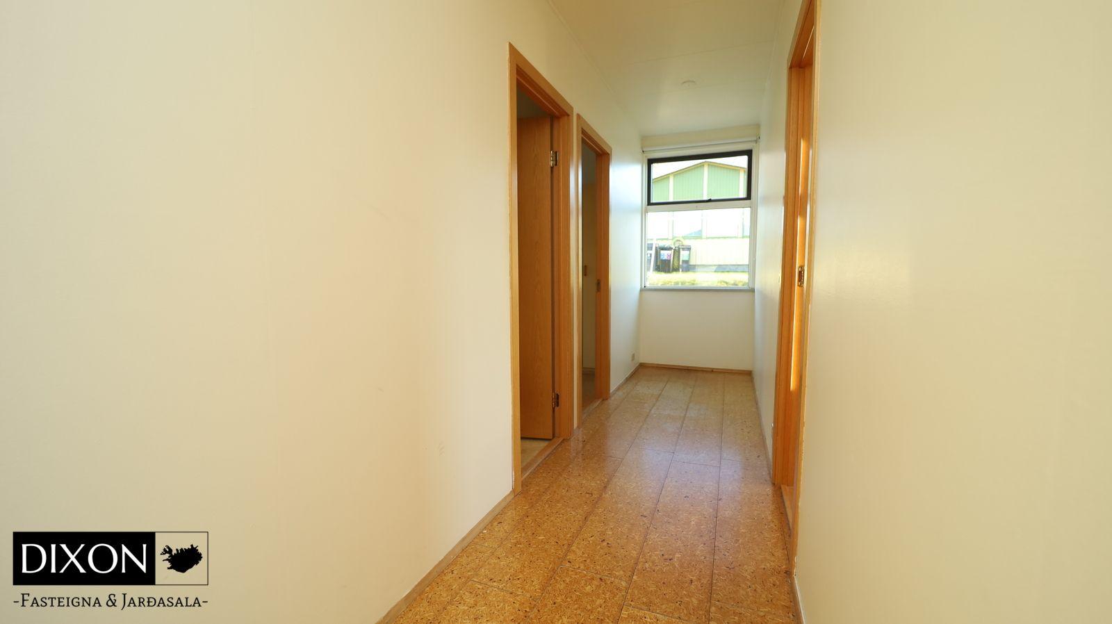 Lýsing á eigninn; Gengið er inn í forstofu, dúkur er á gólfi. Gengið er inn í alrými, þaðan er gengið inn í eldúsið, stofu og inn á lokaðan svefngang. Eldhúsið er með upprunalegri innréttingu, þó er búið að endurnýja borðplötuna og dúkur er á gólfi. Stofan er opin og björt, búið að endurnýja parket á stofu og alrými, nýleg svalahurð og nýlegir gluggar eru í stofunni. Gengið er út á sólpall frá stofu. Fallegt útsýni er út á fjörðinn. Svefngangur er með korkflísum á gólfi, 4 svefnherbergi eru í húsinu, dúkur, korkur og parket er á gólfum herbergja. Baðherbergið var endurnýjað fyrir nokkrum árum síðan. Baðherbergið var stækkað á kostnað barnaherbergis sem er við hlið baðherbergis. Það er flísalagt í hólf og gólf, hornbaðkar með innbyggðum tækjum. Eikar innrétting með góðu skápaplássi og handlaug. Walk in sturta. Gler skilur að sturtuna. Stórt hringlaga niðufall er í gólfinu sem tekur við vatninu frá sturtunni, sjáanlegt niðurfall er í gólfinu sem búið er að loka fyrir. Handklæðaofn er á vegg og salerni er á gólfinu. Skemmd er í hurðarkarmi og í korkflísum á svefngangi eftir vatn frá baðherberginu. 4 Svefnherbergi eru í húsinu, skápar eru í hjóanherbergi.