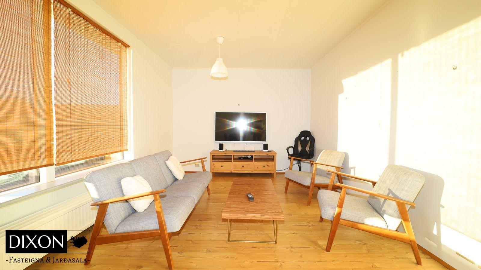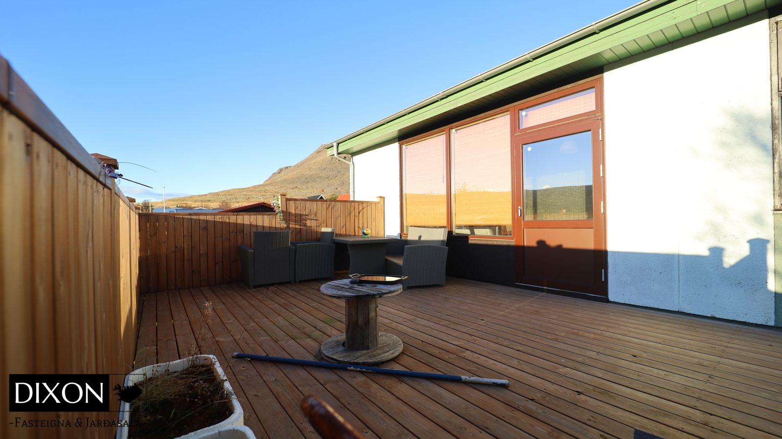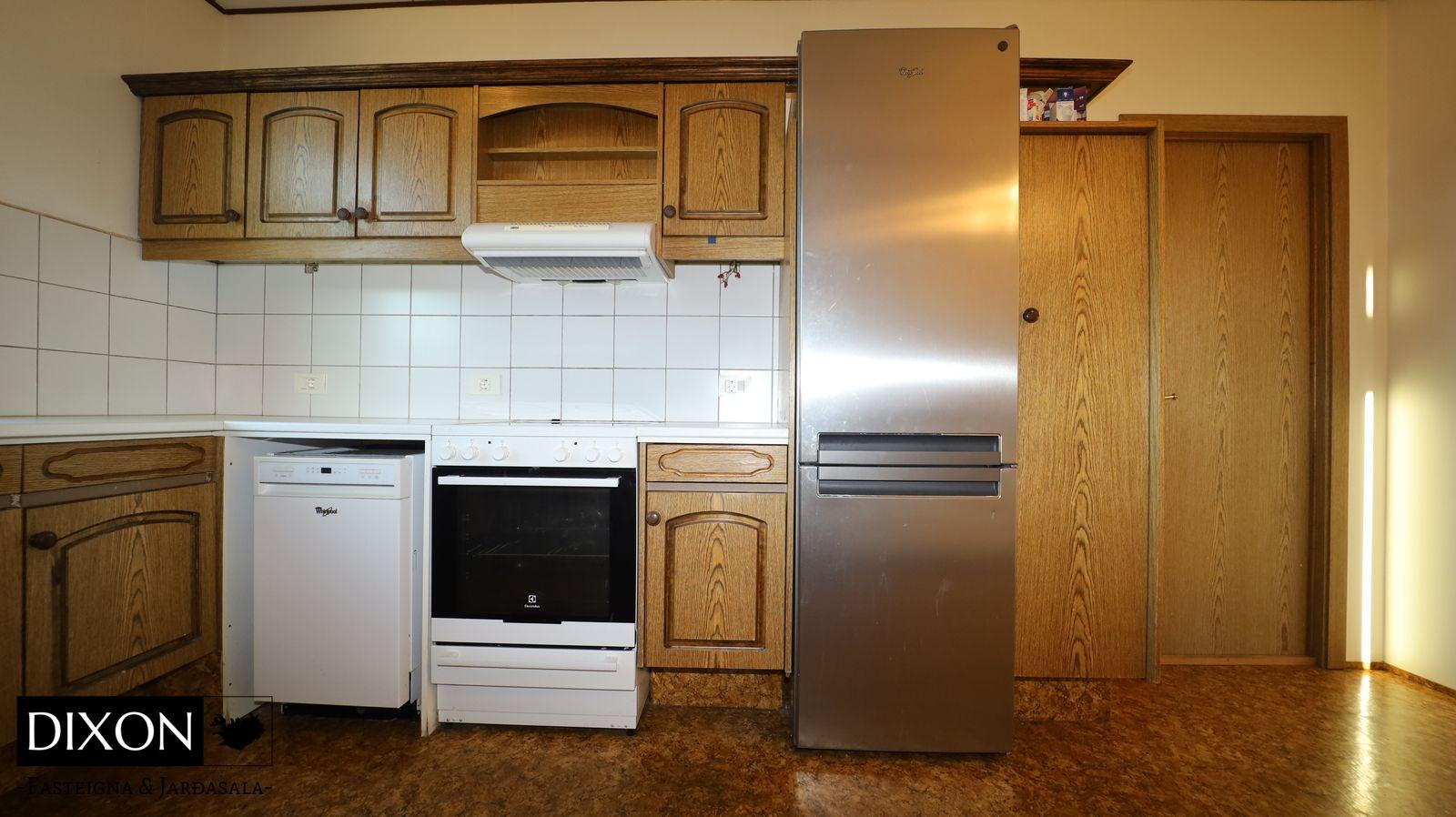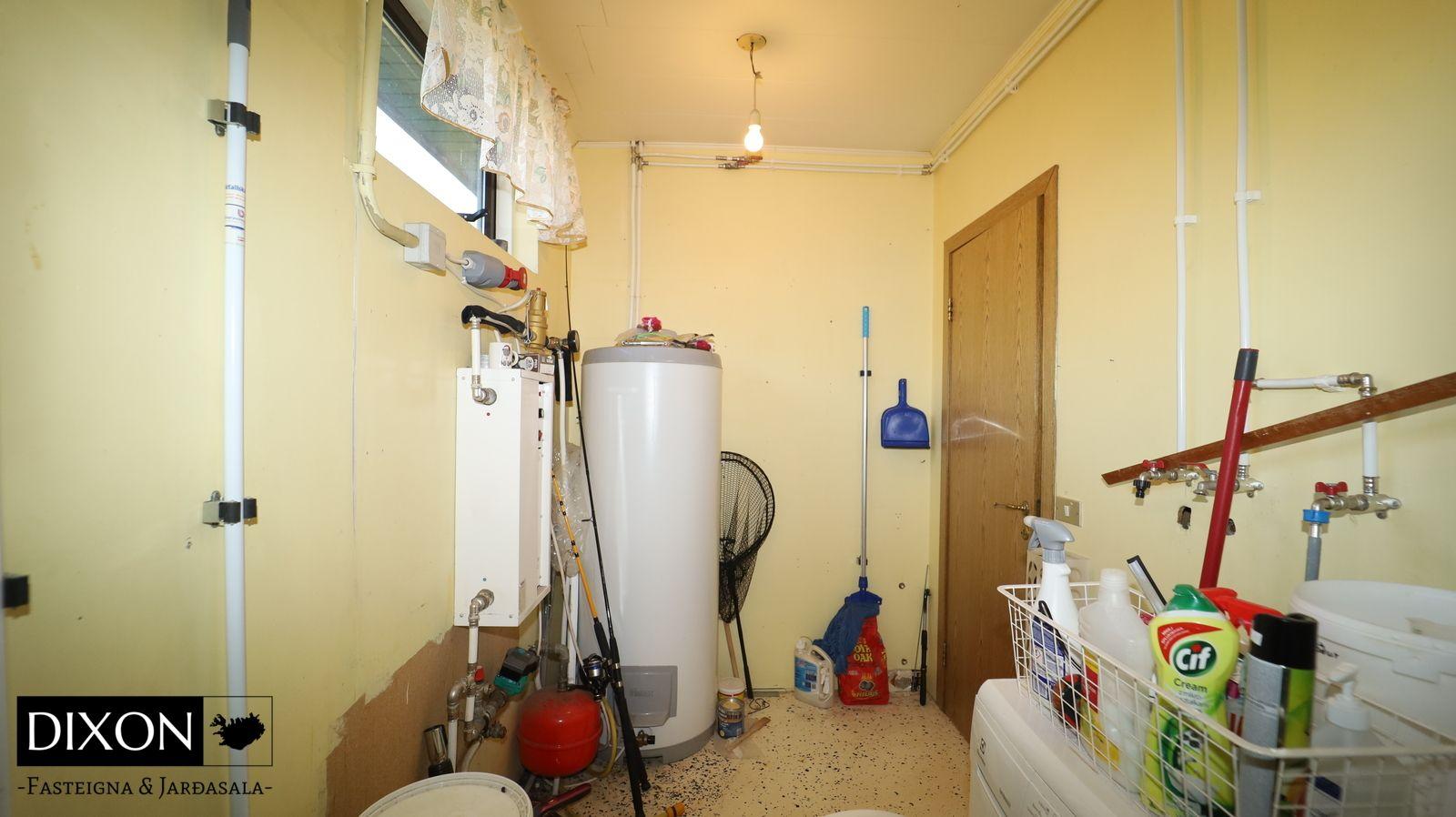 Lýsing á eigninn; Gengið er inn í forstofu, dúkur er á gólfi. Gengið er inn í alrými, þaðan er gengið inn í eldúsið, stofu og inn á lokaðan svefngang. Eldhúsið er með upprunalegri innréttingu, þó er búið að endurnýja borðplötuna og dúkur er á gólfi. Stofan er opin og björt, búið að endurnýja parket á stofu og alrými, nýleg svalahurð og nýlegir gluggar eru í stofunni. Gengið er út á sólpall frá stofu. Fallegt útsýni er út á fjörðinn. Svefngangur er með korkflísum á gólfi, 4 svefnherbergi eru í húsinu, dúkur, korkur og parket er á gólfum herbergja. Baðherbergið var endurnýjað fyrir nokkrum árum síðan. Baðherbergið var stækkað á kostnað barnaherbergis sem er við hlið baðherbergis. Það er flísalagt í hólf og gólf, hornbaðkar með innbyggðum tækjum. Eikar innrétting með góðu skápaplássi og handlaug. Walk in sturta. Gler skilur að sturtuna. Stórt hringlaga niðufall er í gólfinu sem tekur við vatninu frá sturtunni, sjáanlegt niðurfall er í gólfinu sem búið er að loka fyrir. Handklæðaofn er á vegg og salerni er á gólfinu. Skemmd er í hurðarkarmi og í korkflísum á svefngangi eftir vatn frá baðherberginu. 4 Svefnherbergi eru í húsinu, skápar eru í hjóanherbergi.