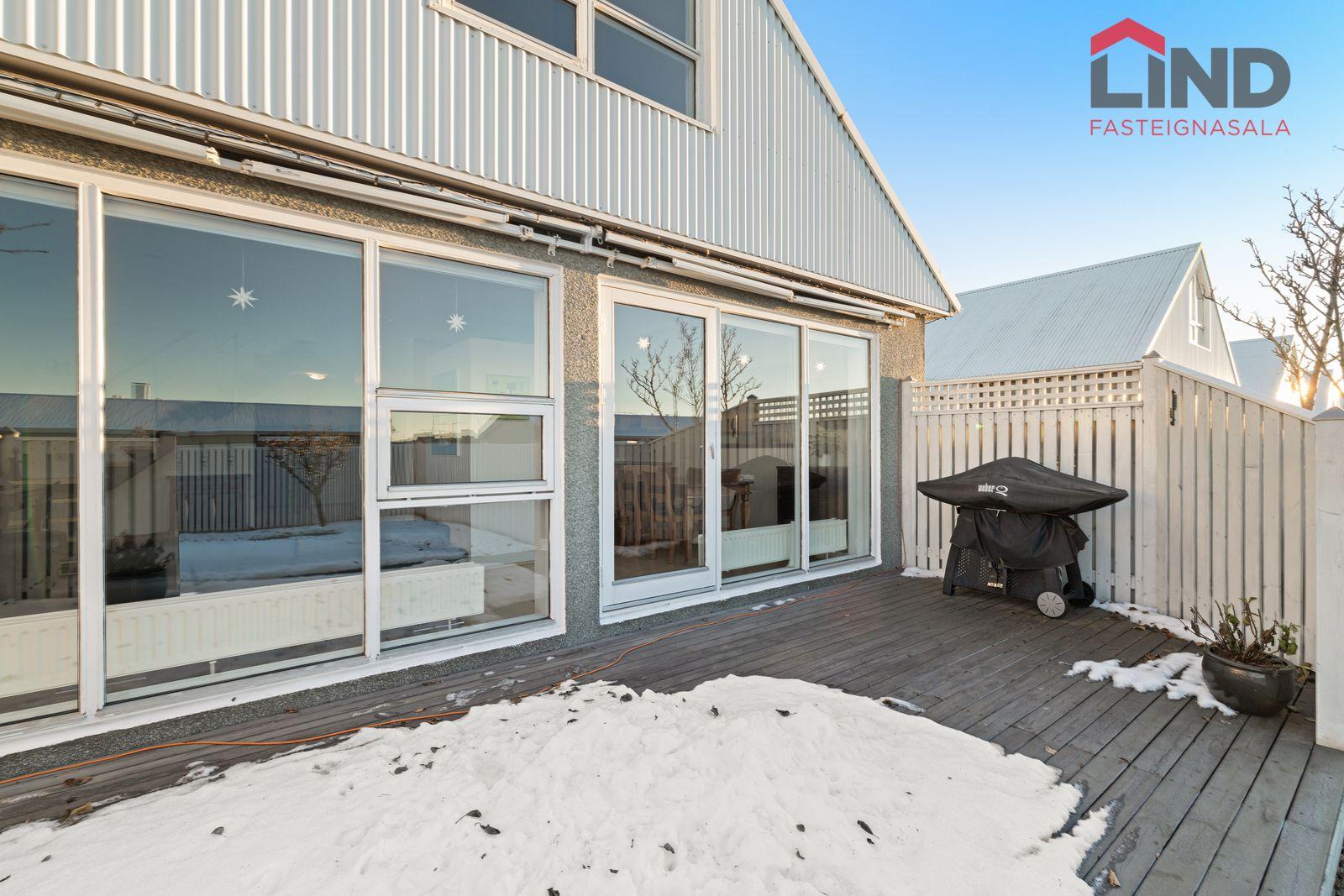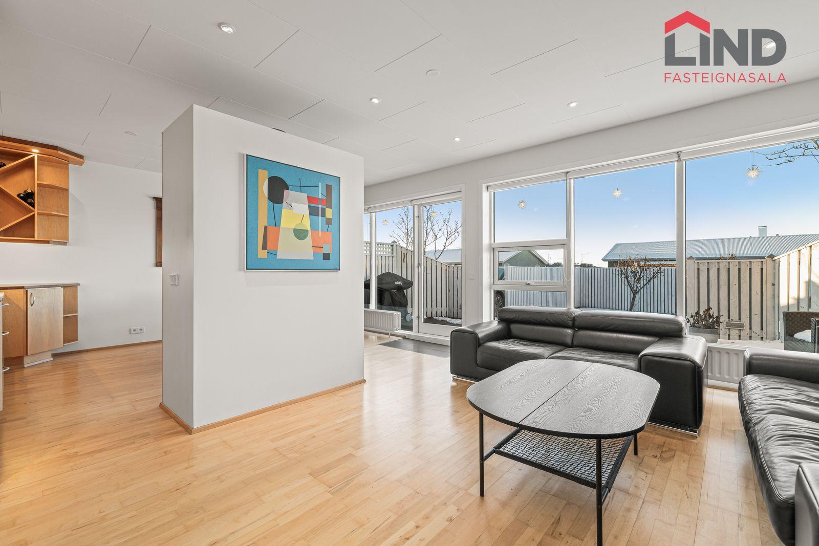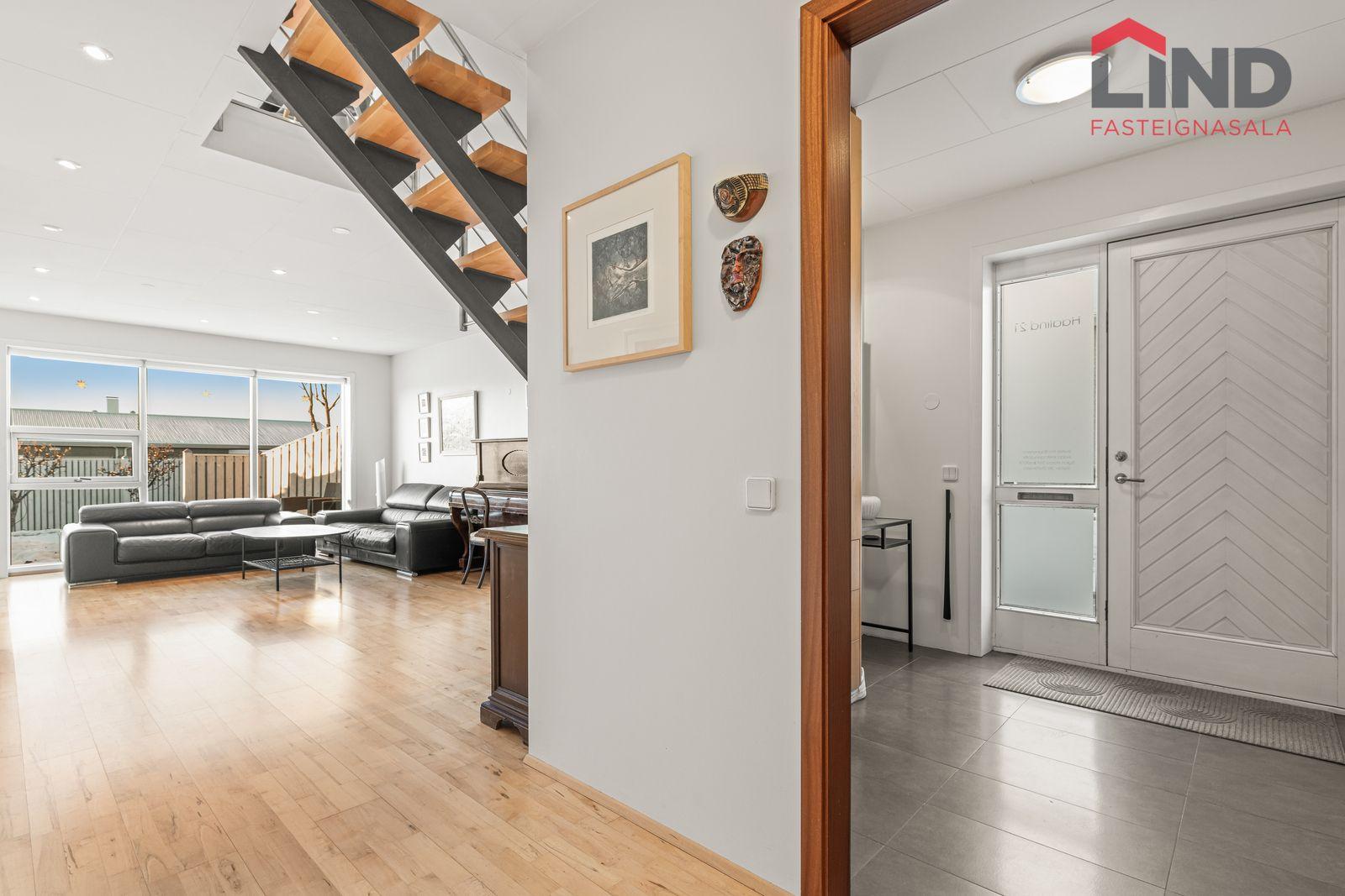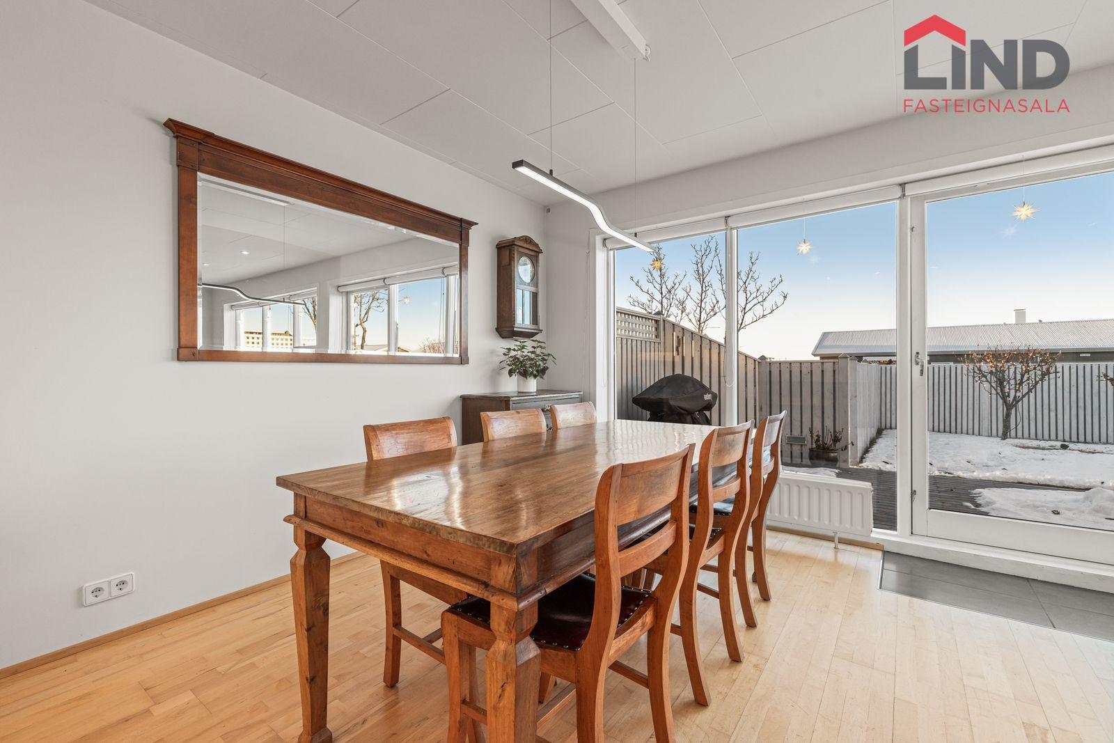 Nánari lýsing: Neðri hæð: Forstofa: Er rúmgóð með flísum á gólfi og skápum. Stofa: Með parketi á gólfi og stórum gólfsíðum gluggum til vesturs. Stofa rúmar vel setustofu og borðstofu. Innfeld lýsing í loftum. Útgengi úr stofu á afgirta verönd til suðvesturs. Eldhús: Er rúmgott með fallegri viðar eldhúsinnréttingu og góðu borðplássi. Nýlegur Bosch bakaraofn og nýleg Siemens uppþvottavél. Helluborð og lýsing undir efri skápum. Gólfsíðir gluggar til vesturs. Hjónaherbergi: Er rúmgott, með parketi á gólfi og skápum. Gluggi til austurs inn í bakgarð. Svefnherbergi II: Með parketi á gólfi, skápum og gluggum til norðurs og austurs. Svefnherbergi III: Með parketi á gólfi, skápum og glugga til austurs. Baðherbergi I: Er rúmgott með flísum á gólfi og veggjum. Baðkar með sturtutækjum, sturta, upphengt salerni, innrétting við vask, opnanlegur gluggi og útloftun. Þvottaherbergi: Er rúmgott með flísum á gólfi. Vinnuborð og tengi fyrir þvottavél og þurrkara. Útgengi á baklóð frá þvottaherbergi. Gangur (að bílskúr): Með flísum á gólfi og skápum.