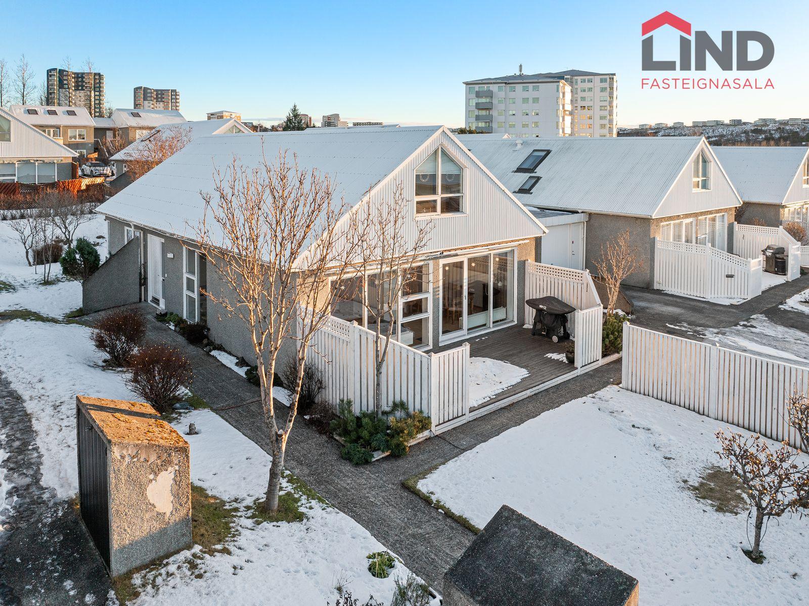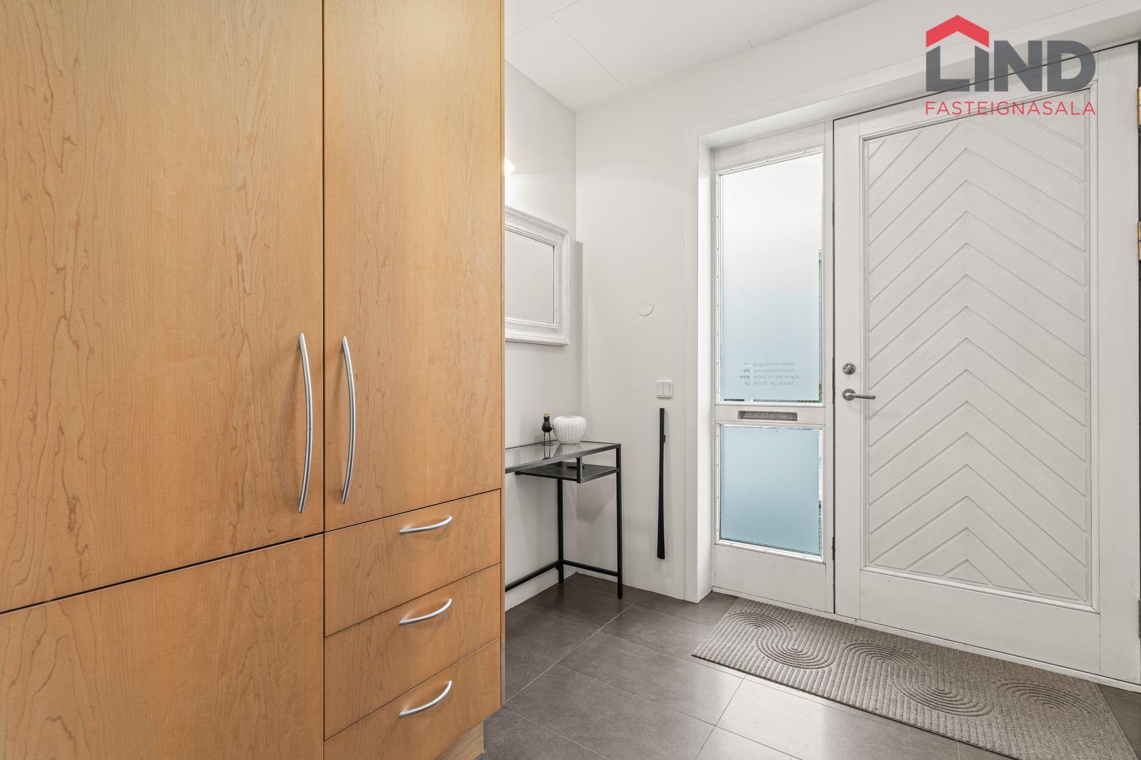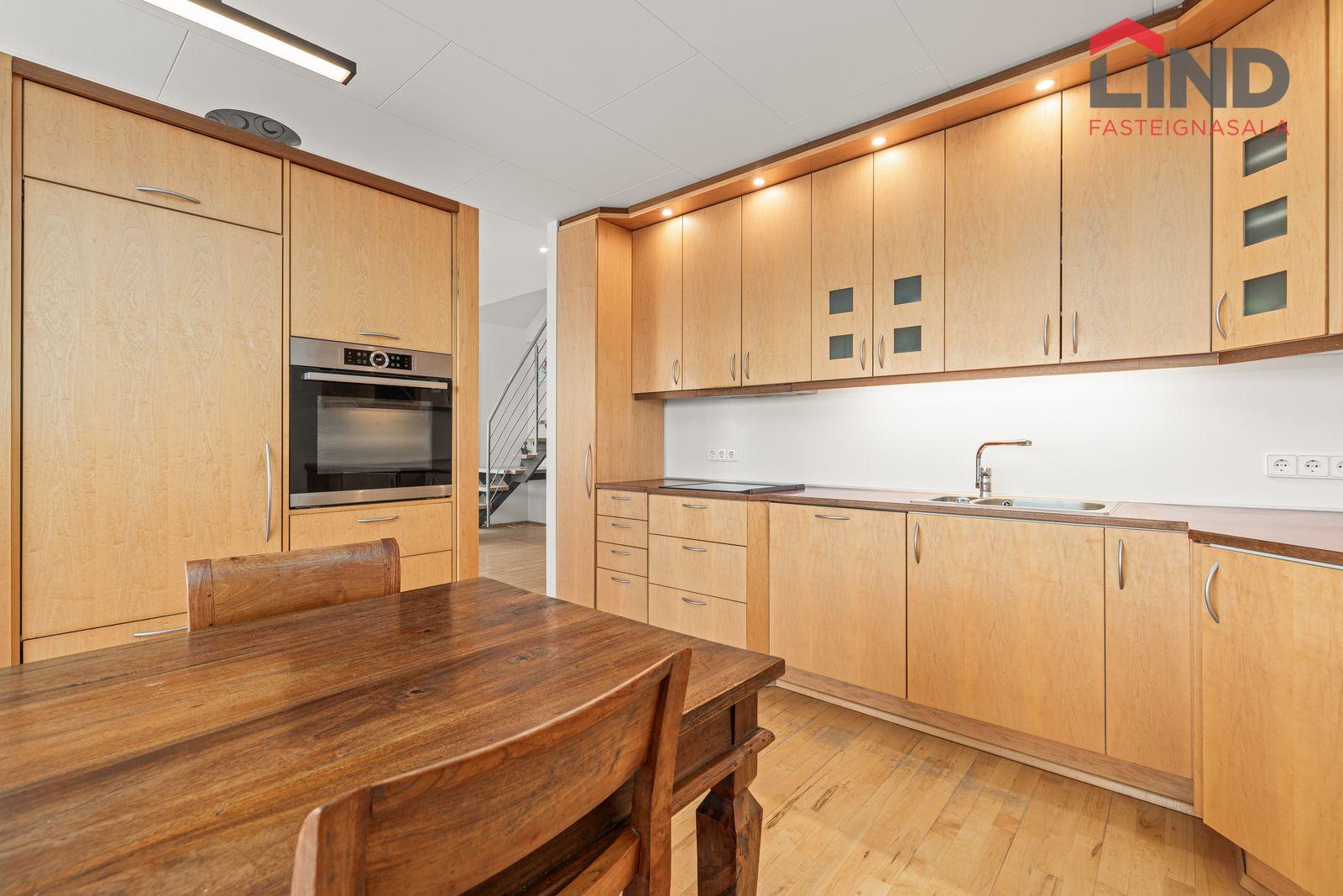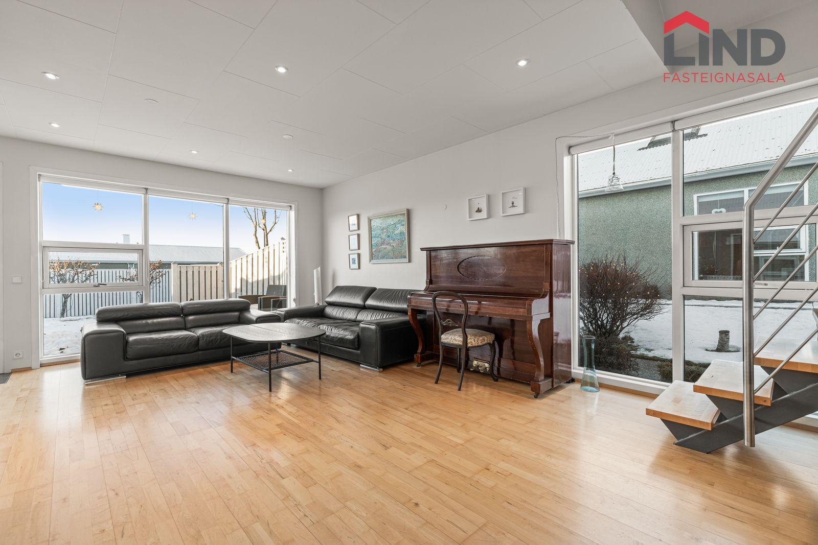 Nánari lýsing: Neðri hæð: Forstofa: Er rúmgóð með flísum á gólfi og skápum. Stofa: Með parketi á gólfi og stórum gólfsíðum gluggum til vesturs. Stofa rúmar vel setustofu og borðstofu. Innfeld lýsing í loftum. Útgengi úr stofu á afgirta verönd til suðvesturs. Eldhús: Er rúmgott með fallegri viðar eldhúsinnréttingu og góðu borðplássi. Nýlegur Bosch bakaraofn og nýleg Siemens uppþvottavél. Helluborð og lýsing undir efri skápum. Gólfsíðir gluggar til vesturs. Hjónaherbergi: Er rúmgott, með parketi á gólfi og skápum. Gluggi til austurs inn í bakgarð. Svefnherbergi II: Með parketi á gólfi, skápum og gluggum til norðurs og austurs. Svefnherbergi III: Með parketi á gólfi, skápum og glugga til austurs. Baðherbergi I: Er rúmgott með flísum á gólfi og veggjum. Baðkar með sturtutækjum, sturta, upphengt salerni, innrétting við vask, opnanlegur gluggi og útloftun. Þvottaherbergi: Er rúmgott með flísum á gólfi. Vinnuborð og tengi fyrir þvottavél og þurrkara. Útgengi á baklóð frá þvottaherbergi. Gangur (að bílskúr): Með flísum á gólfi og skápum.