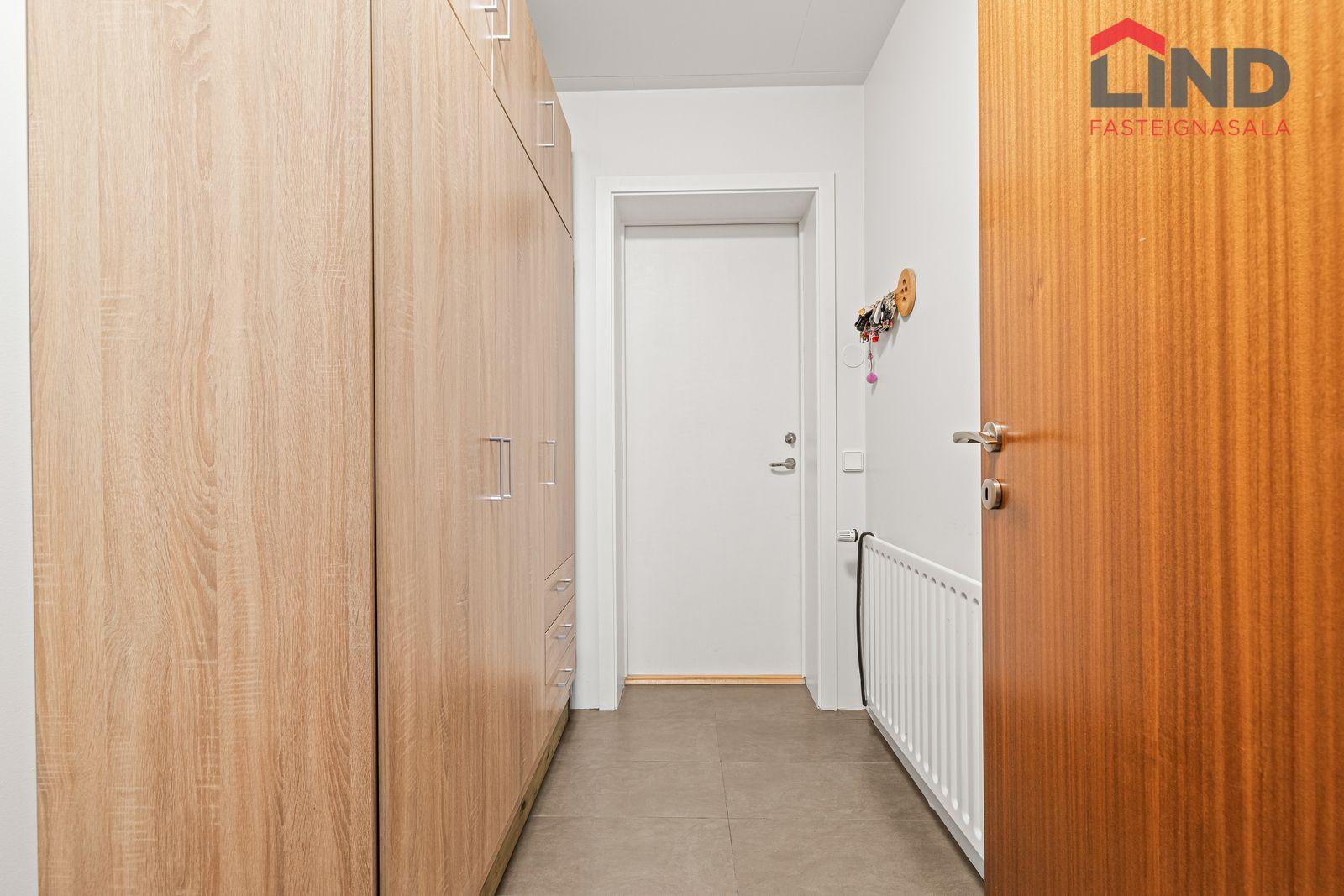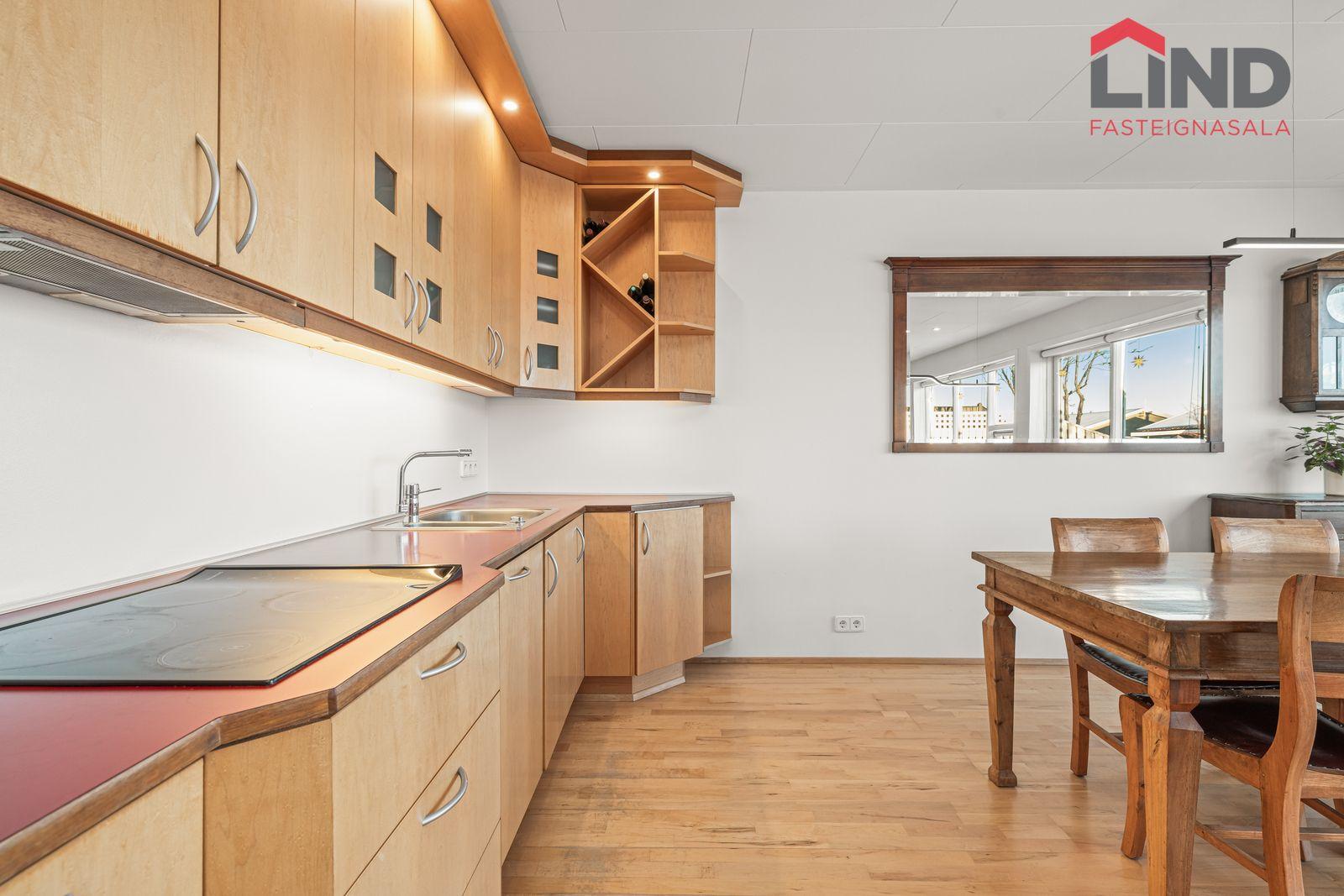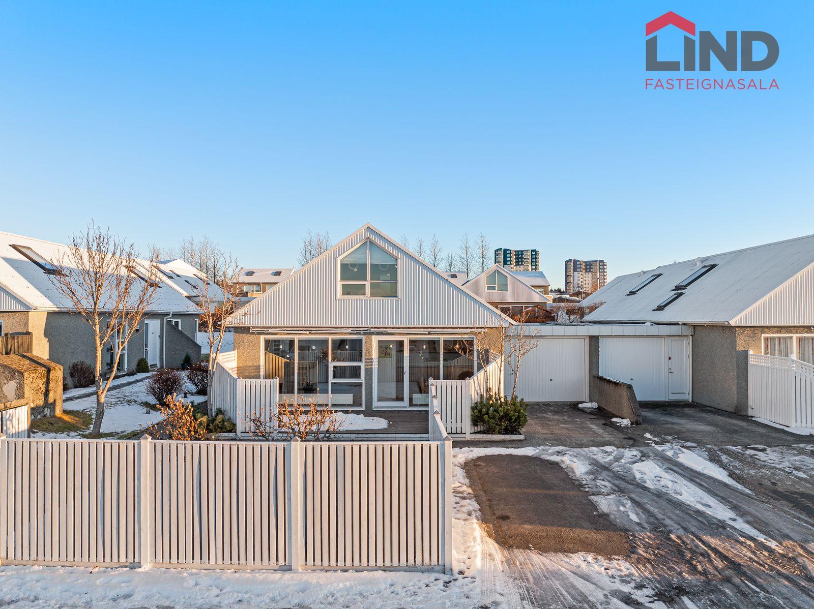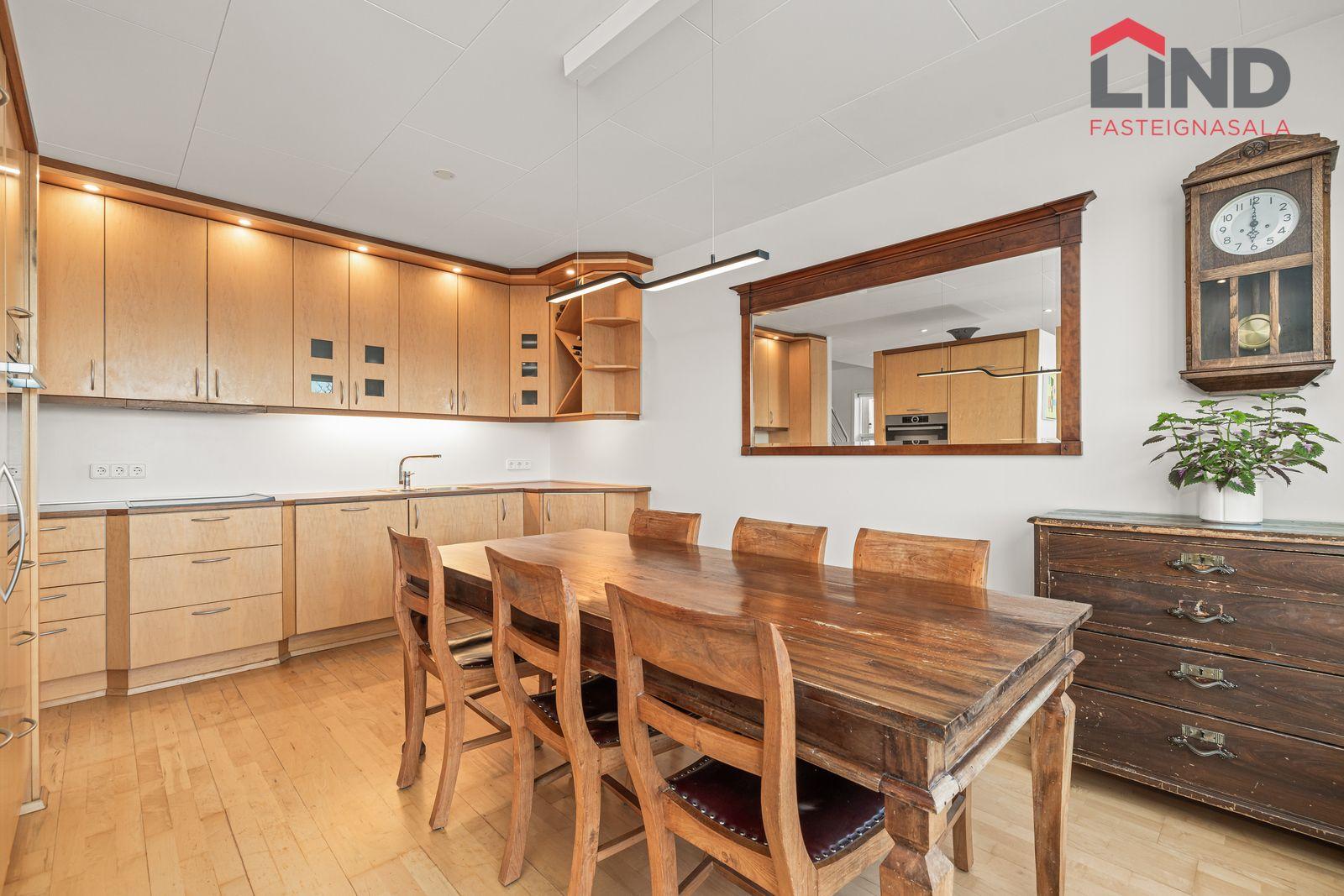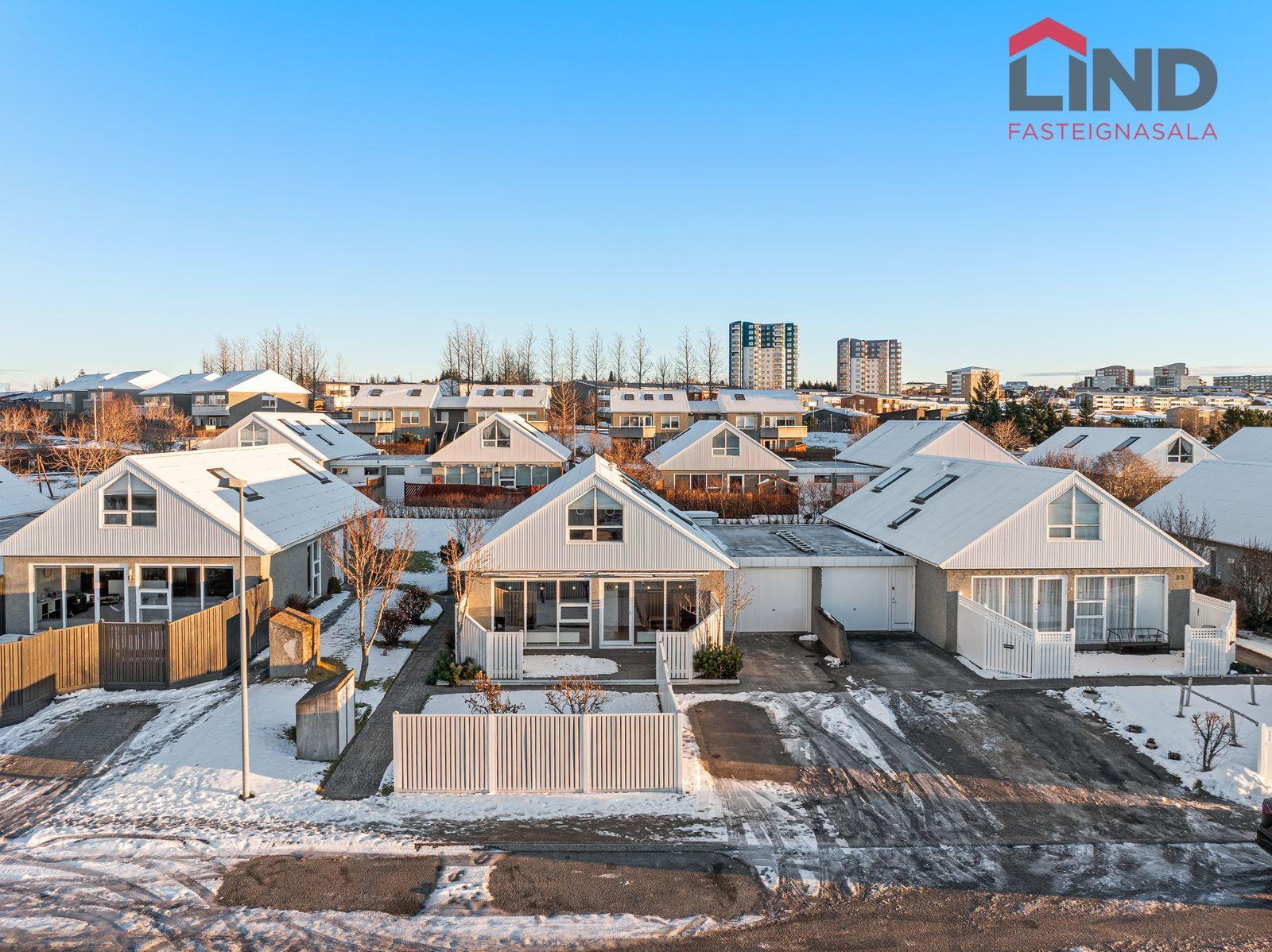 Nánari lýsing: Neðri hæð: Forstofa: Er rúmgóð með flísum á gólfi og skápum. Stofa: Með parketi á gólfi og stórum gólfsíðum gluggum til vesturs. Stofa rúmar vel setustofu og borðstofu. Innfeld lýsing í loftum. Útgengi úr stofu á afgirta verönd til suðvesturs. Eldhús: Er rúmgott með fallegri viðar eldhúsinnréttingu og góðu borðplássi. Nýlegur Bosch bakaraofn og nýleg Siemens uppþvottavél. Helluborð og lýsing undir efri skápum. Gólfsíðir gluggar til vesturs. Hjónaherbergi: Er rúmgott, með parketi á gólfi og skápum. Gluggi til austurs inn í bakgarð. Svefnherbergi II: Með parketi á gólfi, skápum og gluggum til norðurs og austurs. Svefnherbergi III: Með parketi á gólfi, skápum og glugga til austurs. Baðherbergi I: Er rúmgott með flísum á gólfi og veggjum. Baðkar með sturtutækjum, sturta, upphengt salerni, innrétting við vask, opnanlegur gluggi og útloftun. Þvottaherbergi: Er rúmgott með flísum á gólfi. Vinnuborð og tengi fyrir þvottavél og þurrkara. Útgengi á baklóð frá þvottaherbergi. Gangur (að bílskúr): Með flísum á gólfi og skápum.