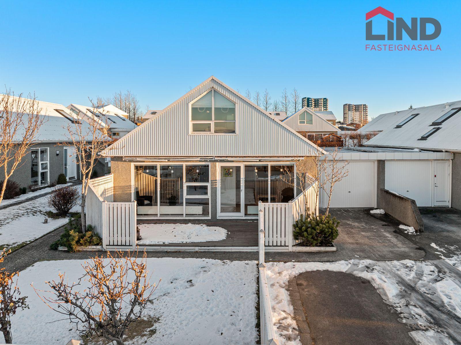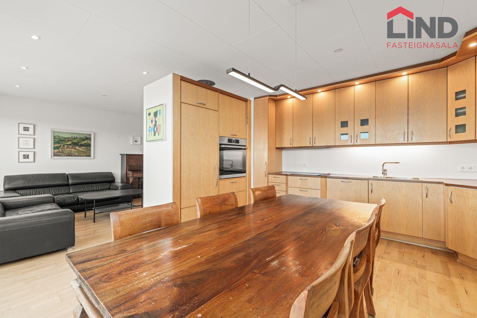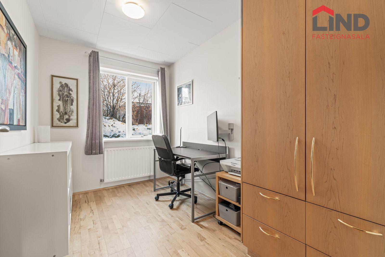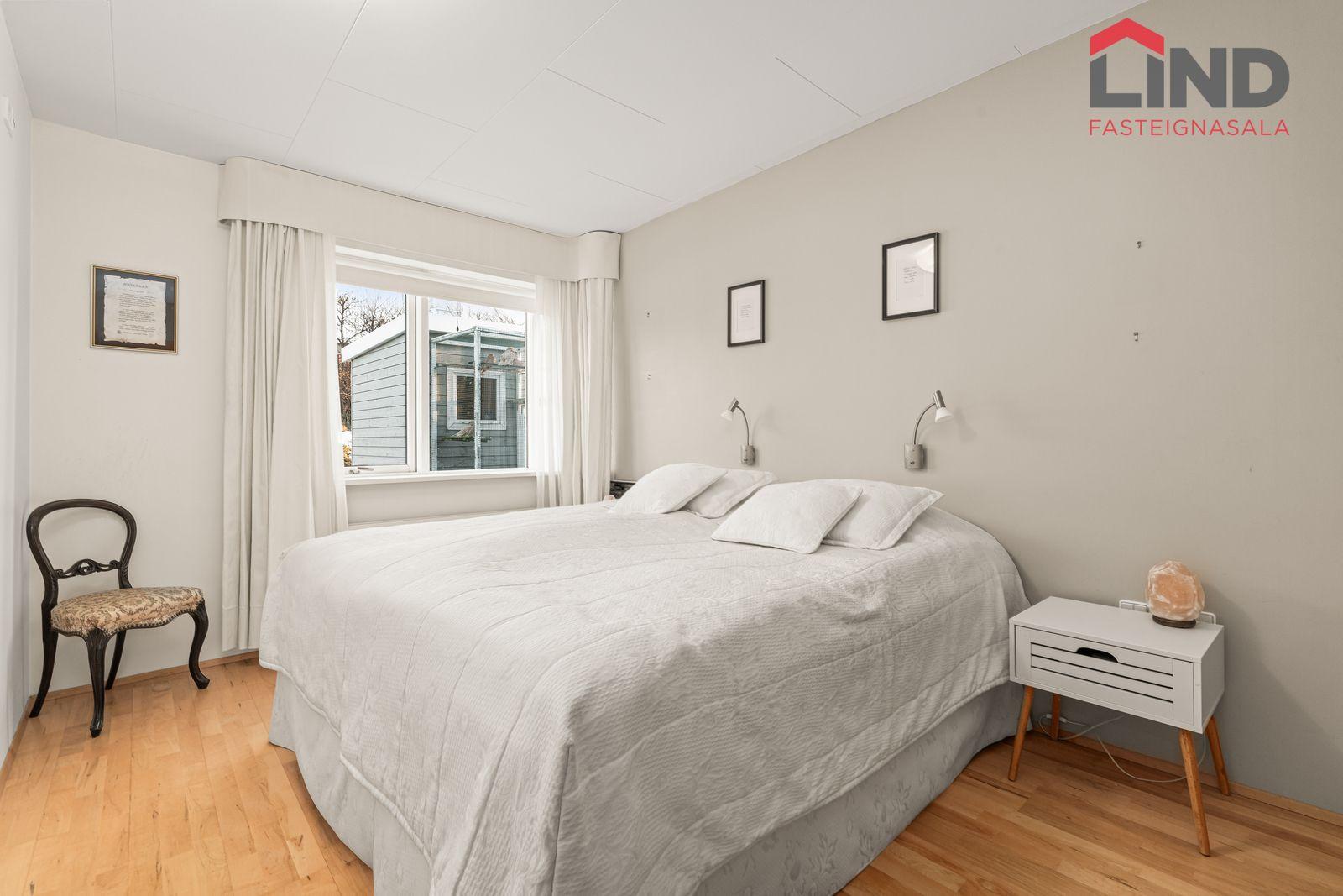 Nánari lýsing: Neðri hæð: Forstofa: Er rúmgóð með flísum á gólfi og skápum. Stofa: Með parketi á gólfi og stórum gólfsíðum gluggum til vesturs. Stofa rúmar vel setustofu og borðstofu. Innfeld lýsing í loftum. Útgengi úr stofu á afgirta verönd til suðvesturs. Eldhús: Er rúmgott með fallegri viðar eldhúsinnréttingu og góðu borðplássi. Nýlegur Bosch bakaraofn og nýleg Siemens uppþvottavél. Helluborð og lýsing undir efri skápum. Gólfsíðir gluggar til vesturs. Hjónaherbergi: Er rúmgott, með parketi á gólfi og skápum. Gluggi til austurs inn í bakgarð. Svefnherbergi II: Með parketi á gólfi, skápum og gluggum til norðurs og austurs. Svefnherbergi III: Með parketi á gólfi, skápum og glugga til austurs. Baðherbergi I: Er rúmgott með flísum á gólfi og veggjum. Baðkar með sturtutækjum, sturta, upphengt salerni, innrétting við vask, opnanlegur gluggi og útloftun. Þvottaherbergi: Er rúmgott með flísum á gólfi. Vinnuborð og tengi fyrir þvottavél og þurrkara. Útgengi á baklóð frá þvottaherbergi. Gangur (að bílskúr): Með flísum á gólfi og skápum.