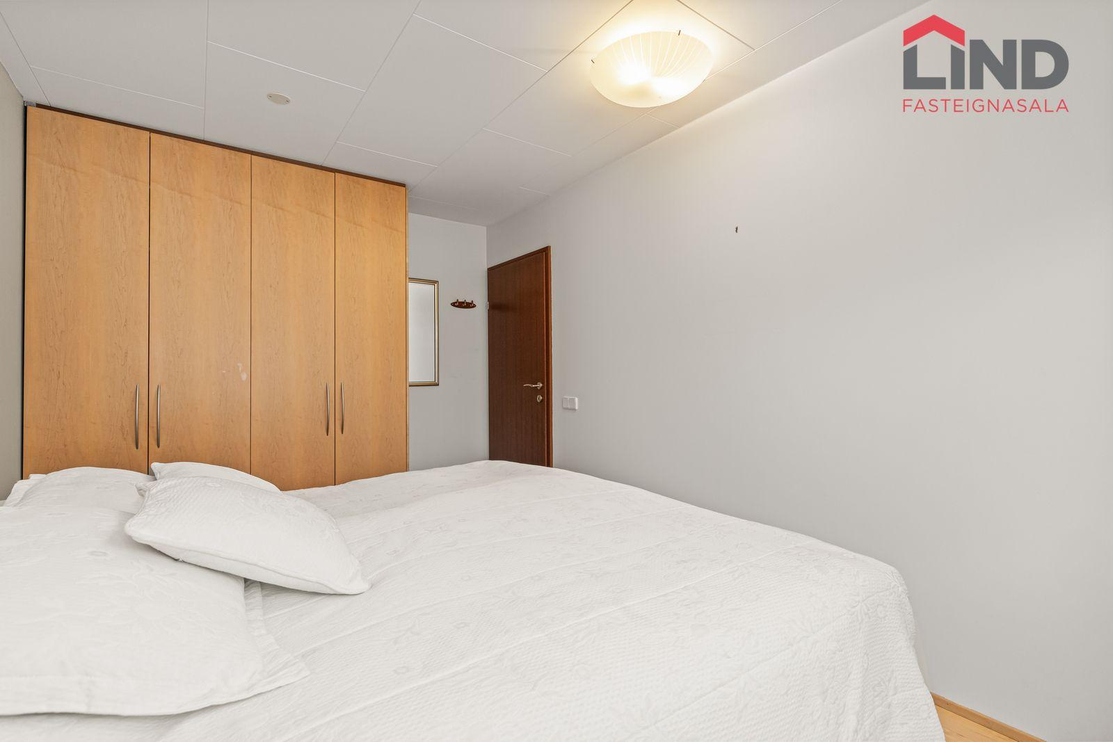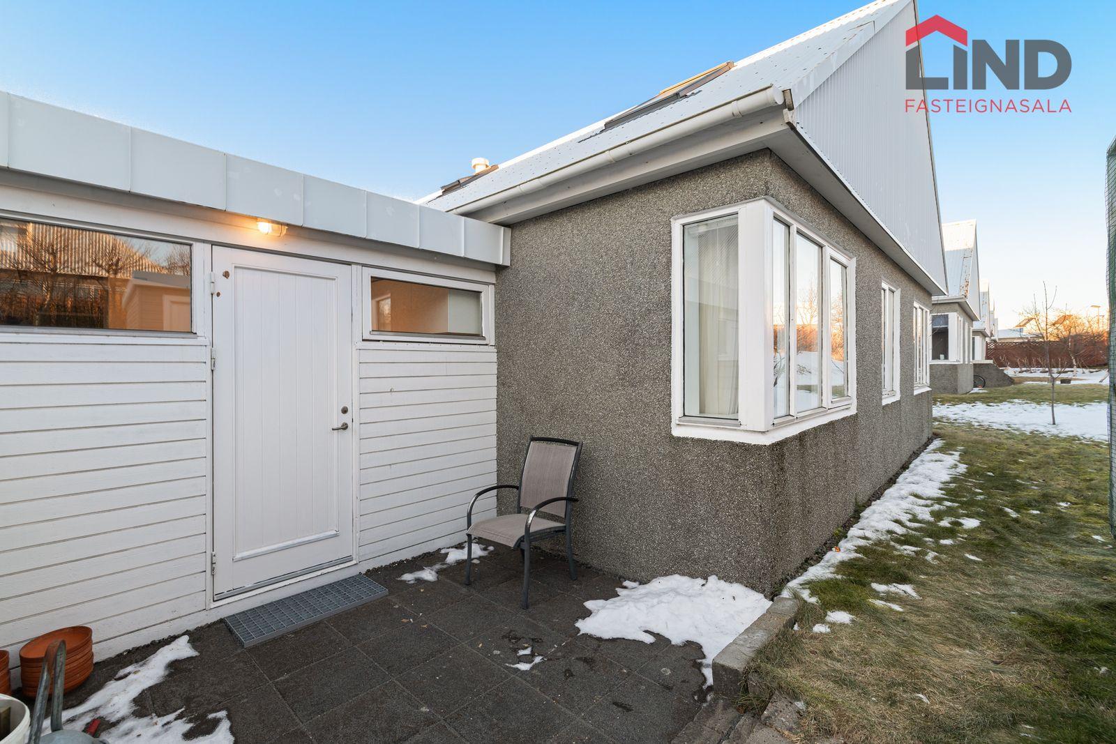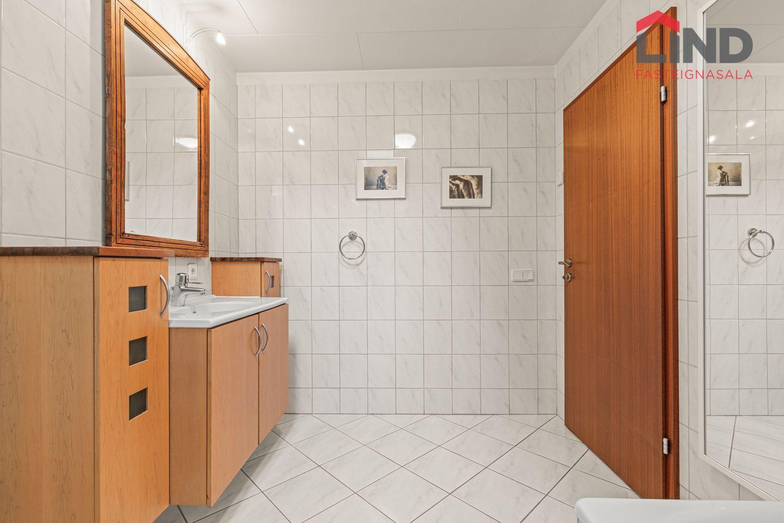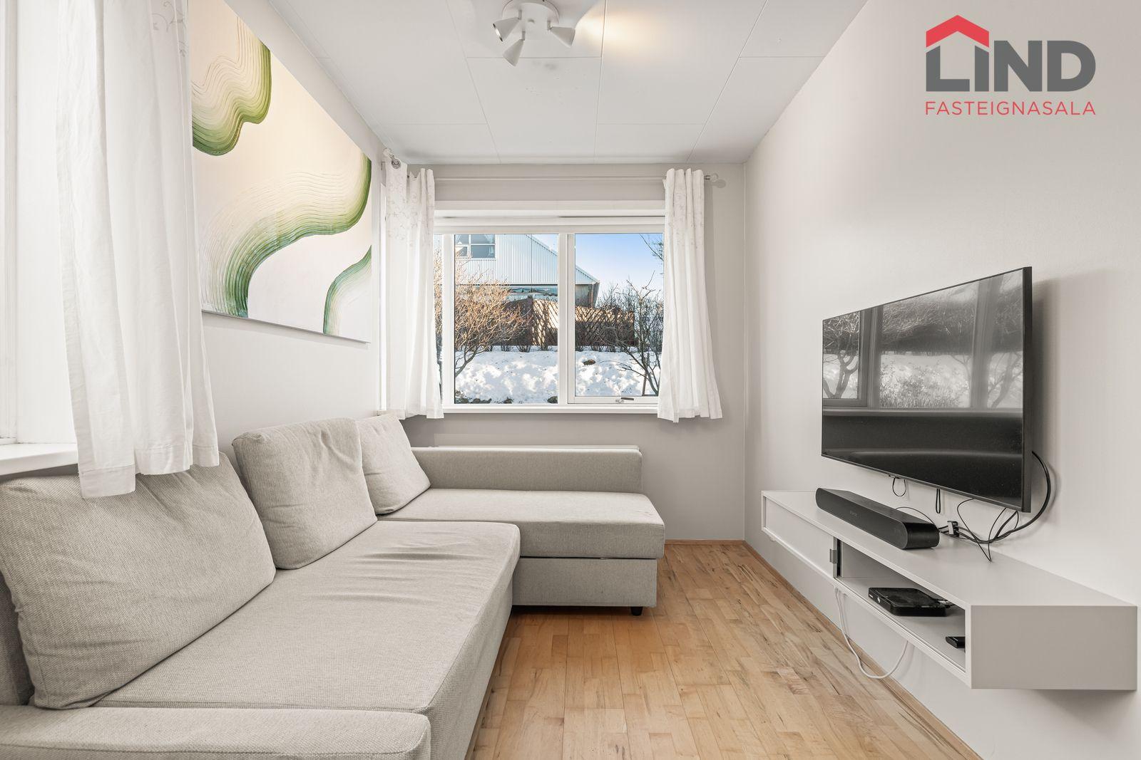 Nánari lýsing: Neðri hæð: Forstofa: Er rúmgóð með flísum á gólfi og skápum. Stofa: Með parketi á gólfi og stórum gólfsíðum gluggum til vesturs. Stofa rúmar vel setustofu og borðstofu. Innfeld lýsing í loftum. Útgengi úr stofu á afgirta verönd til suðvesturs. Eldhús: Er rúmgott með fallegri viðar eldhúsinnréttingu og góðu borðplássi. Nýlegur Bosch bakaraofn og nýleg Siemens uppþvottavél. Helluborð og lýsing undir efri skápum. Gólfsíðir gluggar til vesturs. Hjónaherbergi: Er rúmgott, með parketi á gólfi og skápum. Gluggi til austurs inn í bakgarð. Svefnherbergi II: Með parketi á gólfi, skápum og gluggum til norðurs og austurs. Svefnherbergi III: Með parketi á gólfi, skápum og glugga til austurs. Baðherbergi I: Er rúmgott með flísum á gólfi og veggjum. Baðkar með sturtutækjum, sturta, upphengt salerni, innrétting við vask, opnanlegur gluggi og útloftun. Þvottaherbergi: Er rúmgott með flísum á gólfi. Vinnuborð og tengi fyrir þvottavél og þurrkara. Útgengi á baklóð frá þvottaherbergi. Gangur (að bílskúr): Með flísum á gólfi og skápum.