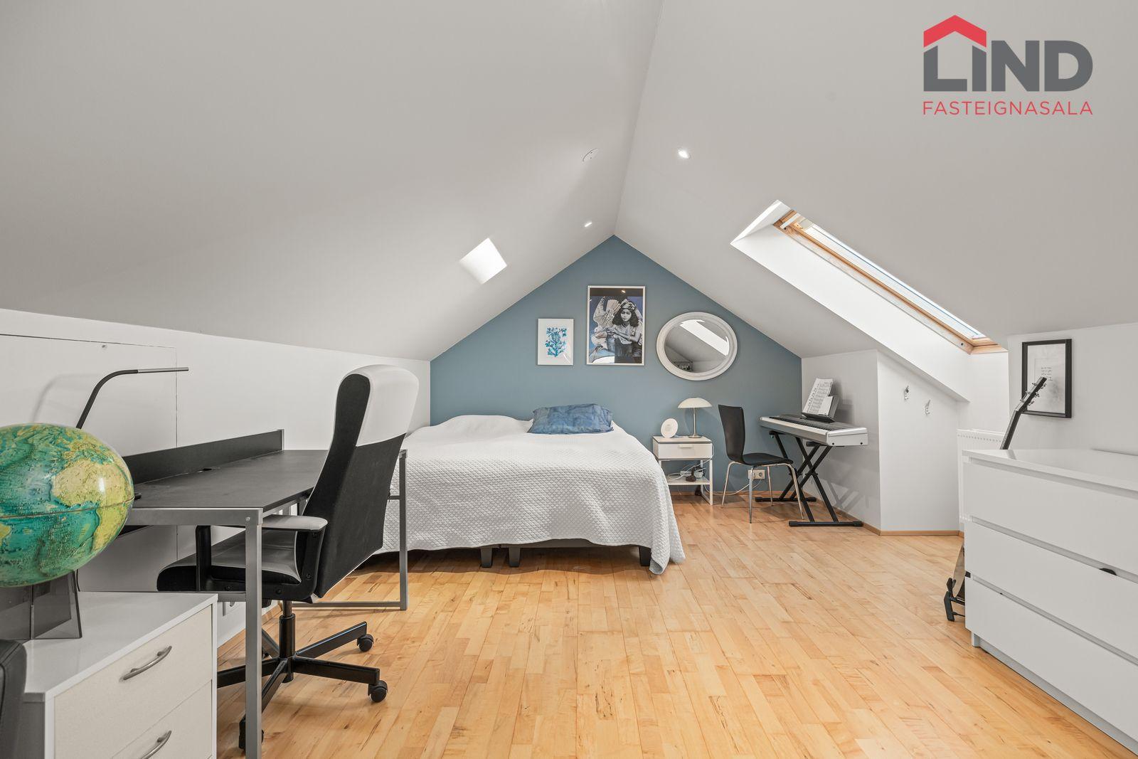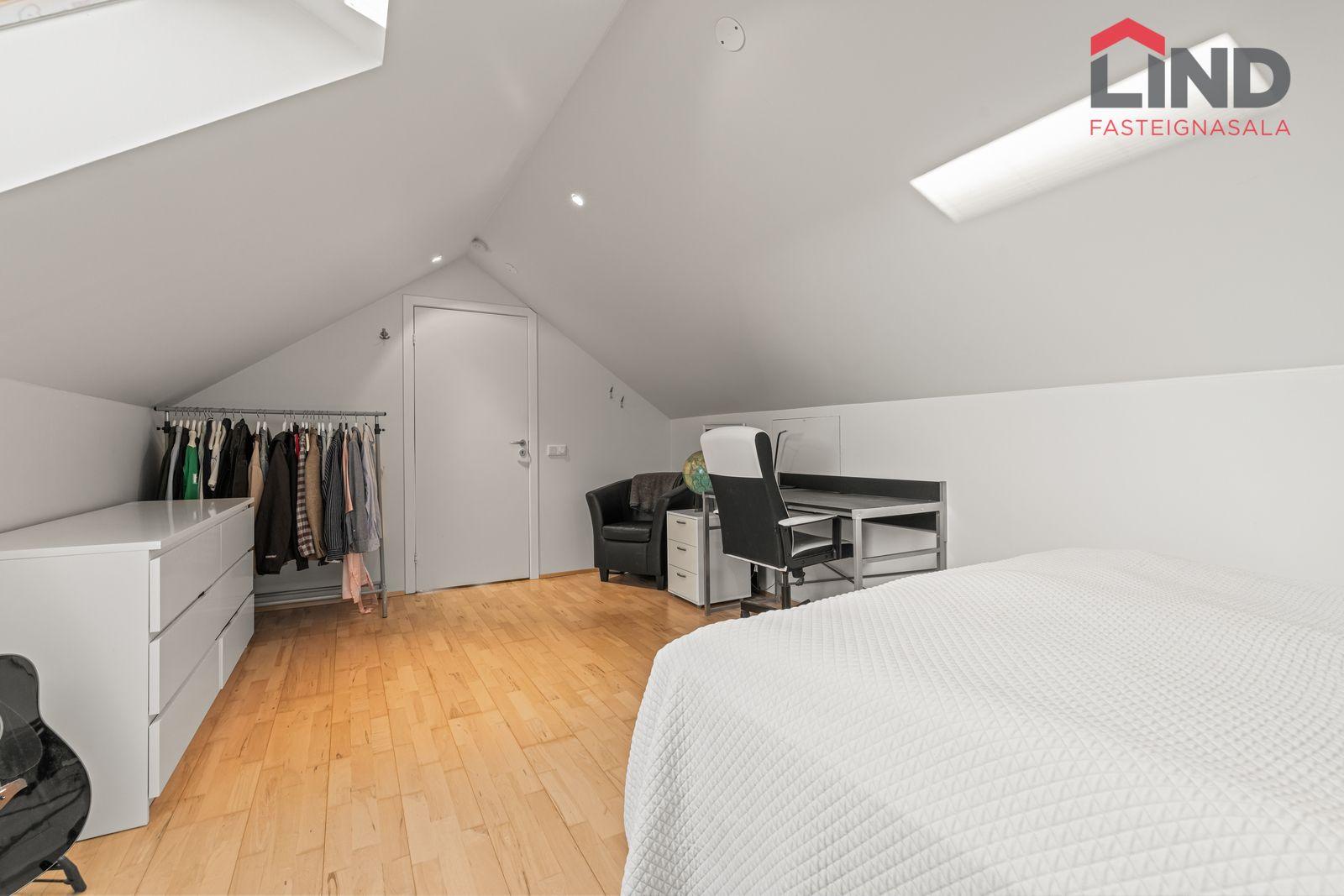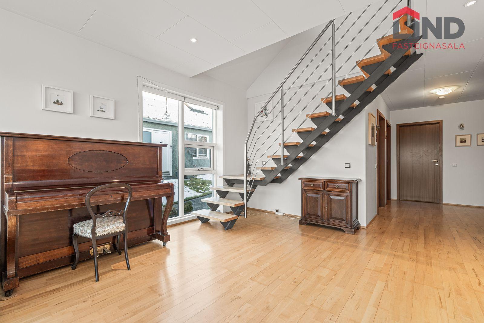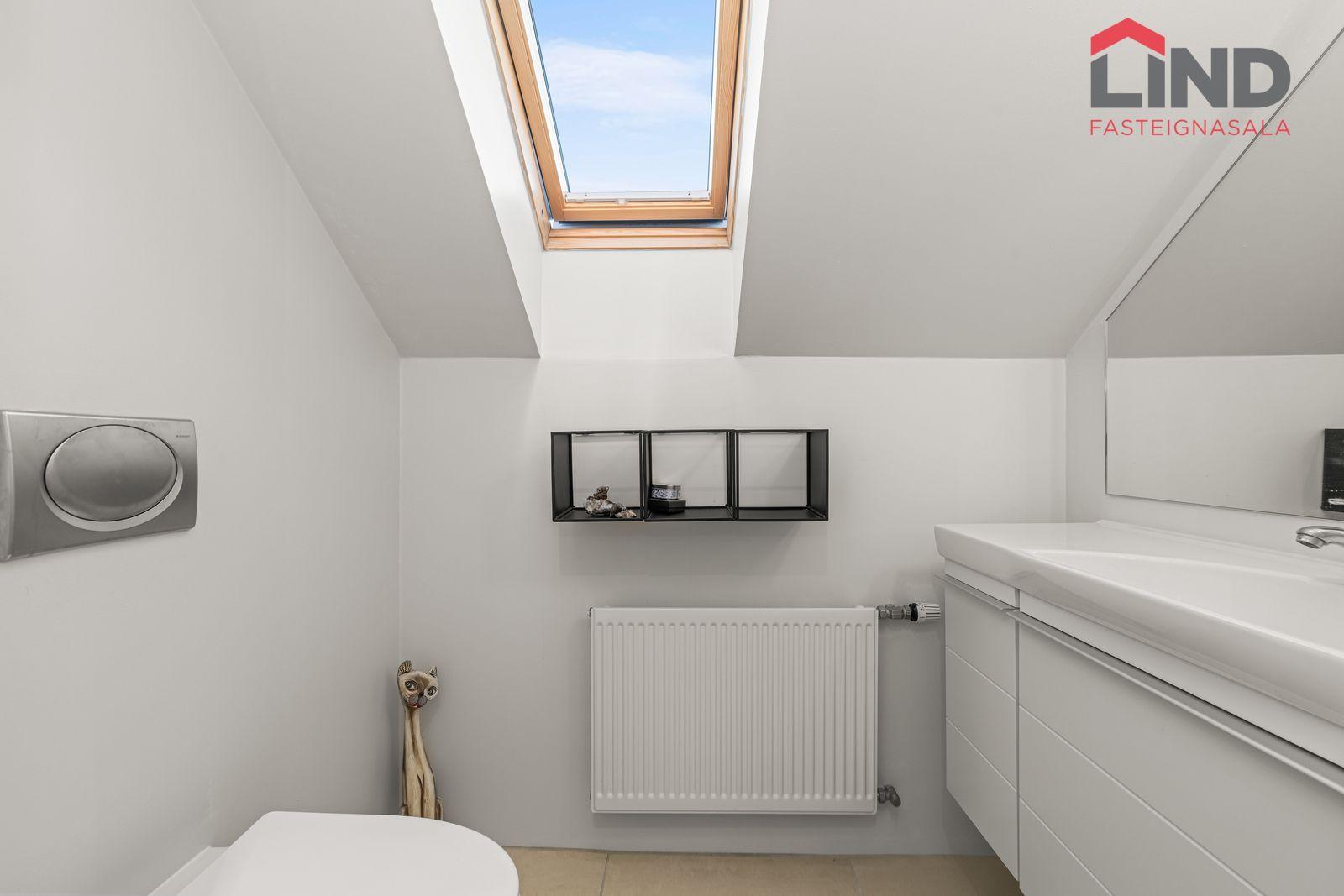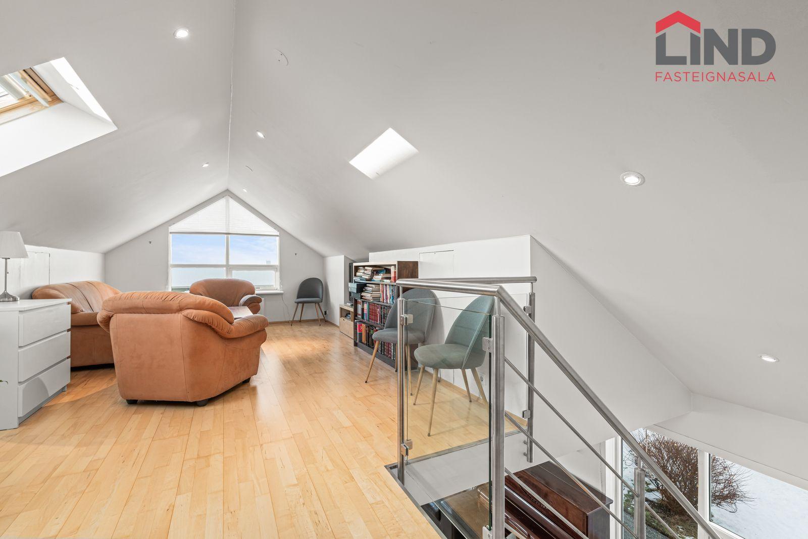 Efri hæð: Gengið upp á efri hæð um fallega stiga með stál handriði og gleri. Sjónvarpsstofa: Er rúmgóð með parketi á gólfi og innfelldri lýsingu í loftum. Gluggar til vestur og þakgluggi til suðurs. Möguleiki að nýta hluta sem auka svefnherbergi. Baðherbergi II: Með salerni, vask og glugga til suðurs. Svefnherbergi IV: Er stórt, með parketi á gólfi og velux gluggum til suðurs.