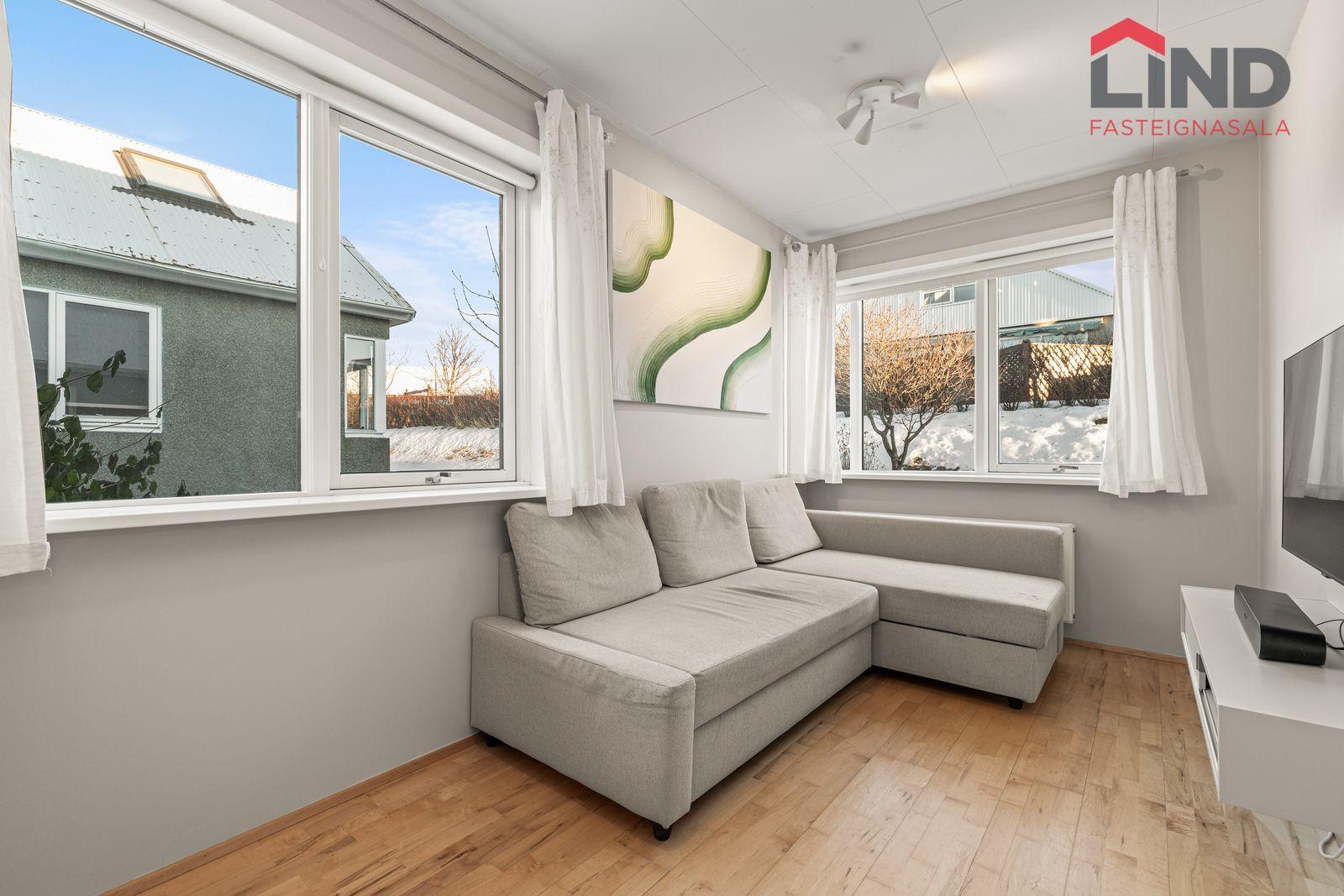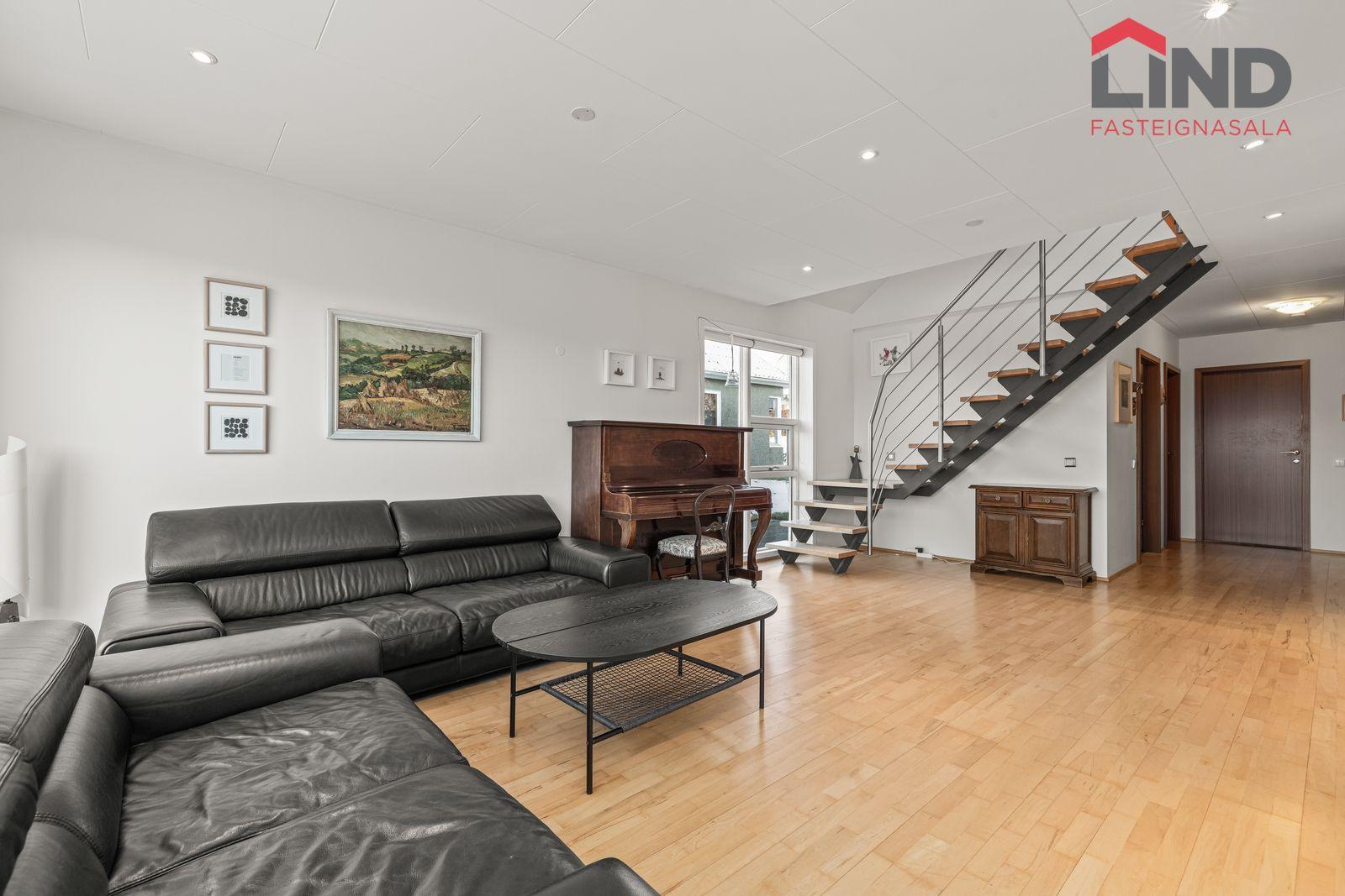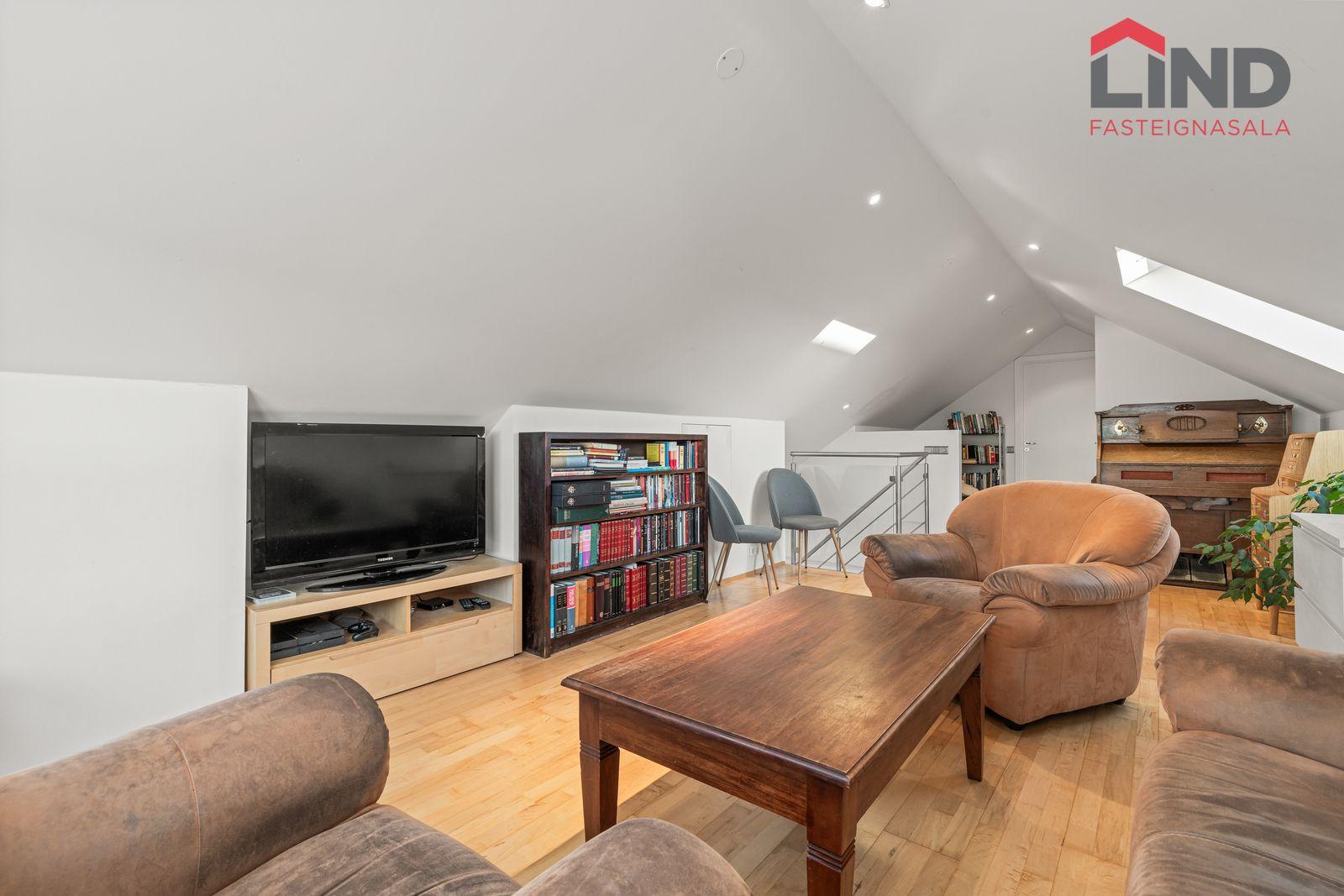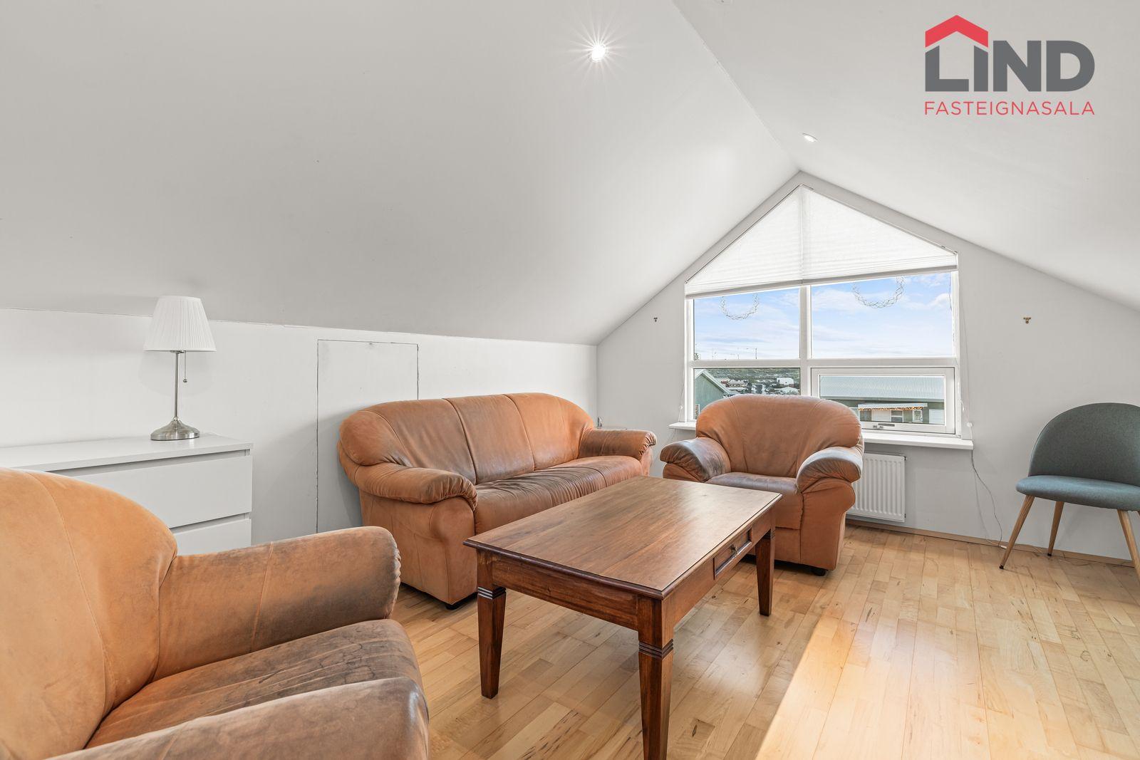 Efri hæð: Gengið upp á efri hæð um fallega stiga með stál handriði og gleri. Sjónvarpsstofa: Er rúmgóð með parketi á gólfi og innfelldri lýsingu í loftum. Gluggar til vestur og þakgluggi til suðurs. Möguleiki að nýta hluta sem auka svefnherbergi. Baðherbergi II: Með salerni, vask og glugga til suðurs. Svefnherbergi IV: Er stórt, með parketi á gólfi og velux gluggum til suðurs.