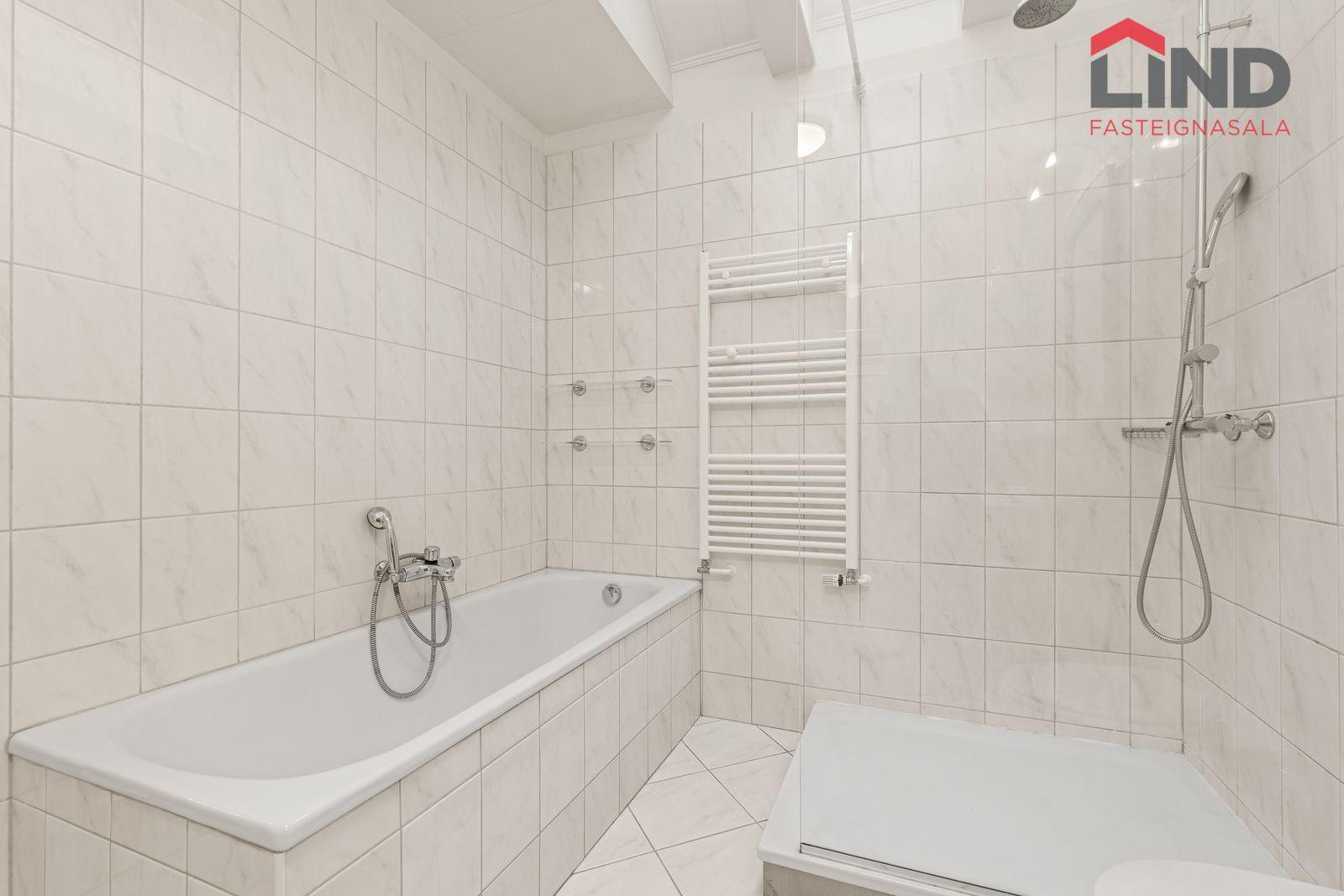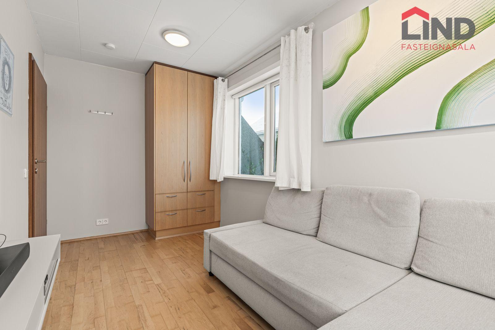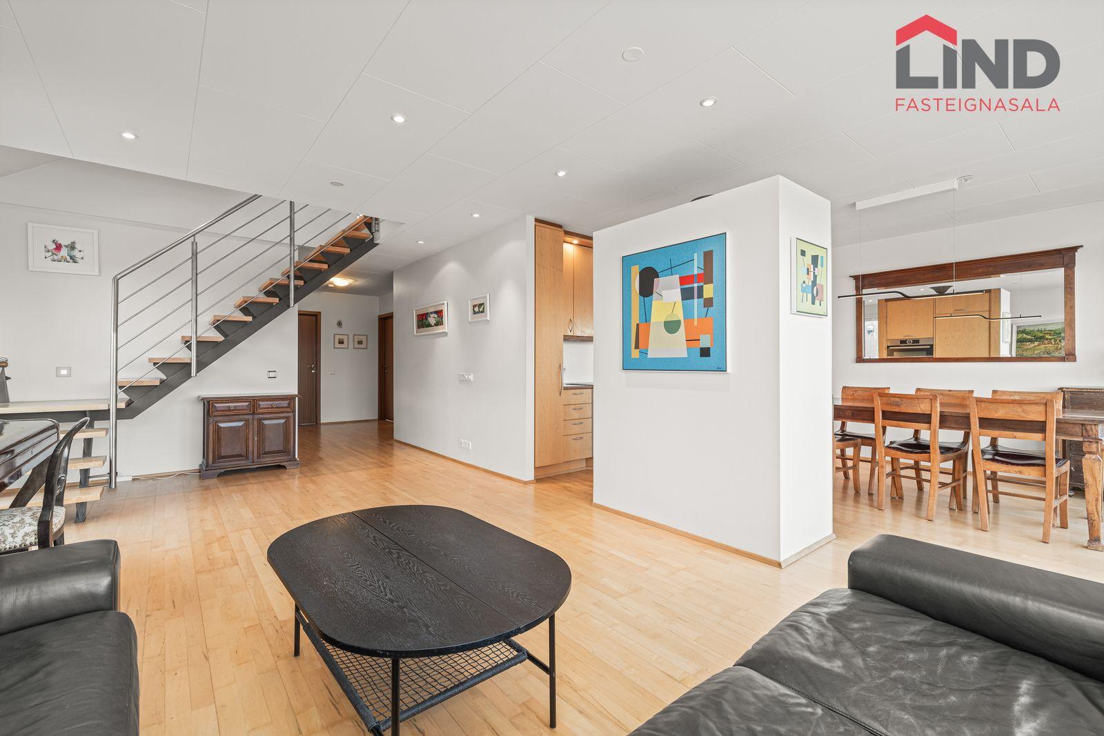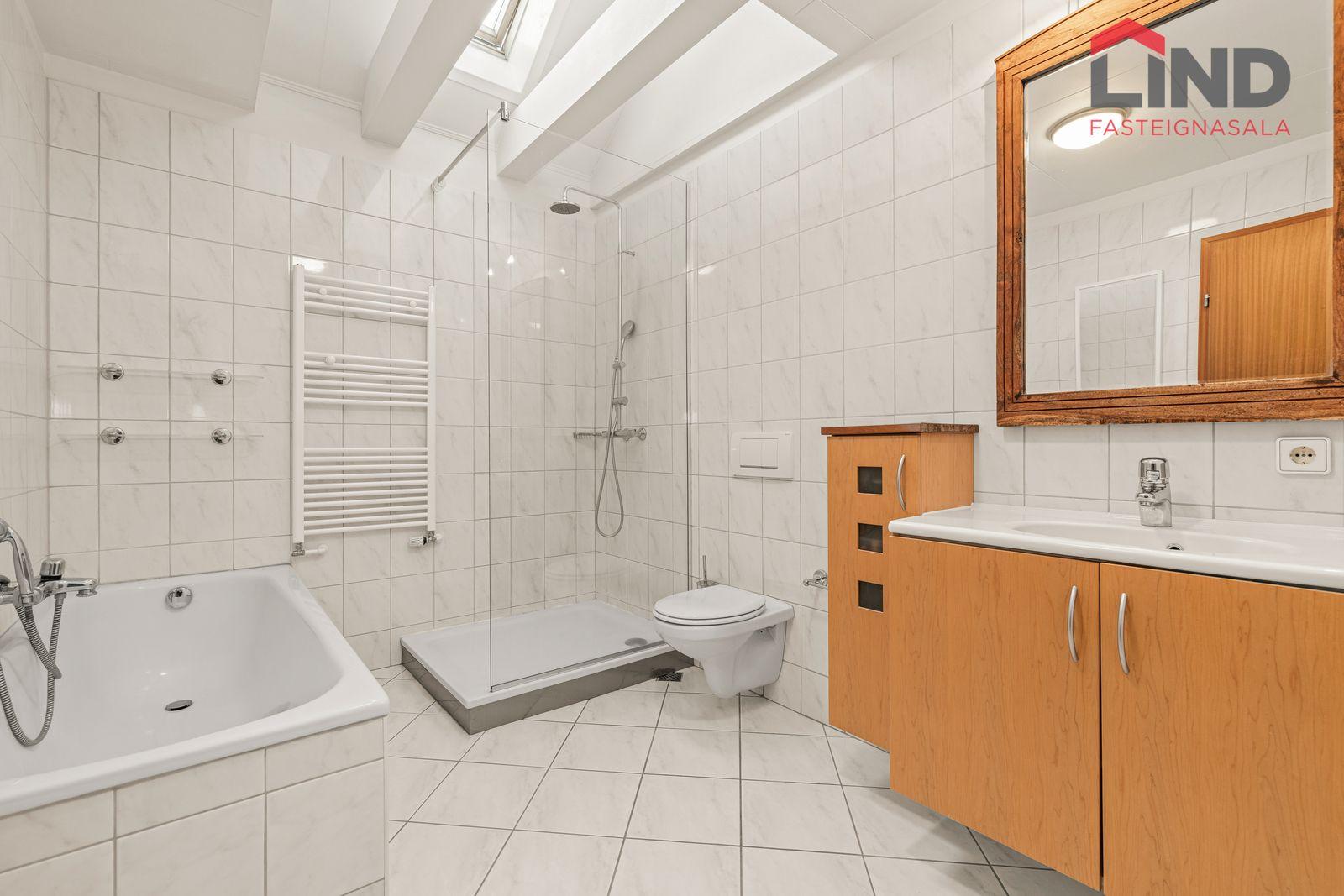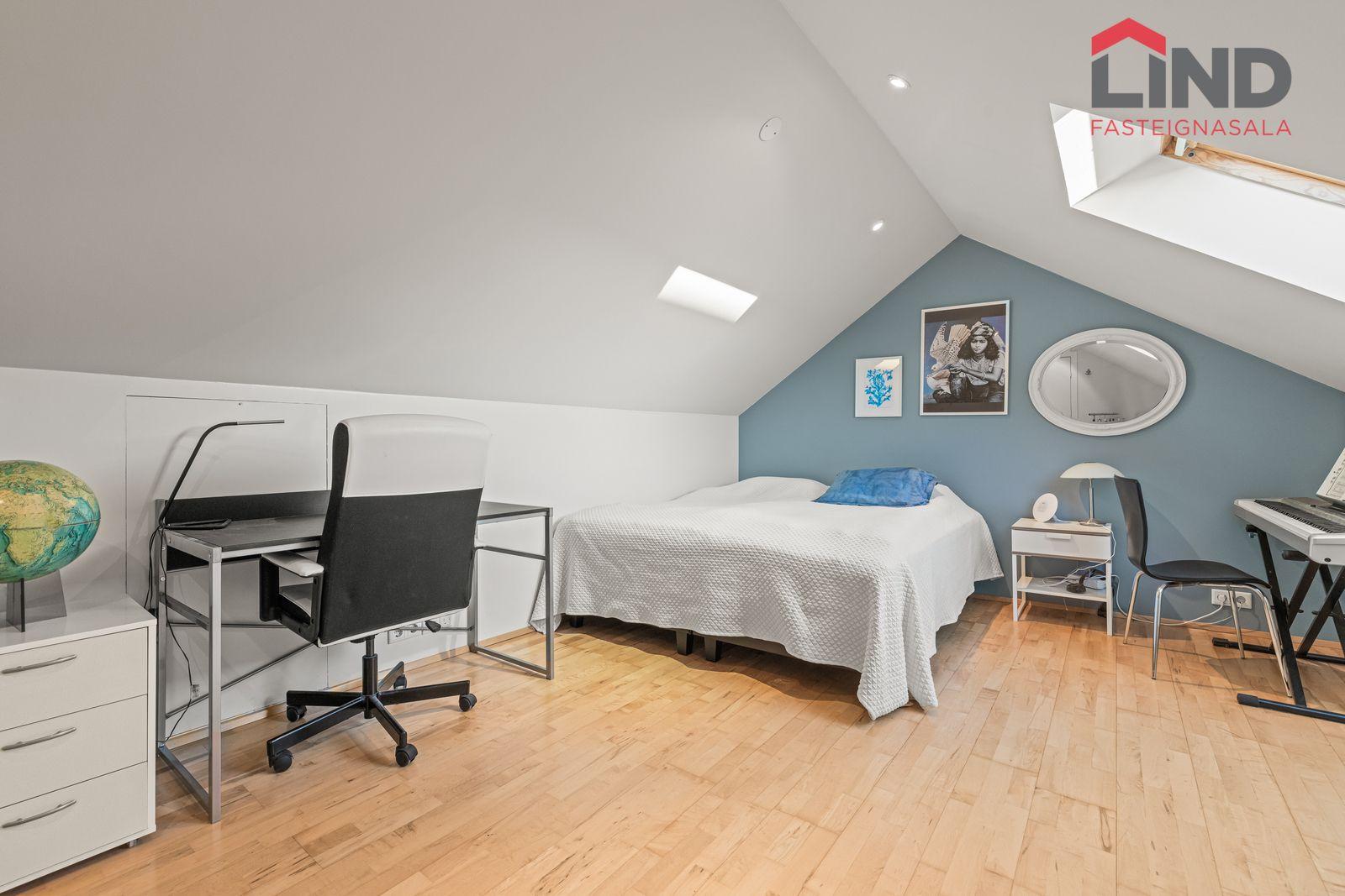 Efri hæð: Gengið upp á efri hæð um fallega stiga með stál handriði og gleri. Sjónvarpsstofa: Er rúmgóð með parketi á gólfi og innfelldri lýsingu í loftum. Gluggar til vestur og þakgluggi til suðurs. Möguleiki að nýta hluta sem auka svefnherbergi. Baðherbergi II: Með salerni, vask og glugga til suðurs. Svefnherbergi IV: Er stórt, með parketi á gólfi og velux gluggum til suðurs.