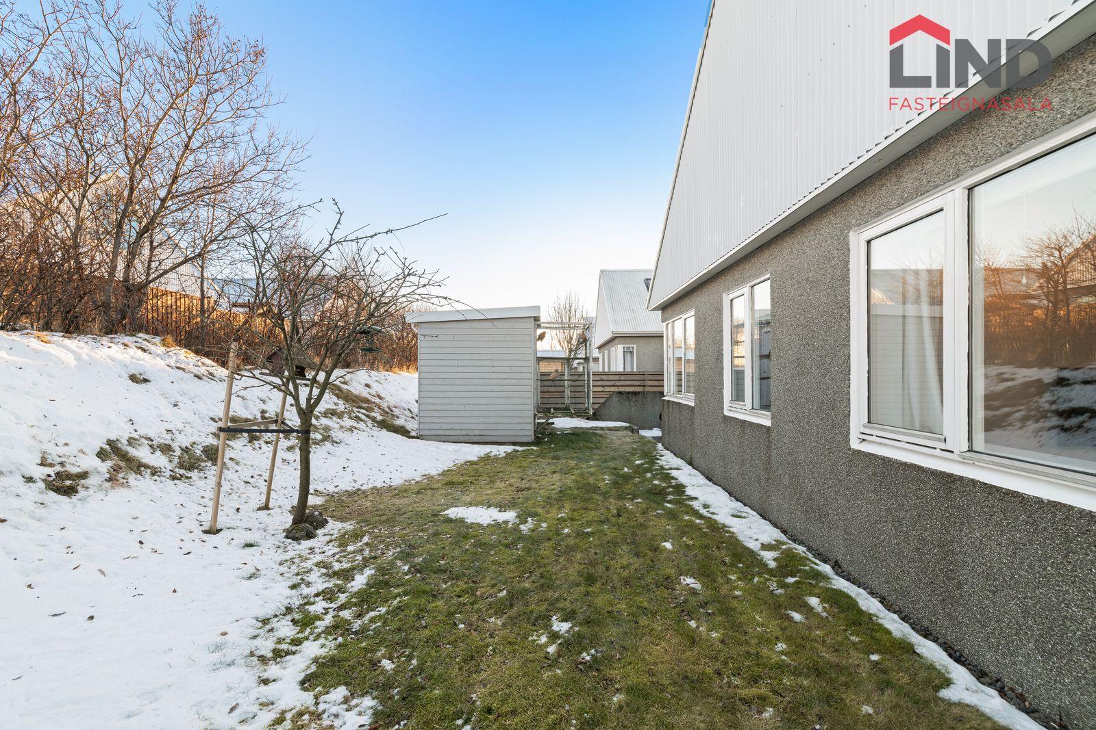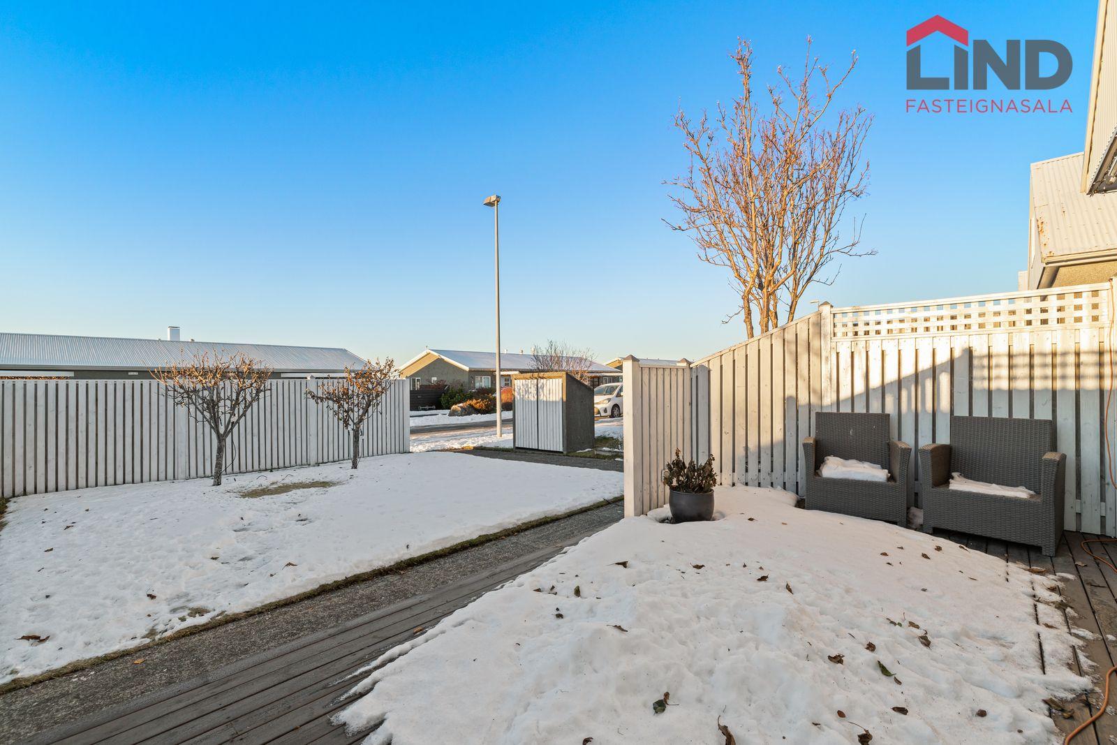 Lóðin er falleg og viðhaldslítil. steypt stétt og bílastæði með snjóbræðslu fyrir framan bílskúr og að húsi. Skjólgóð afgirt verönd til suðvesturs. Einangraður geymsluskúr er staðsettur á baklóð sem er um 5 fermetrar. Staðsetning hússins er afar góð í rólegri barnvænni götu (lokuðum botnlanga). Mikil nálægð við skóla, leikskóla, sundlaug, íþróttasvæði og golfvöll. Fallegar göngu- og hjólaleiðir allt í kring.