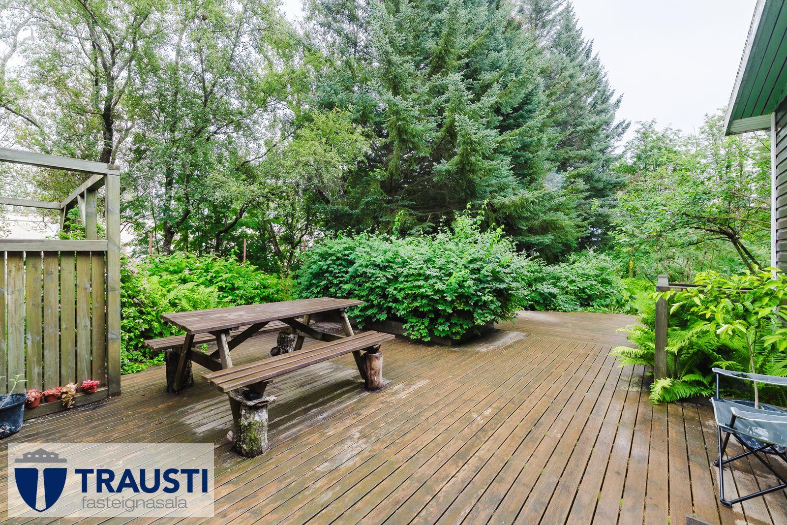 Það skiptist í stórt opið rými eldhúss með búr innaf, stofu og borðstofu með parketi á gólfi, stóra sólstofu, fjögur svefnherbergi, baðherbergi, rúmgott anddyri og stóran og vel góinn garð með palli.