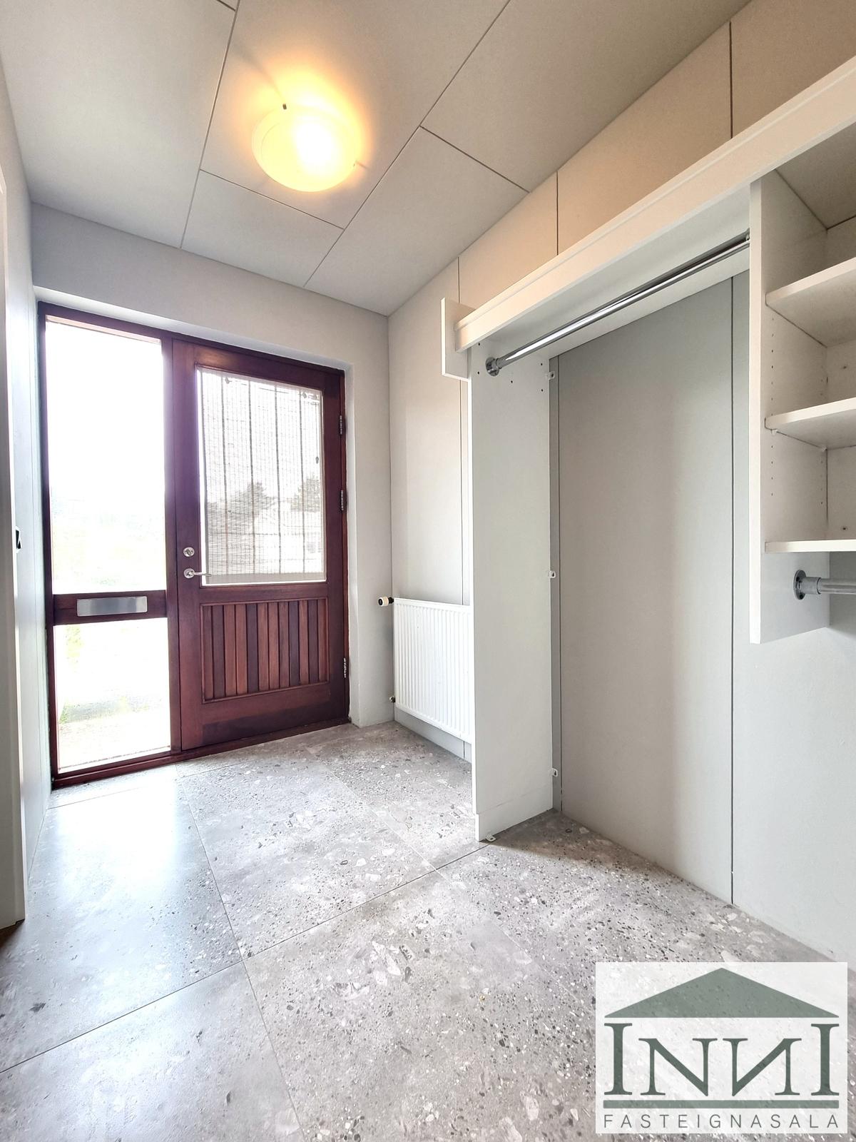 Vel skipulögð og flott endaíbúð í raðhúsi. Stofa og eldhús í opnu rými með nýlegt parket á gólfi og innréttingu frá 2021 í eldhúsi. Tvö svefnherbergi, flísalagt baðherbergi og útgengt í garð. Árið 2021 var skipt um öll gólfefni, innihurðir og flest ljós í húsinu. Þá var einnig skipt um blöndunartæki á baðherbergi og í eldhúsi sem og innréttingu, bakaraofn og helluborð í eldhúsi. Árið 2023 var skipt um hitakút í húsinu. Flísar eru í forstofu og þvottahúsi sem er inn af forstofu. Stofa og eldhús eru í opnu og rúmgóðu rými með parket á gólfi og útgengt í bakgarð. Í eldhúsi er nýleg og flott innrétting. Baðherbergi er flísalagt, þar er baðkar með sturtu í. Tvö svefnherbergi eru í íbúðinni, bæði með parket á gólfi og fataskápar eru í báðum herbergjum.