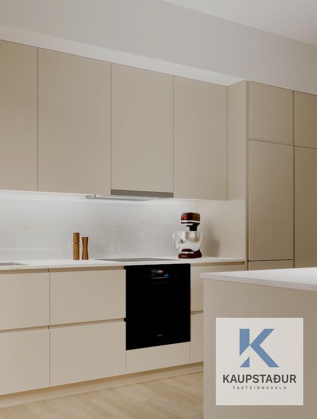 er góður fataskápur. Gengið er úr anddyri inn í rúmgott alrými með eldhúsi og stofu/borðstofu með útgengi á góðar svalir(vestur). Eldhús er með eyju. Ljós eldhúsinnrétting, ljósyrjóttur quartz-steinn á borðum og milli skápa og blöndunartæki úr burstuðu stáli. Innbyggður ísskápur. Rúmgott hjónaherbergi með góðum fataskápum og útgengi á svalir. Innaf alrými er gangur og tvö björt svefnherbergi,