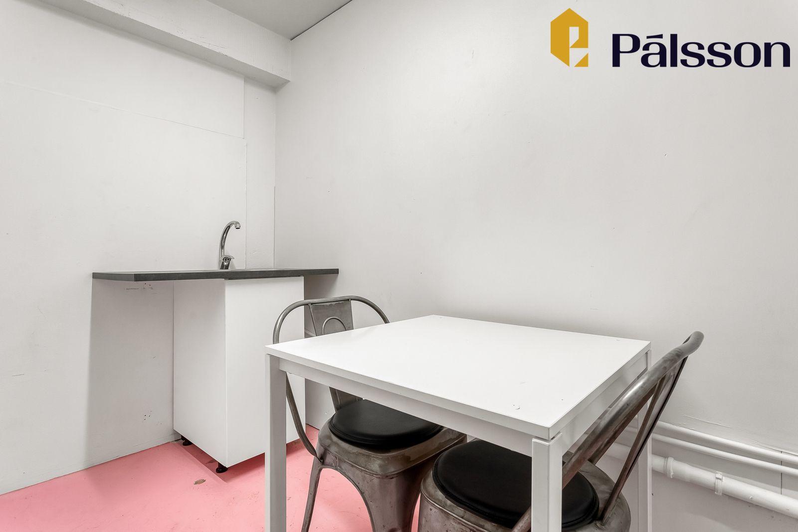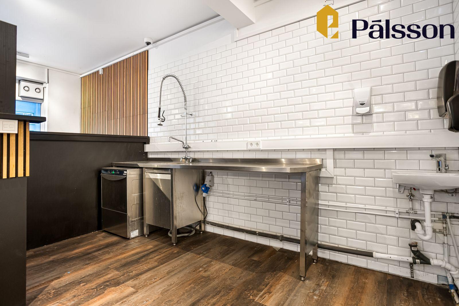 Jarðhæð er um 70 fm Hentar fyrir undirbúnings- eða þjónustuaðstöðu, eldhúsvinnu (háð leyfi) eða móttöku. Starfsmannaaðstaða með salerni. Parket á gólfi. Kjallari er um 110 fm Opið og fjölnota rými. málað gólf og hvítir veggir. Rýmið er vel upplýst og hentar fyrir ýmsa létta starfsemi, vinnuaðstöðu, list- eða skapandi rými, lager eða þjónustu. Tvö salerni eru í kjallara og geymslurými. Tekið skal fram að húsgögn voru fjarlægð af myndum með hjálp Photoshop.