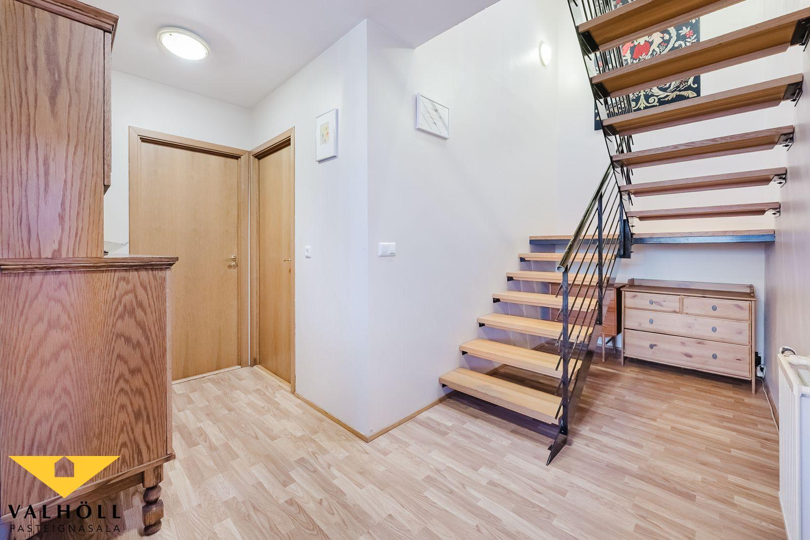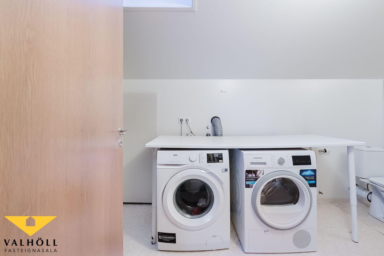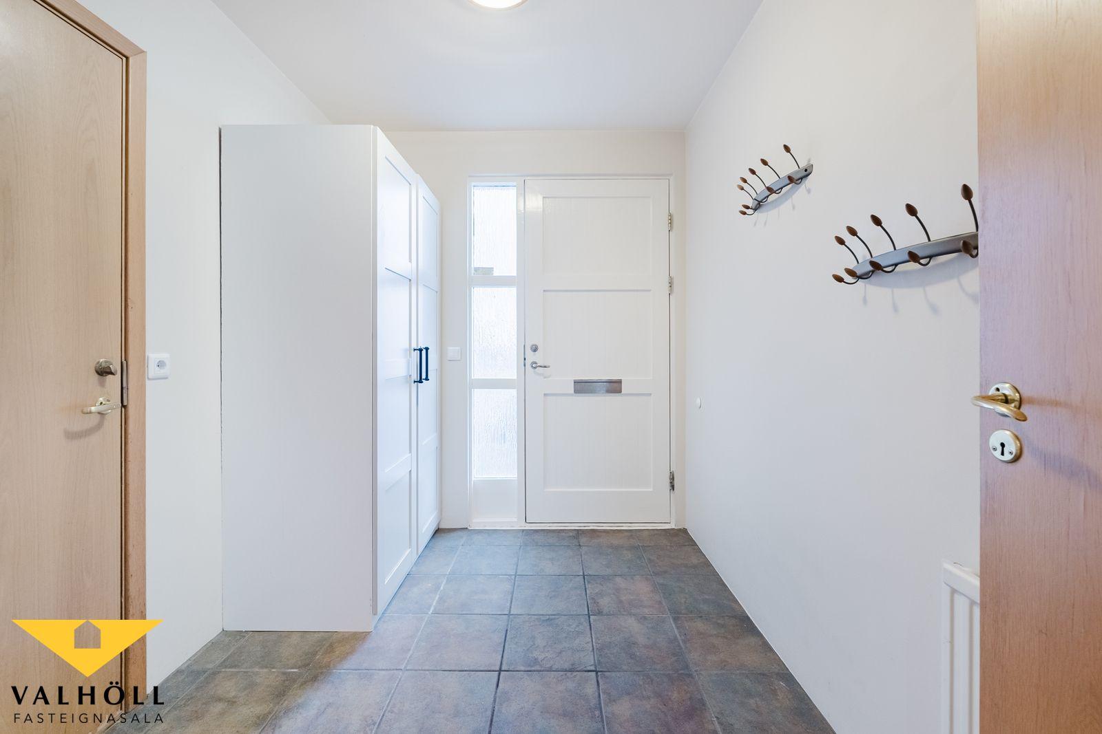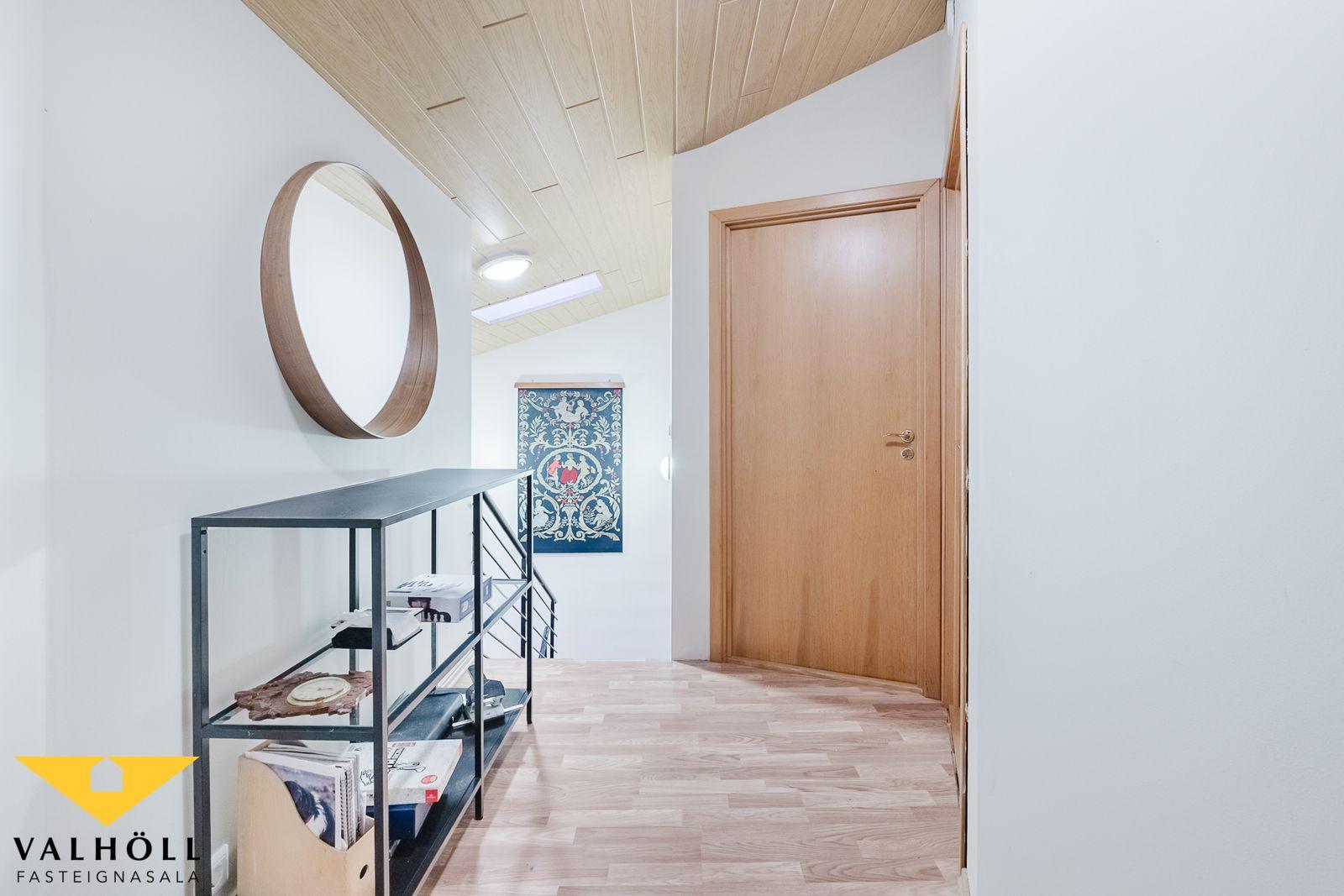 JARÐHÆÐ: Forstofa með hvítum fulninga skáp. Innangengt í bílskúr sem er með hillum og sjálfvirkum opnara. Hol, borðstofa og stofa með útgengt útá góða suður verönd. Geymsluskýli / skúr á endagaflinum, síðan rúmgóður garður. Eldhús með eldri Ikea innréttingu sem komin er á tíma. Hægt að taka niður vegg milli eldhús og borðstofu sem opnar allt rýmið. (hefur verið gert í húsum í lengjunni). Baðherbergi flísalagt með sturtuklefa, upphengdu salerni, innréttingu, handklæðaofni og gólfhita. Rúmgott hjónaherbergi með hvítlökkuðum skápum. Timbrustigi milli hæða úr Límtré. 2.HÆÐ: Gangur. 3 svefnherbergi, skápur í einu þeirra. Úgengt úr einu herberginu á norður svalir með glæsilegu útsýni (Esjan, Akrafjall, Geldinganes, Sundin og fl.) Þvottaherbergi og snyrting í sama herbergi með velux glugga. þar innaf er svo ca 30 fm súðargeymsla. Gólfefni: Flísar á forstofu og baðherbergi. Plastparket á öðrum gólfum. Góð ruslatunnugeymsla við innganginn. Lagt fyrir rafhleðslustöð. Hellulagt bílaplan með hita og alls um 5 bílastæði við húsið og í enda götu.