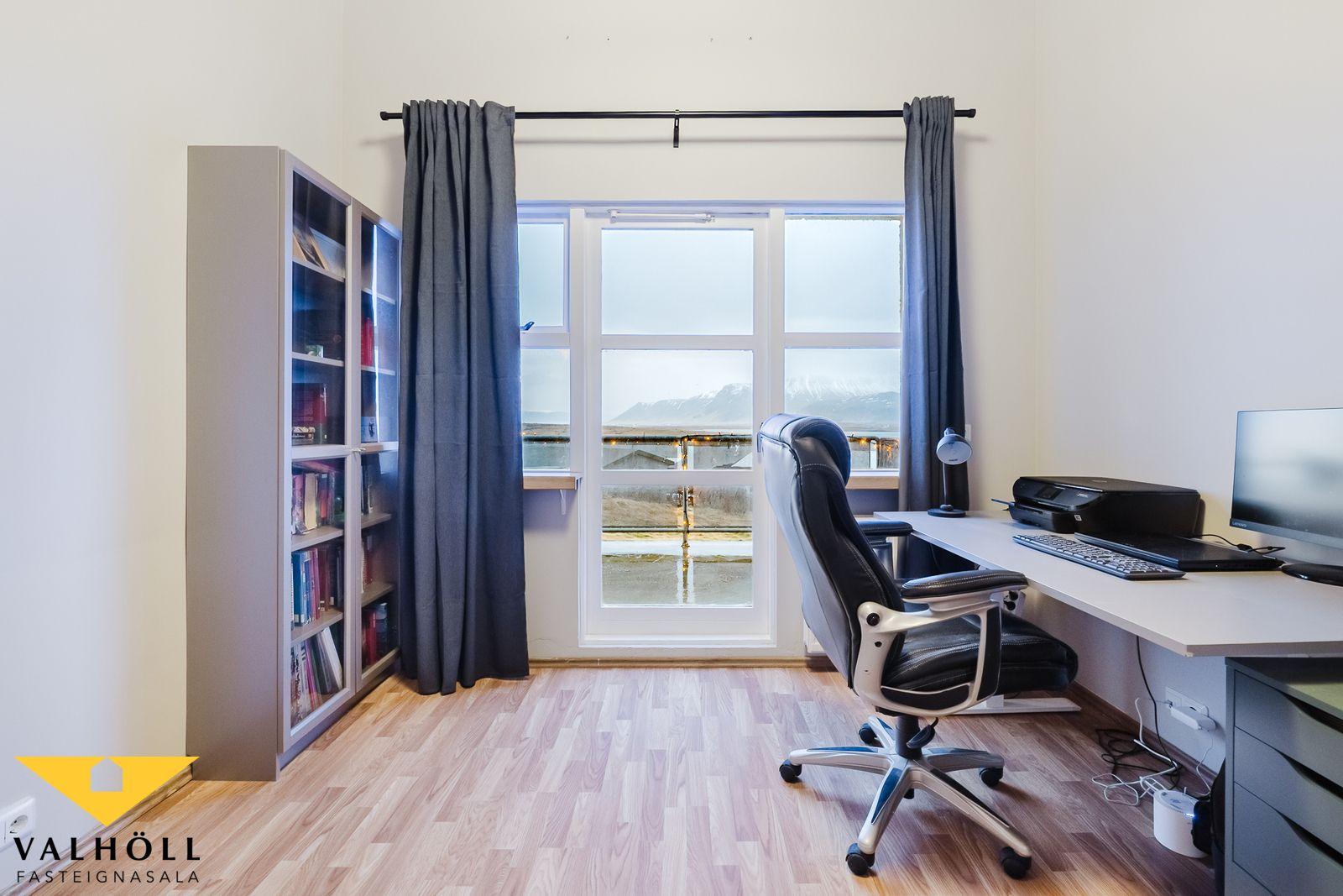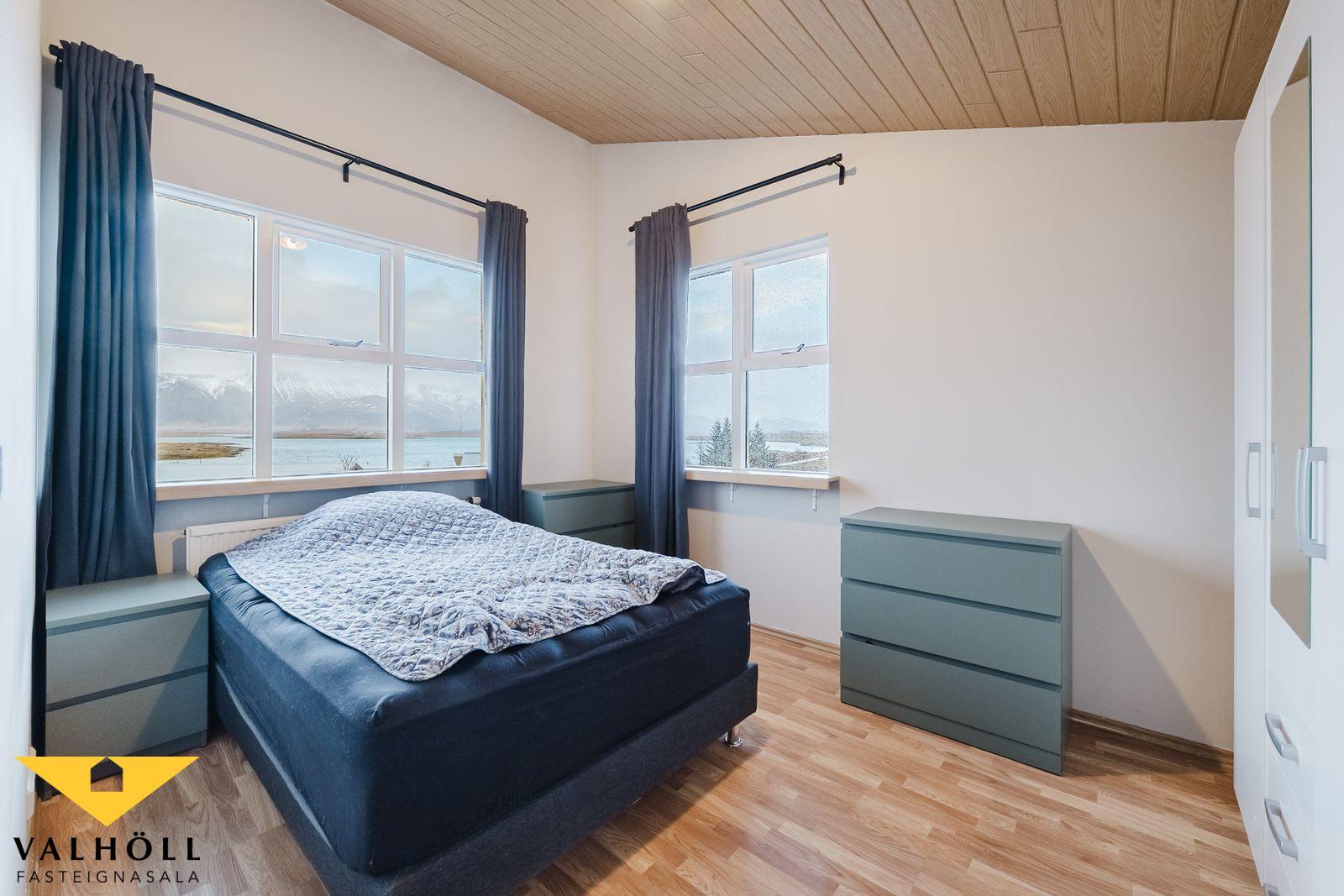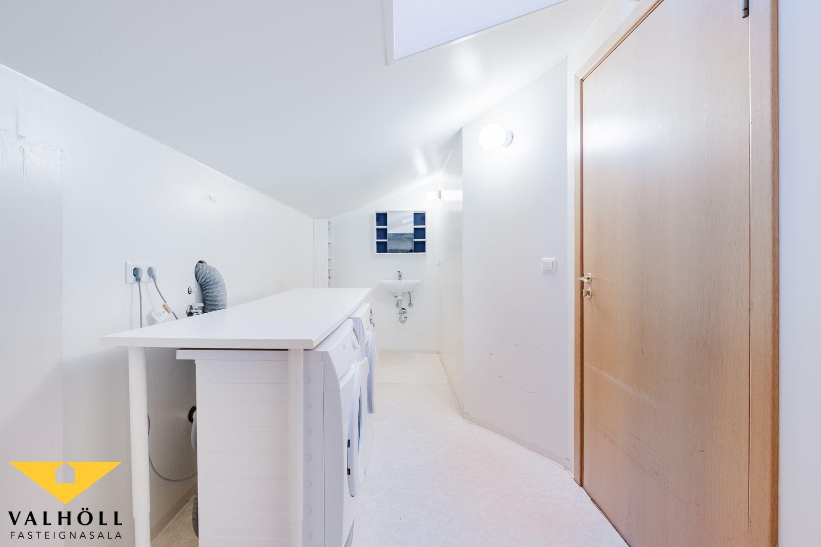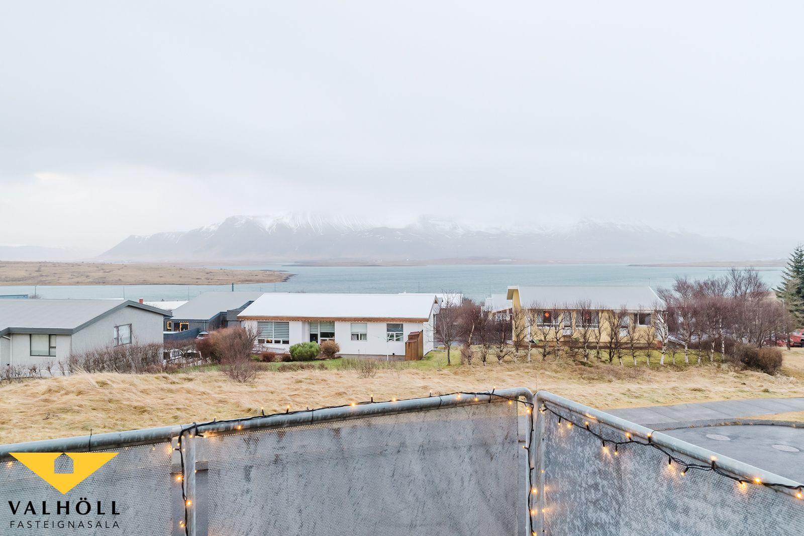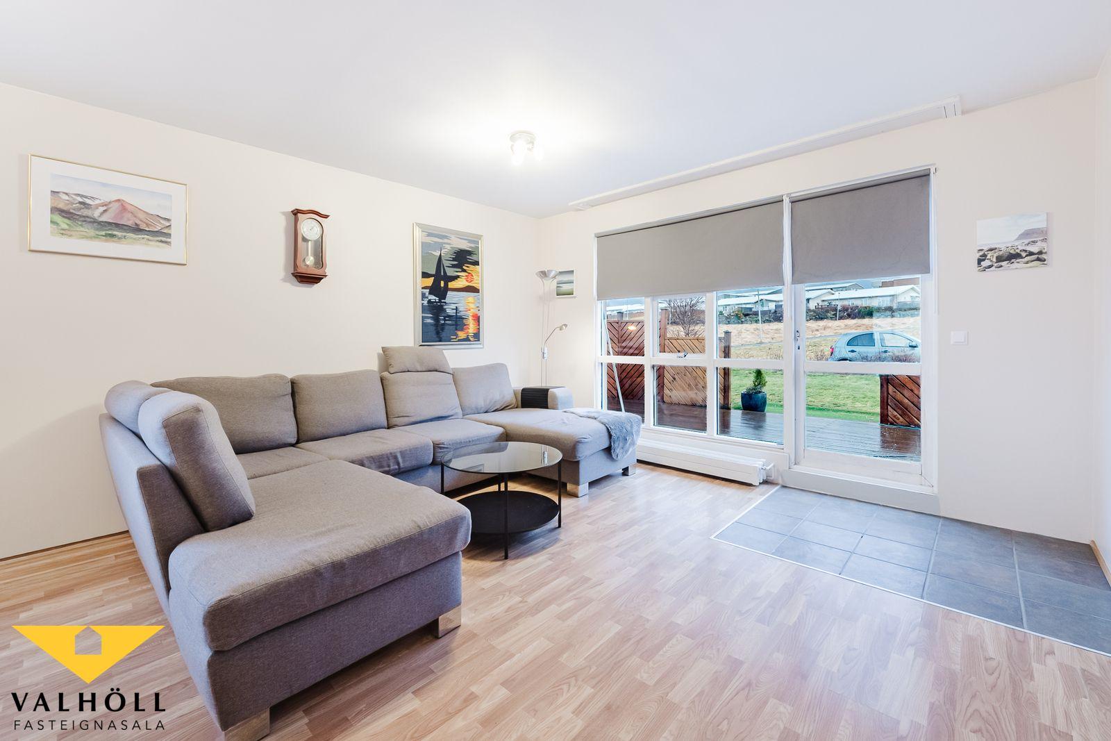JARÐHÆÐ: Forstofa með hvítum fulninga skáp. Innangengt í bílskúr sem er með hillum og sjálfvirkum opnara. Hol, borðstofa og stofa með útgengt útá góða suður verönd. Geymsluskýli / skúr á endagaflinum, síðan rúmgóður garður. Eldhús með eldri Ikea innréttingu sem komin er á tíma. Hægt að taka niður vegg milli eldhús og borðstofu sem opnar allt rýmið. (hefur verið gert í húsum í lengjunni). Baðherbergi flísalagt með sturtuklefa, upphengdu salerni, innréttingu, handklæðaofni og gólfhita. Rúmgott hjónaherbergi með hvítlökkuðum skápum. Timbrustigi milli hæða úr Límtré. 2.HÆÐ: Gangur. 3 svefnherbergi, skápur í einu þeirra. Úgengt úr einu herberginu á norður svalir með glæsilegu útsýni (Esjan, Akrafjall, Geldinganes, Sundin og fl.) Þvottaherbergi og snyrting í sama herbergi með velux glugga. þar innaf er svo ca 30 fm súðargeymsla. Gólfefni: Flísar á forstofu og baðherbergi. Plastparket á öðrum gólfum. Góð ruslatunnugeymsla við innganginn. Lagt fyrir rafhleðslustöð. Hellulagt bílaplan með hita og alls um 5 bílastæði við húsið og í enda götu.
