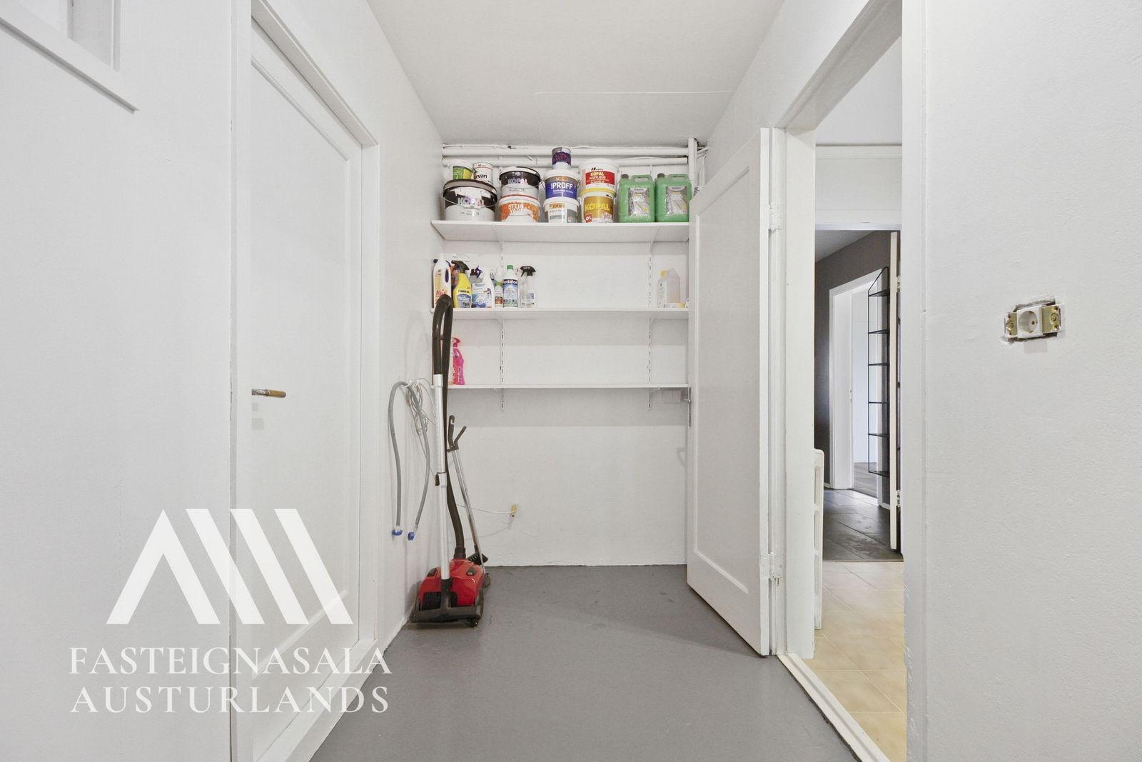 Þvottahús: Steypt fólf sem málað hefur verið með vatnsþéttri málningu. Ágætis rými með hilluplássi. Inn af þvottahúsi er aðgengi að geymslu/sameign og þaðan er einnig útgengt til norðurs.