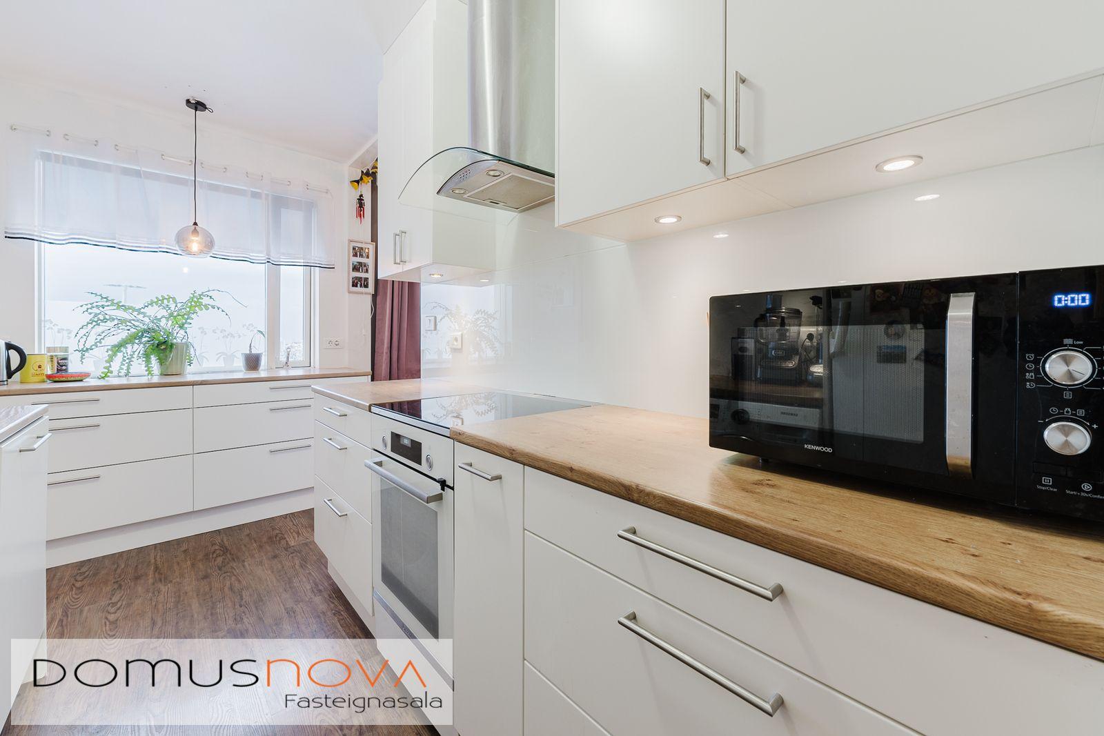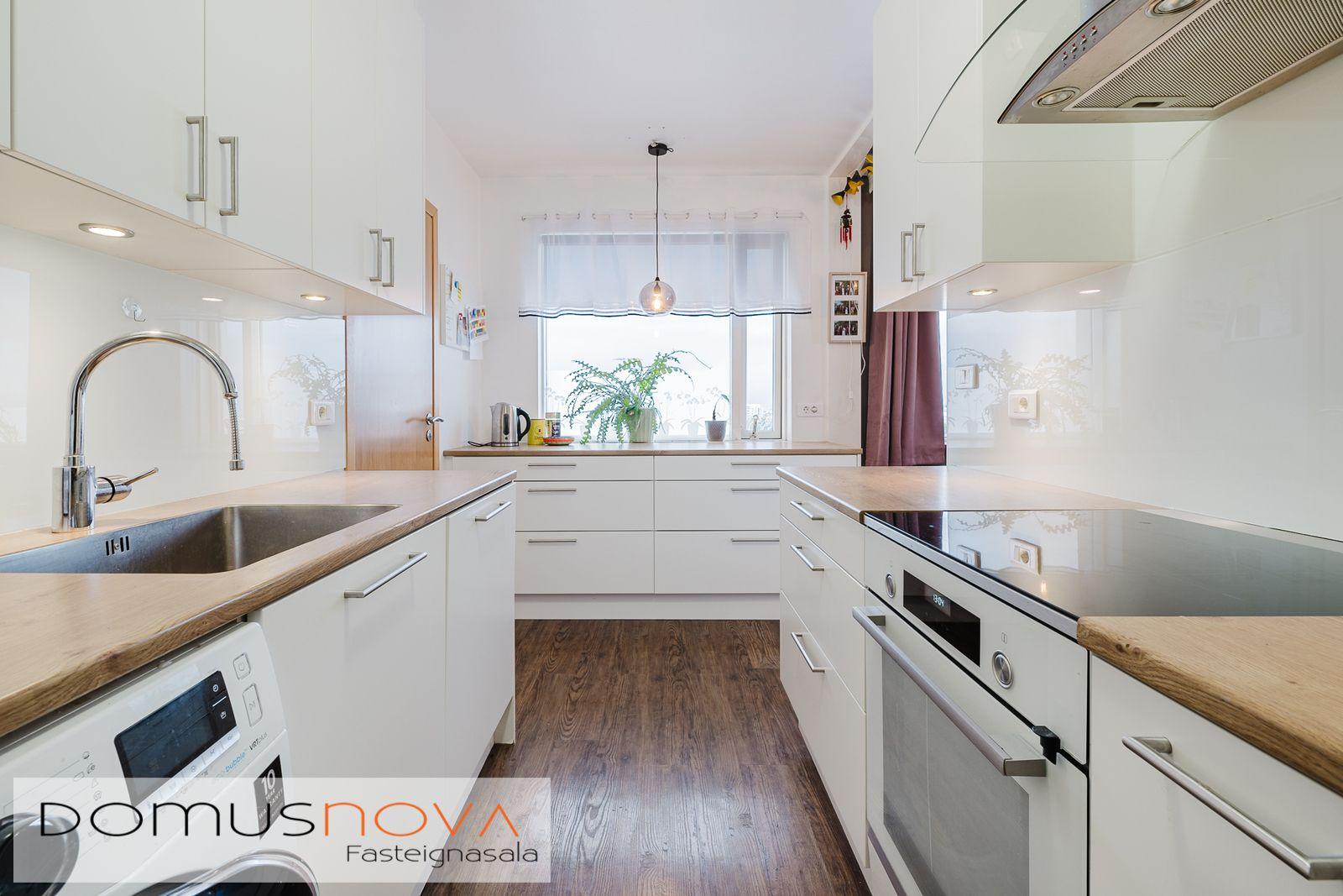 Eldhús - rúmgóð innrétting , helluborð, ofn og vifta parket á gólfi.