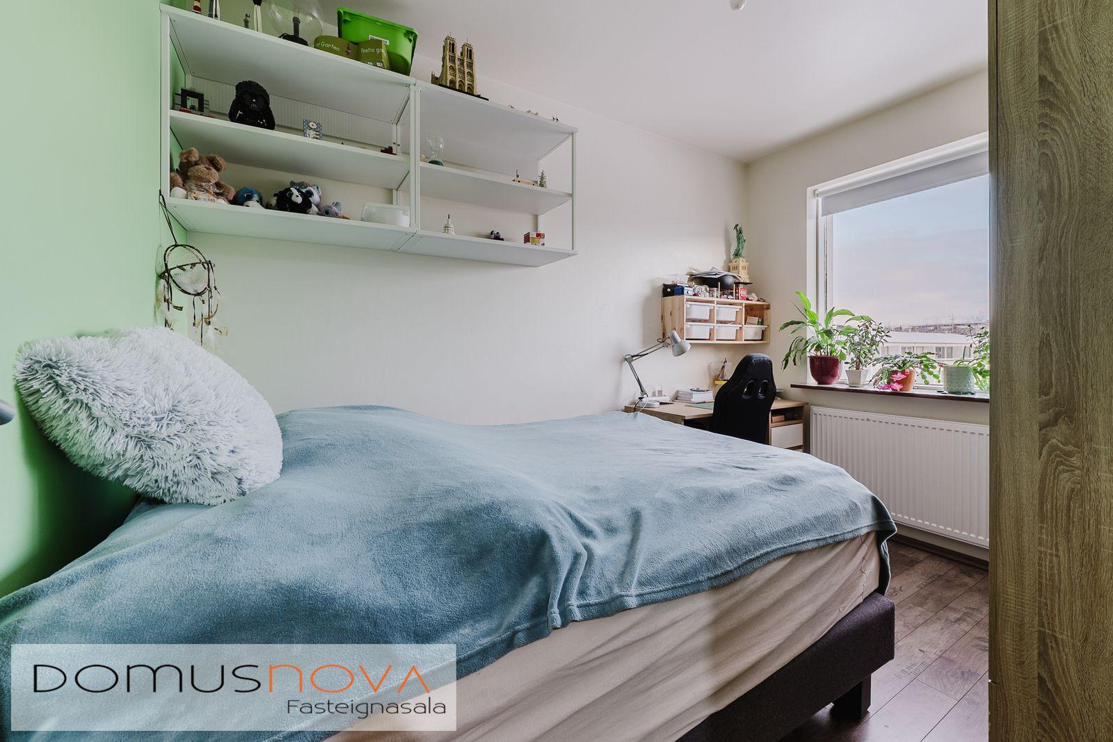Hjónaherbergi - bjart og rúmgott, fataskápur og parket er á gólfi.