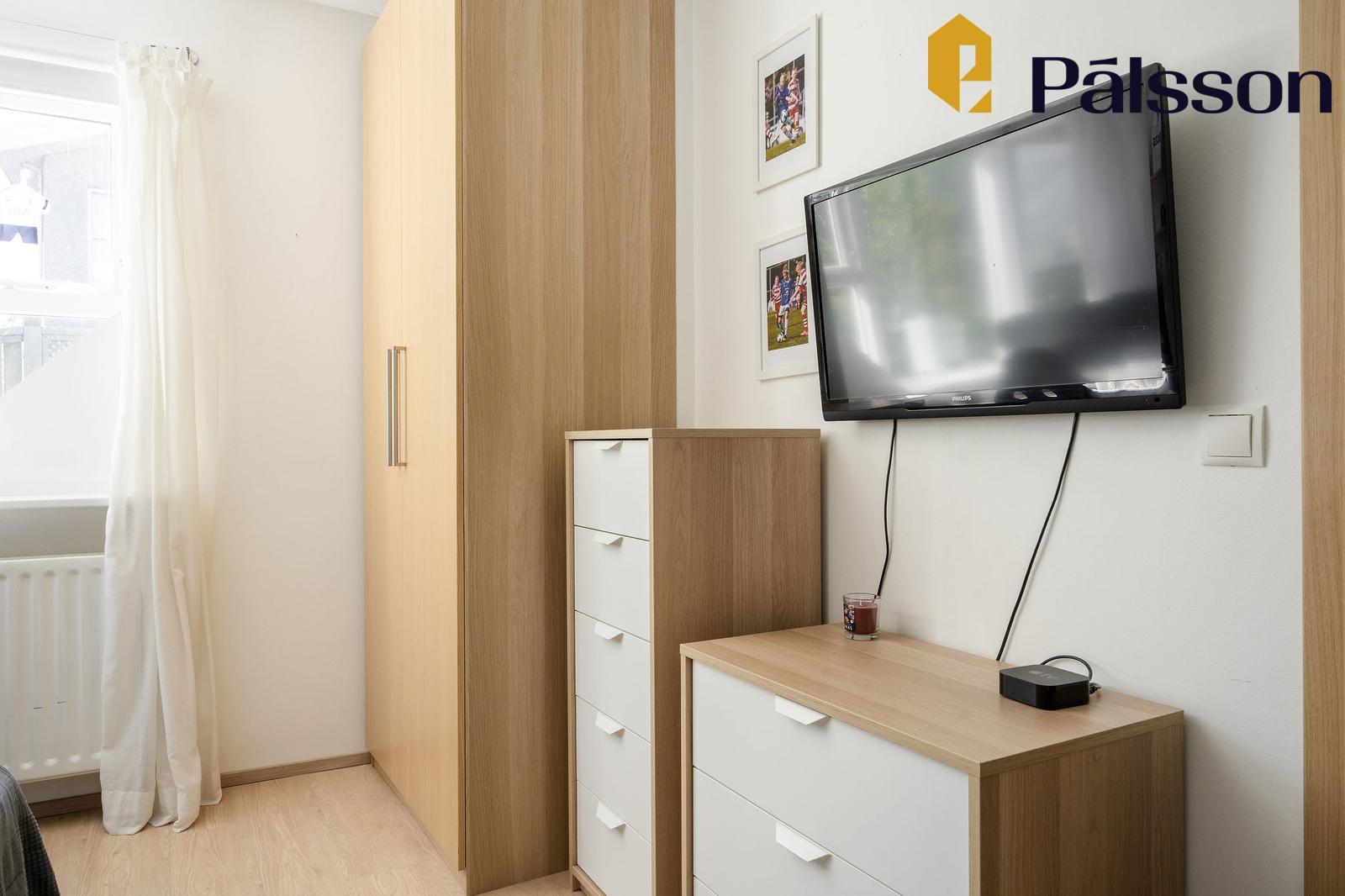 Svefnherbergi V er rúmgott með góðum glugga og fataskáp. Parket á gólfum.