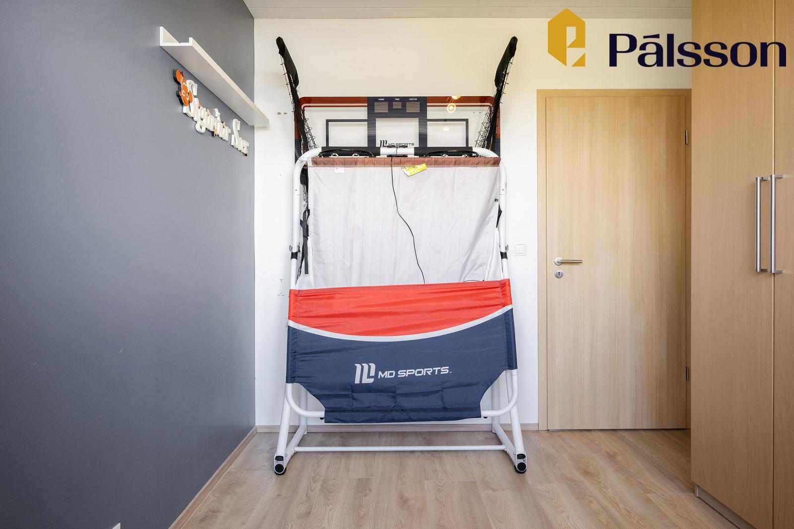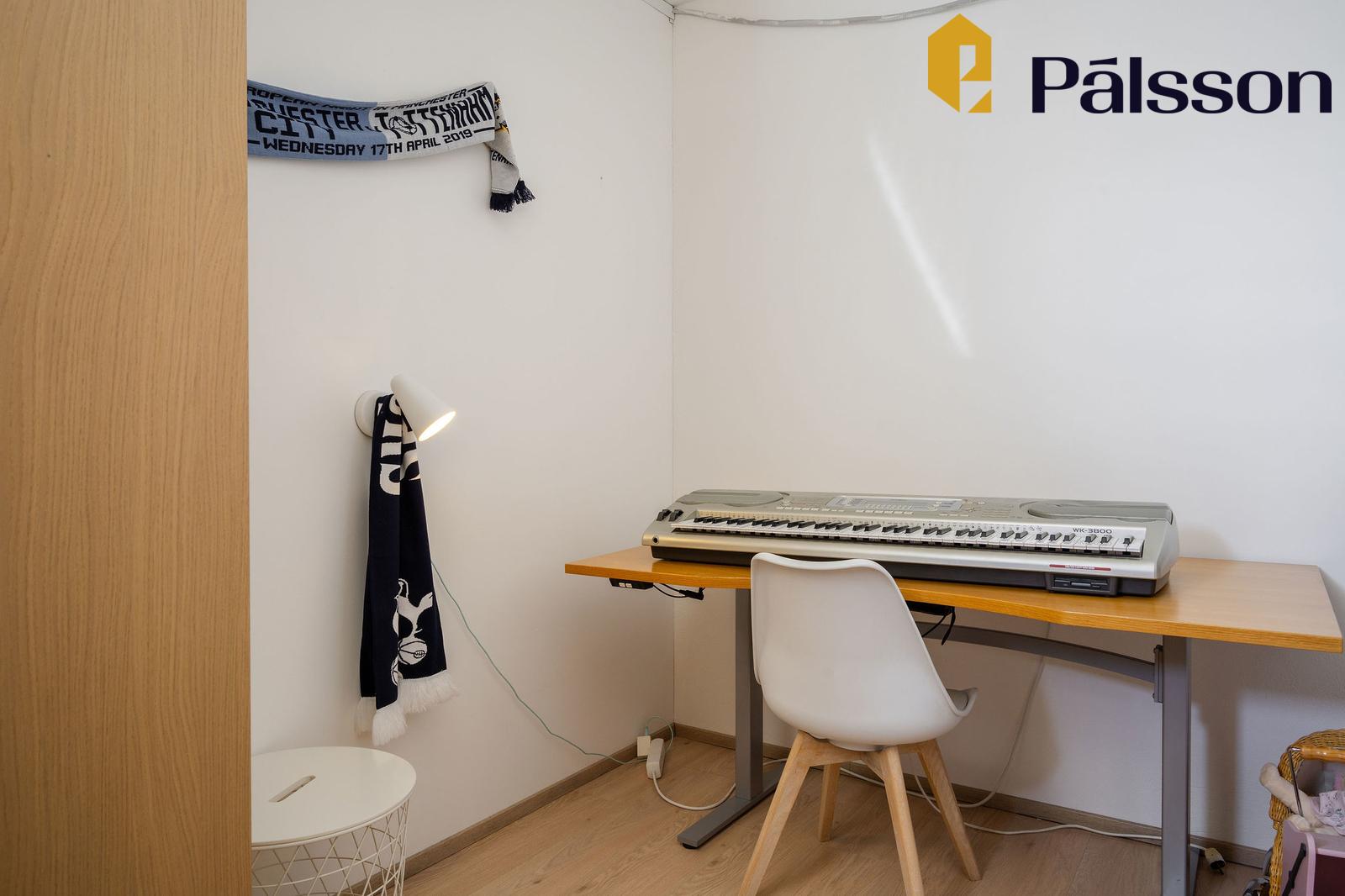 Svefnherbergi I er rúmgott með góðum fataskáp. Geymsluloft. Parket á gólfum