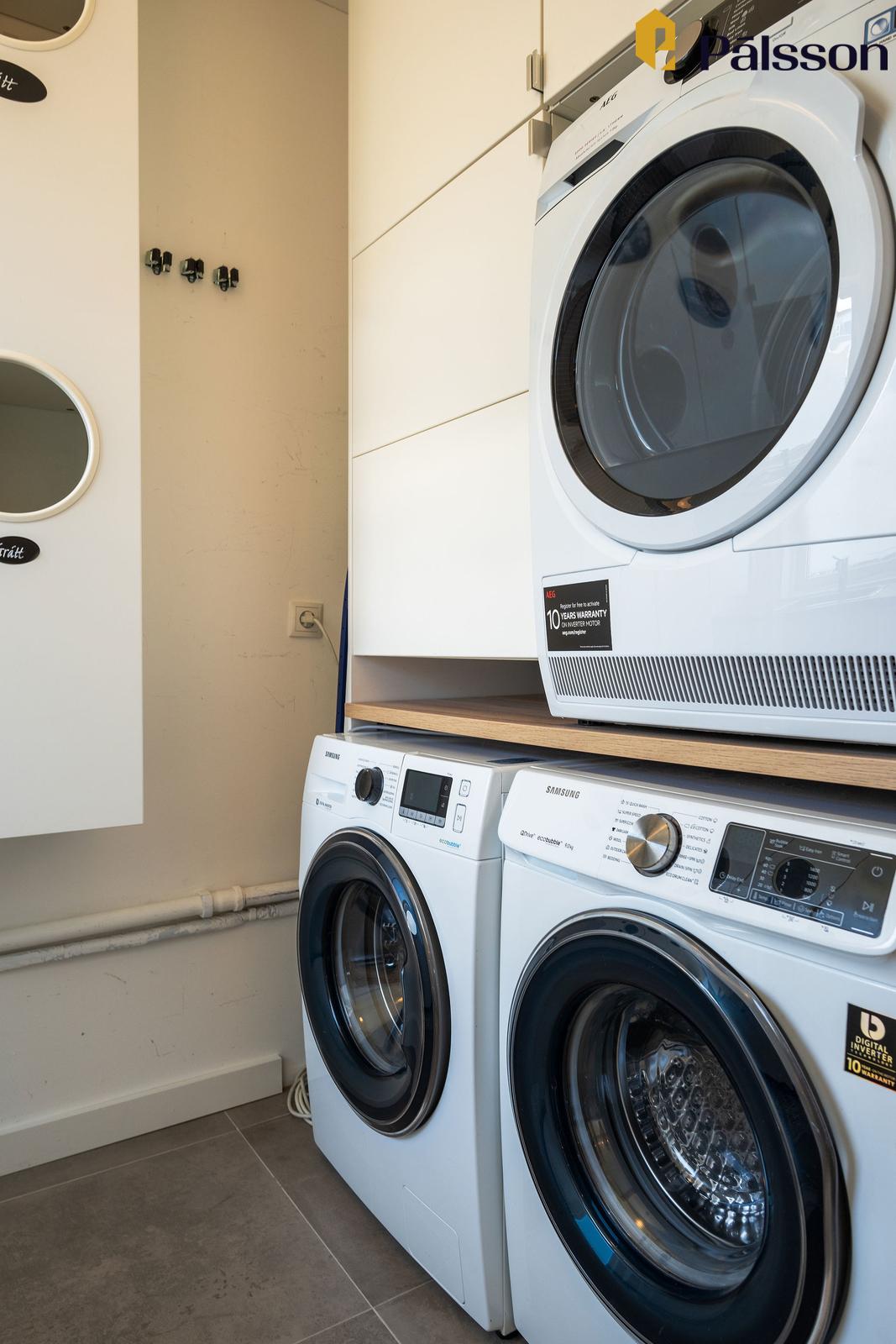 Þvottahús er inn af eldhúsi með góðum hirslum, innréttingu með plássi fyrir tvær þvottavélar og þurrkara, vaskur og blöndunartæki. Flísar á gólfum.
